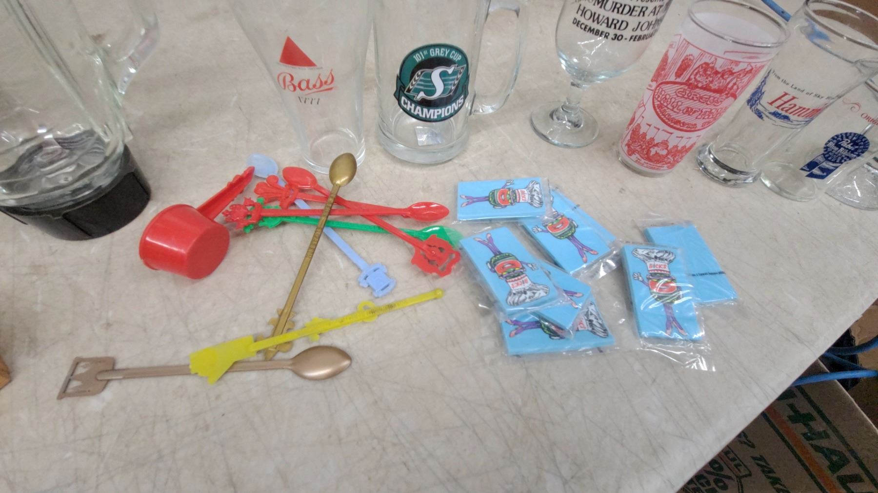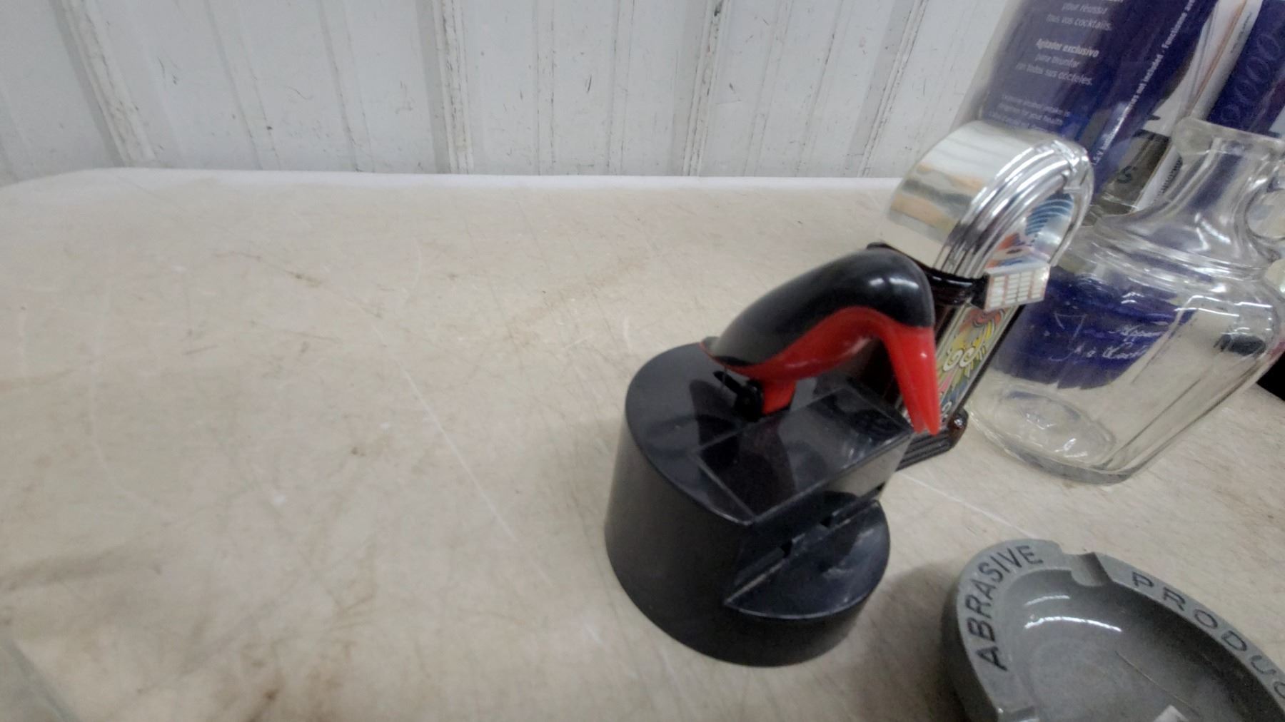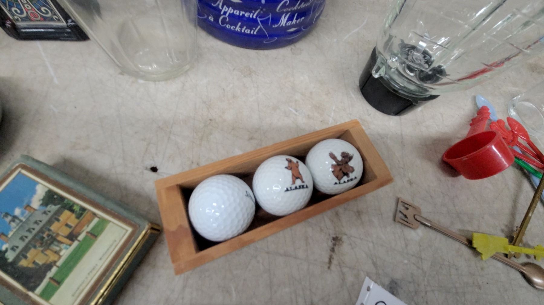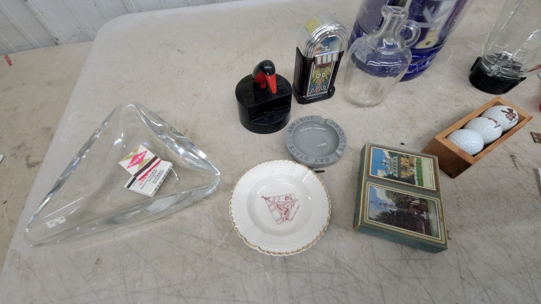 Krups Blender, Assorted Glassware, Ashtrays, Golf Balls, Decorative Plate, Playing Cards, Duck Cig.