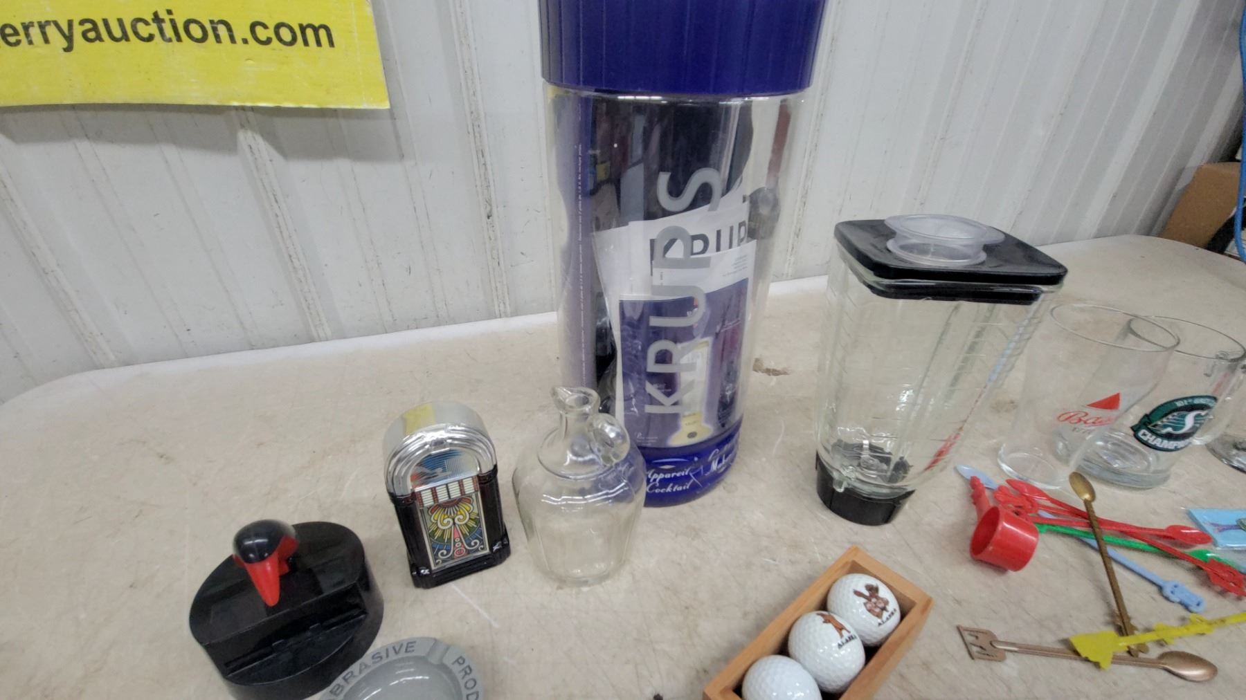 Lot 489 Krups Blender, Assorted Glassware, Ashtrays, Golf Balls, Decorative Plate, Playing Cards, Duck Cig.
