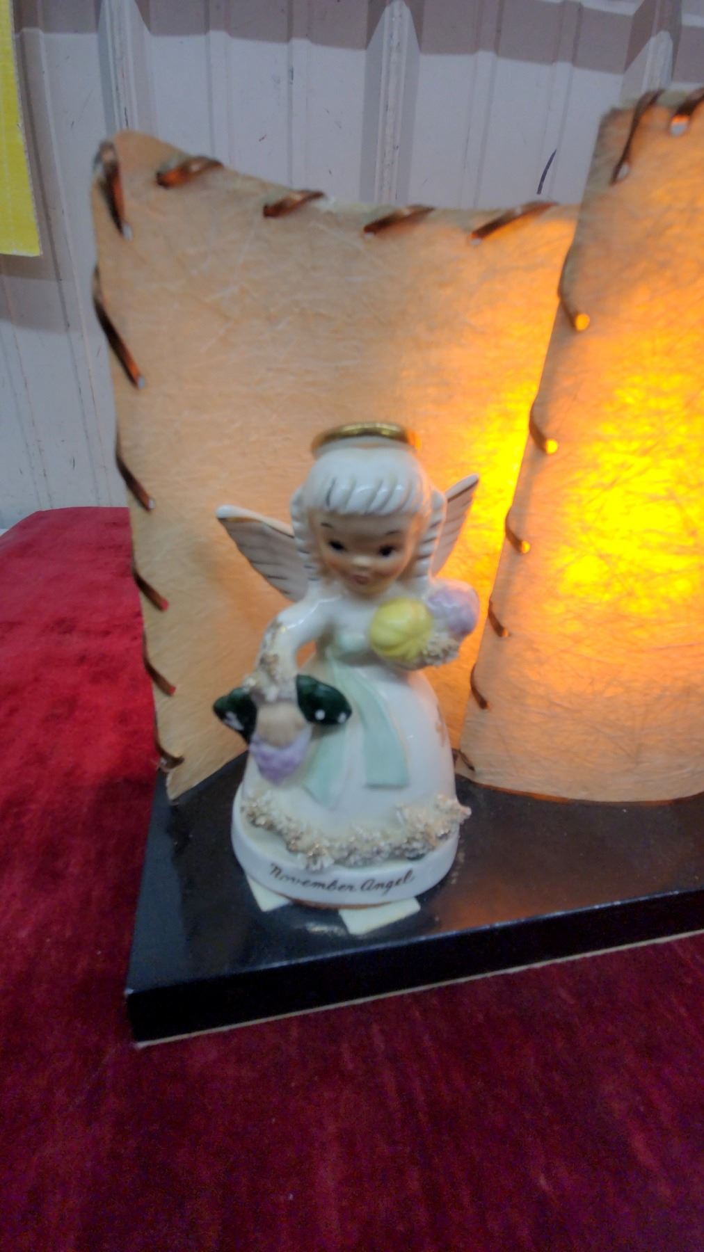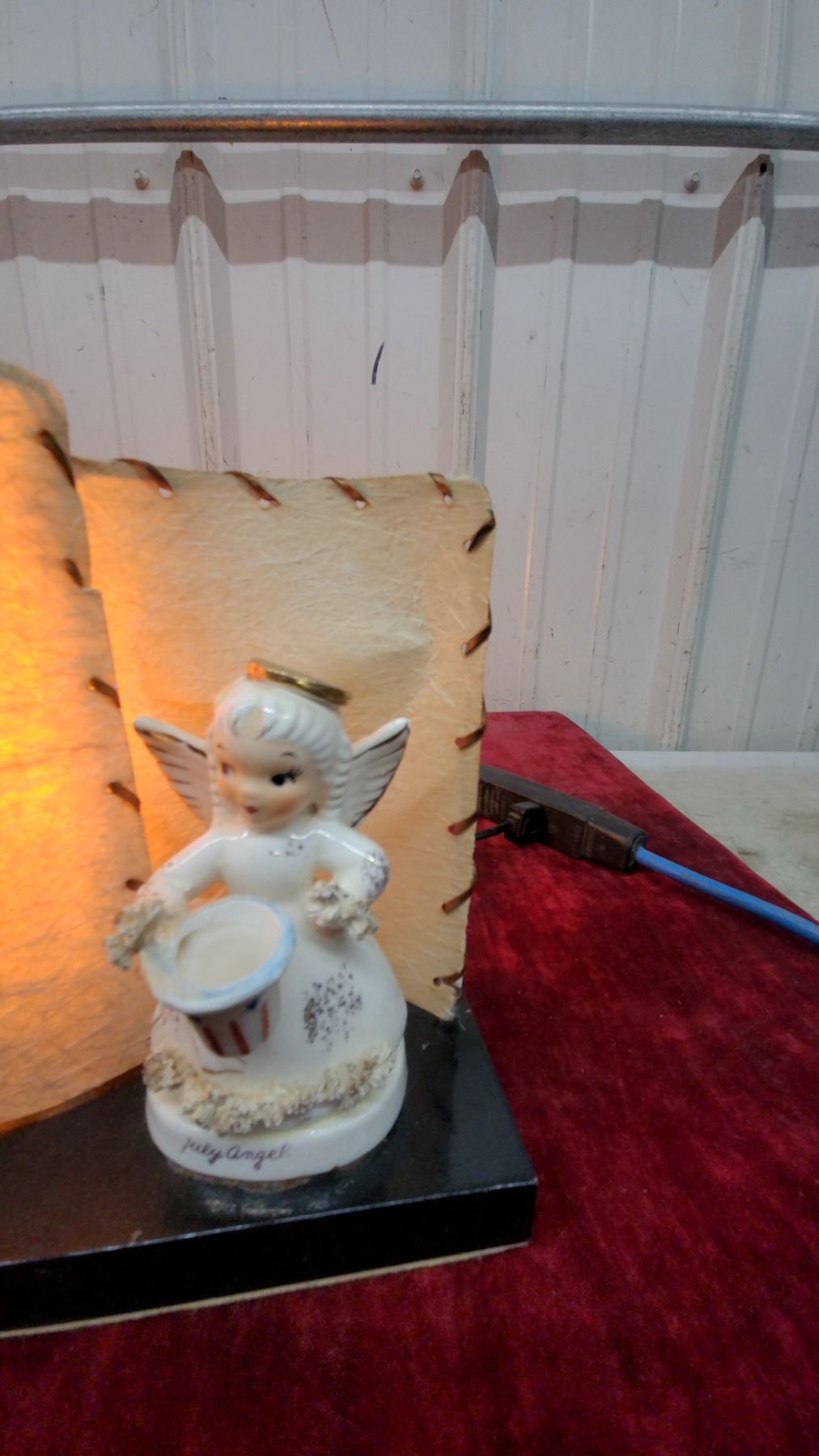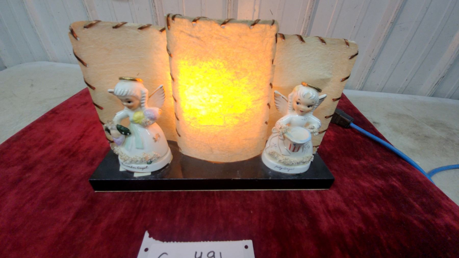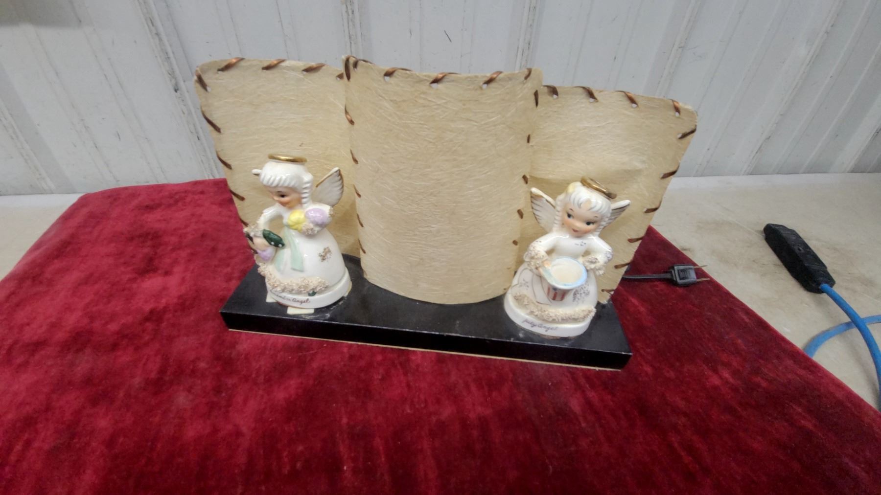 Lot 491 Vintage Table Lamp with Fiberglass Shade and Two Porcelain Angel Figurines (November & July Angels)