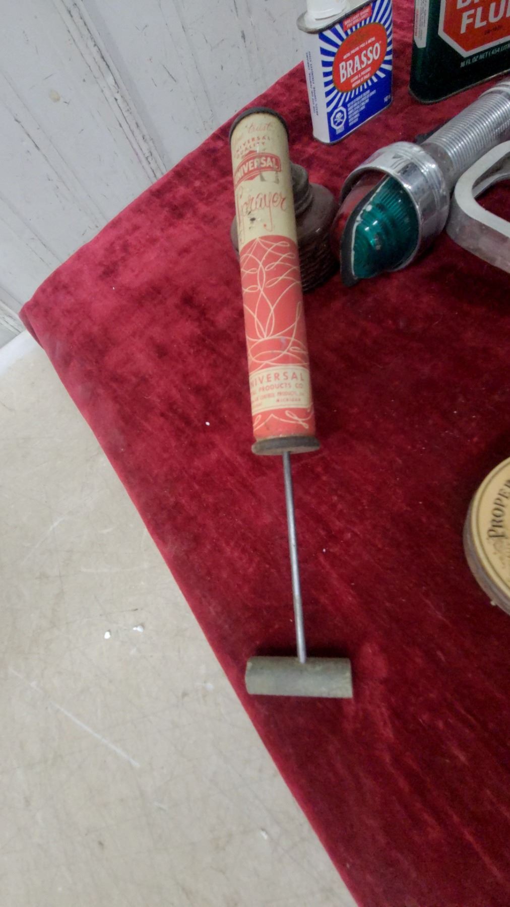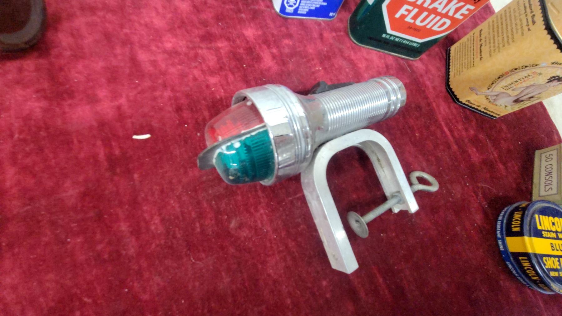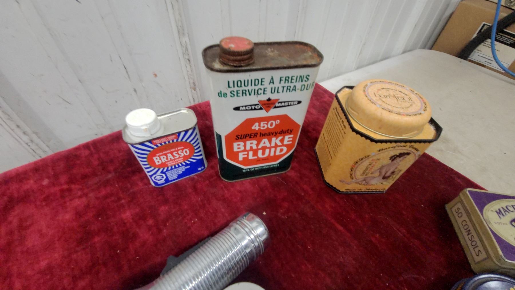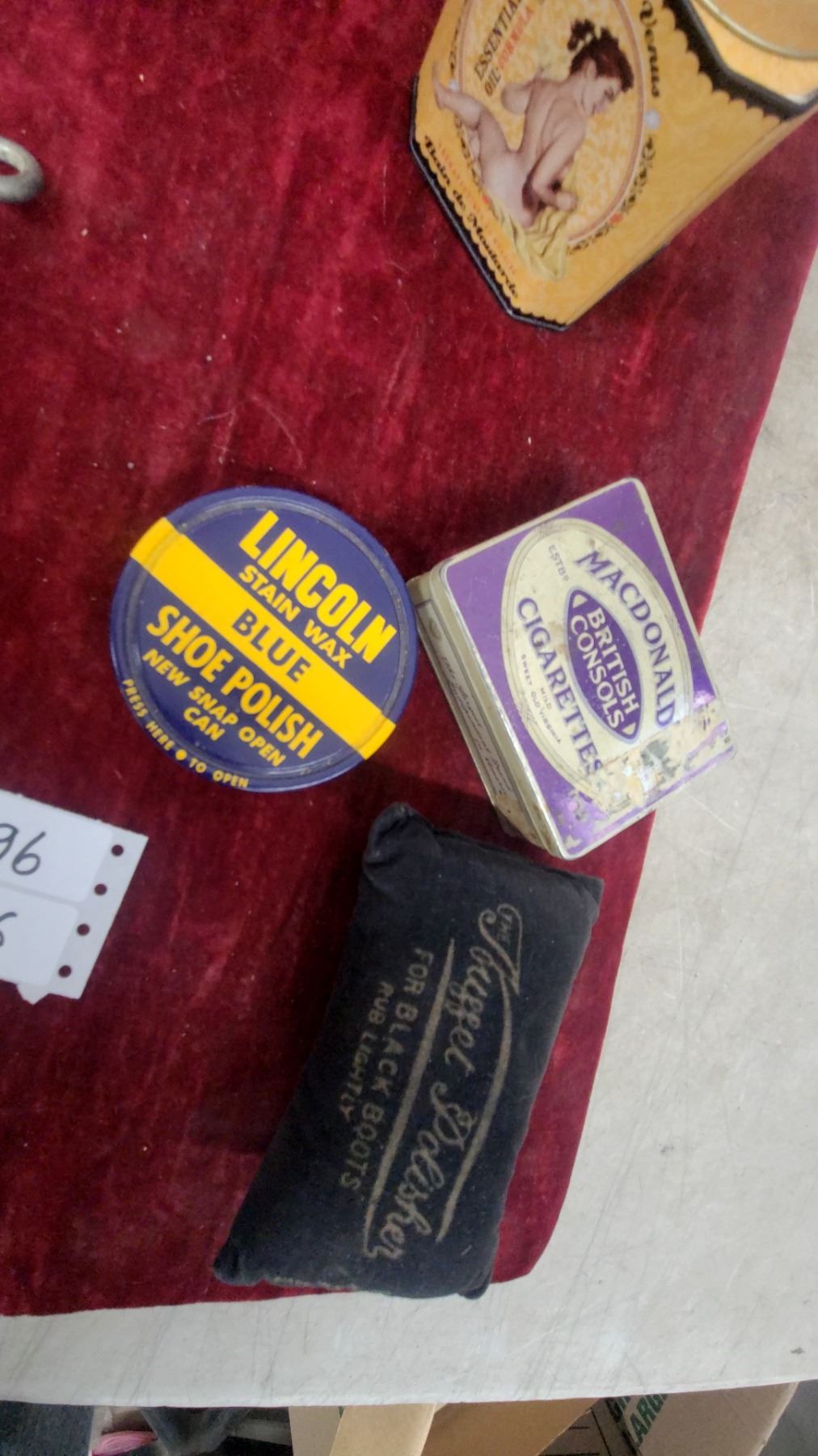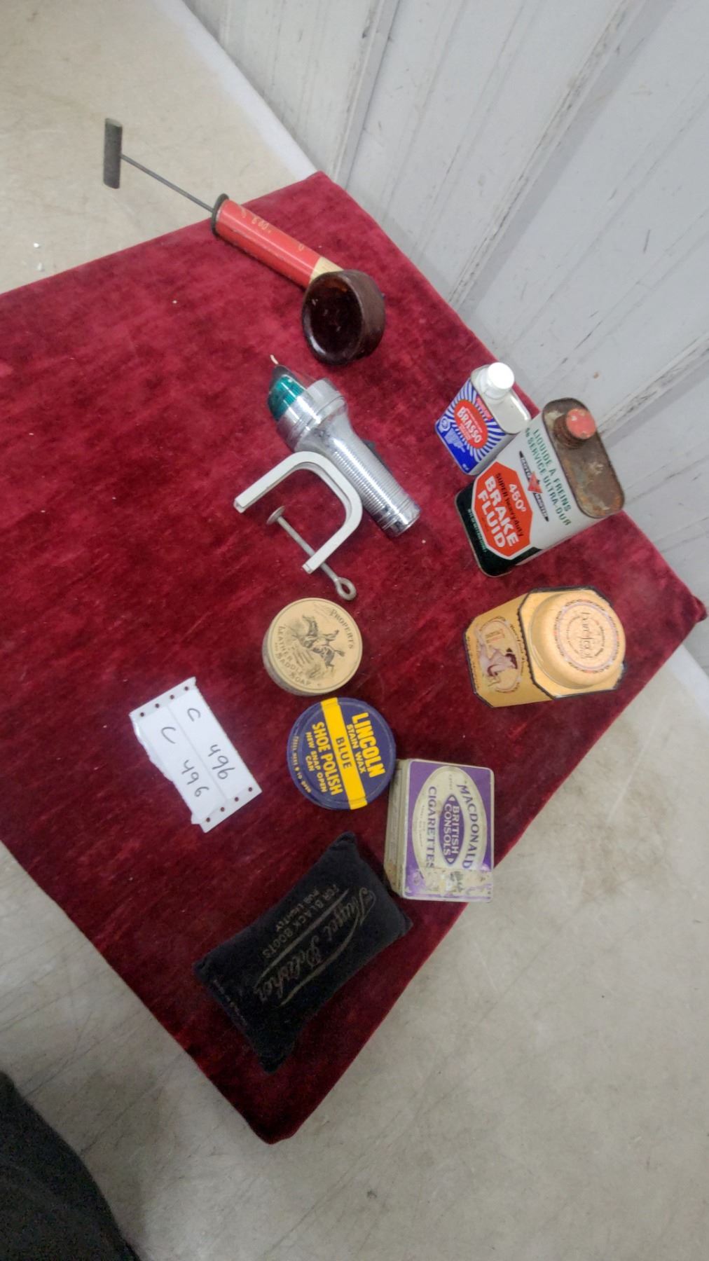 Lot 496 Vintage Lot: Propert's Saddle Soap, Lincoln Shoe Polish, Brasso, Boat Light, Macdonald Cigarette