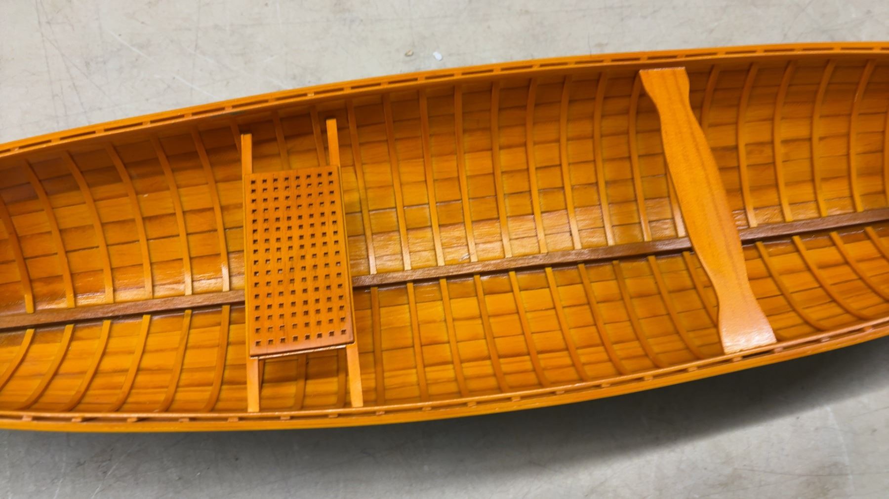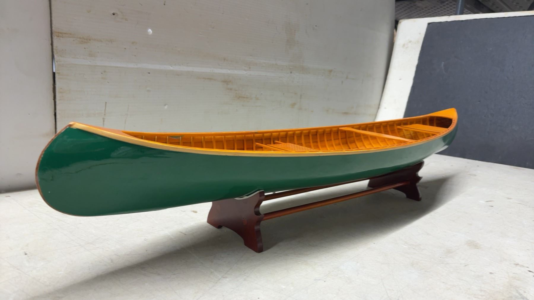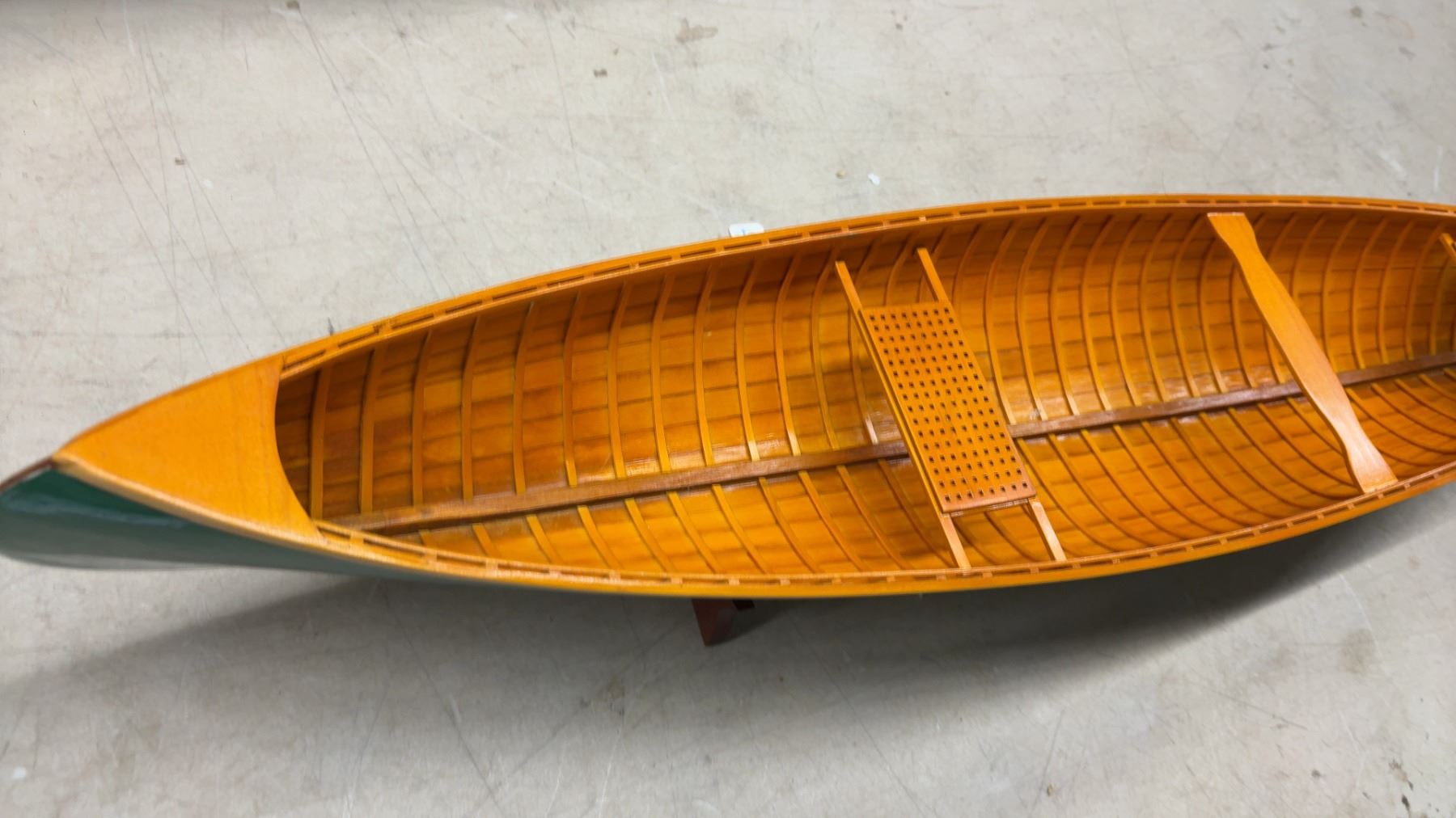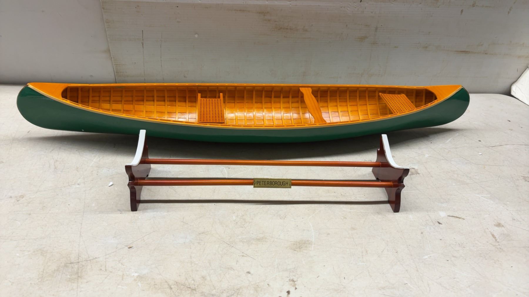 Lot 506 Peterborough Wooden Canoe Model with Display Stand and Two Paddles, Green Hull, Natural Interior