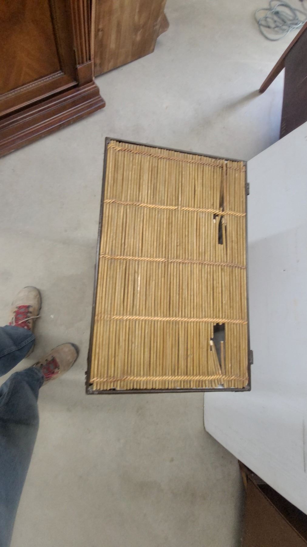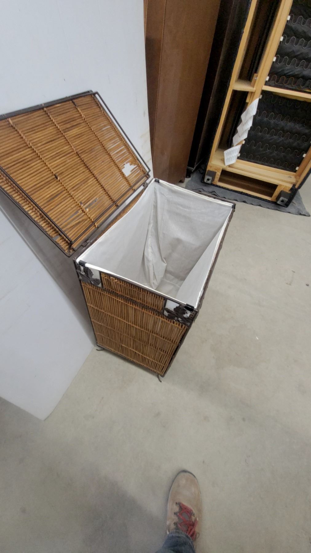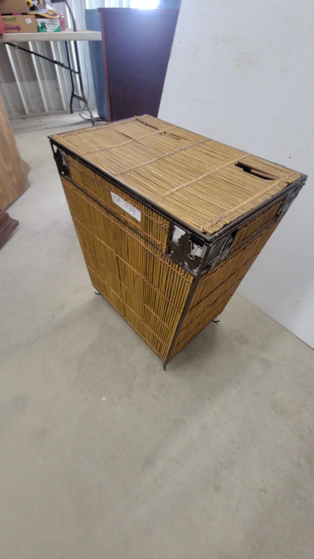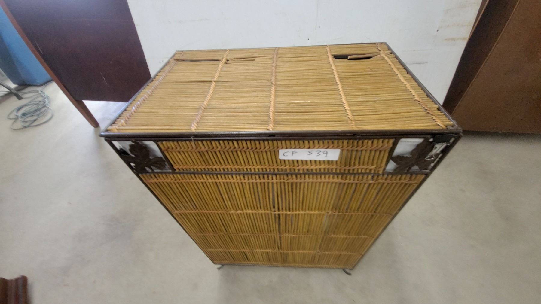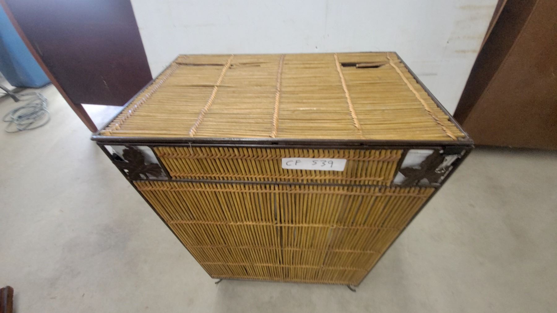 Lot 539 Wicker and Metal Frame Laundry Hamper with Hinged Lid and Decorative Corner Accents 25 x 20 x 13"