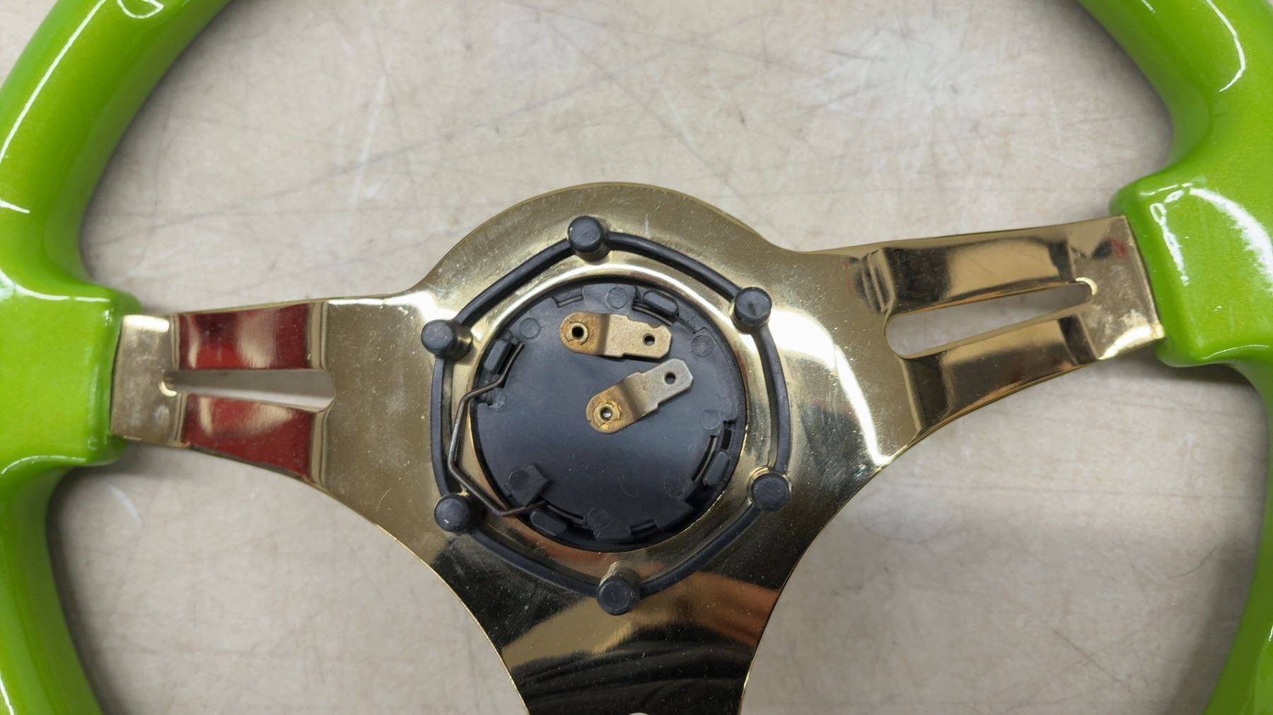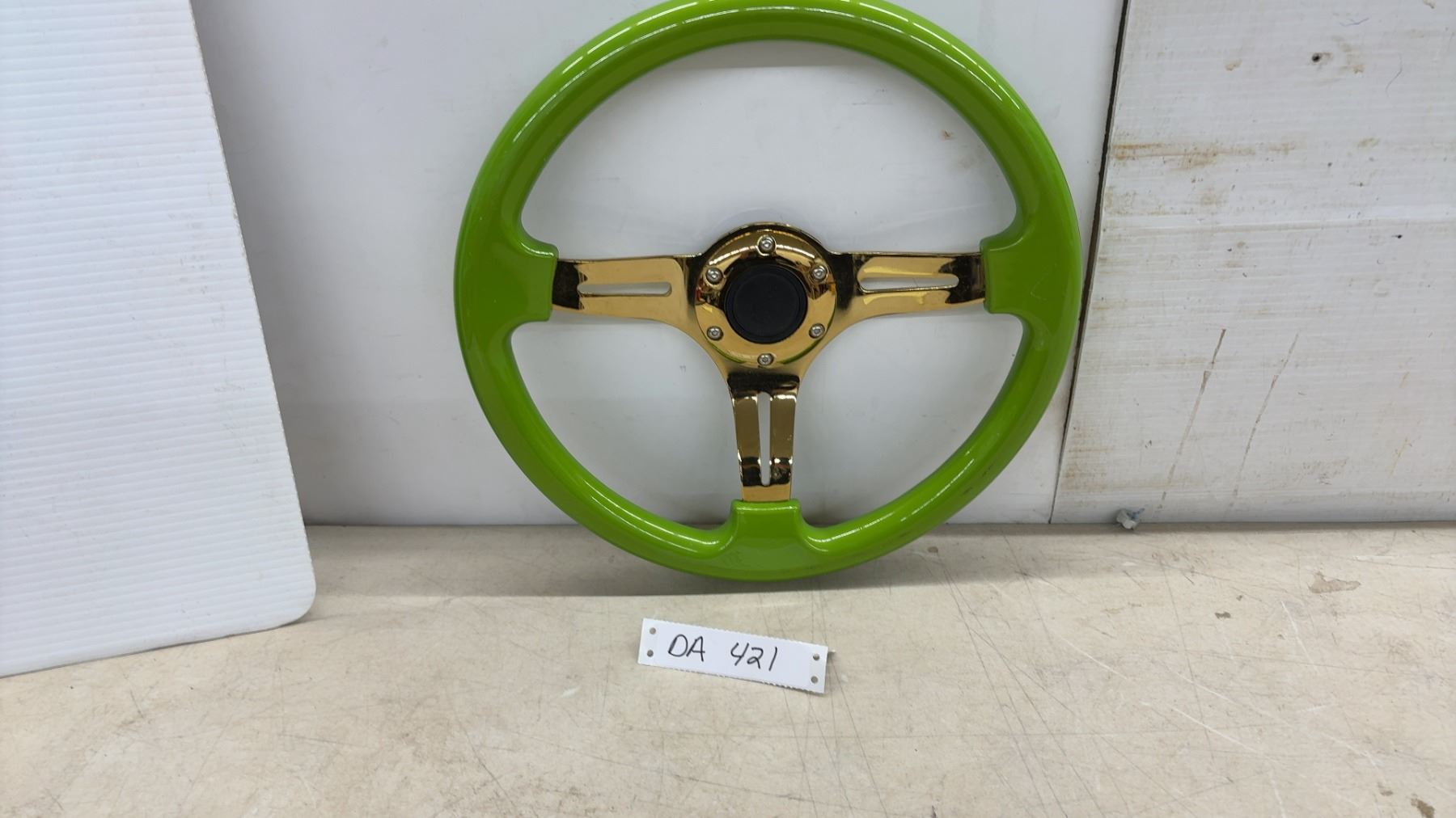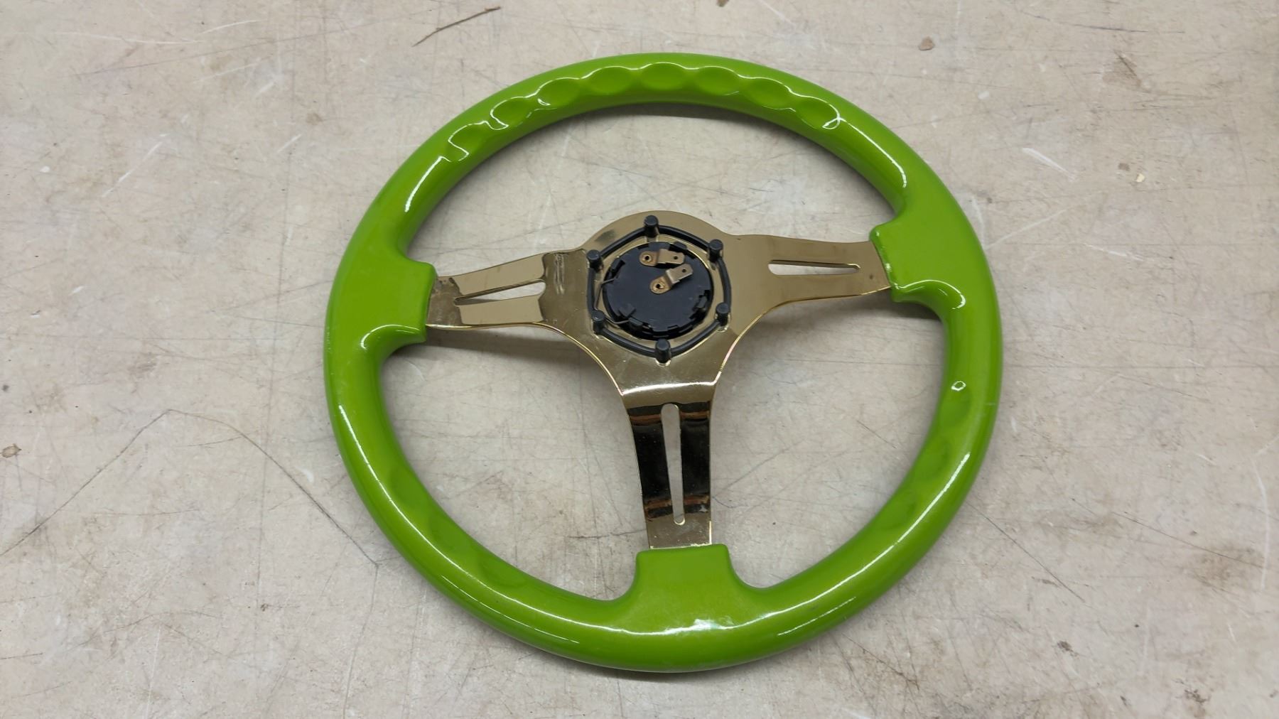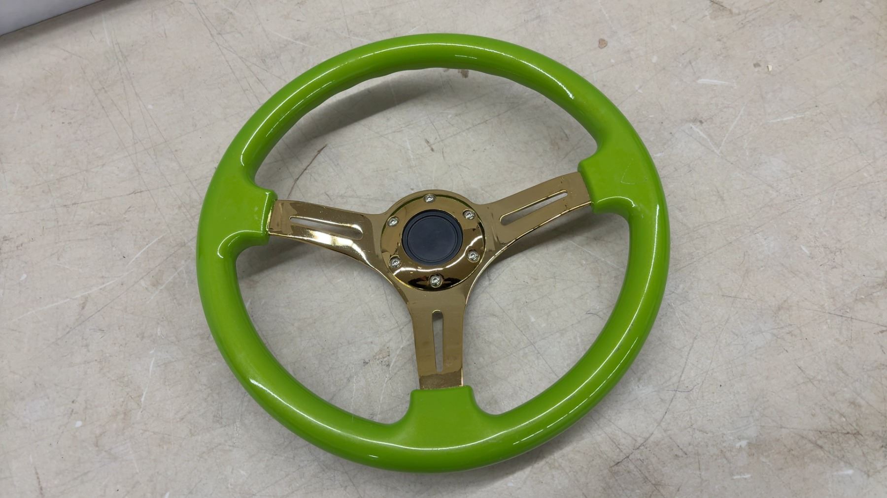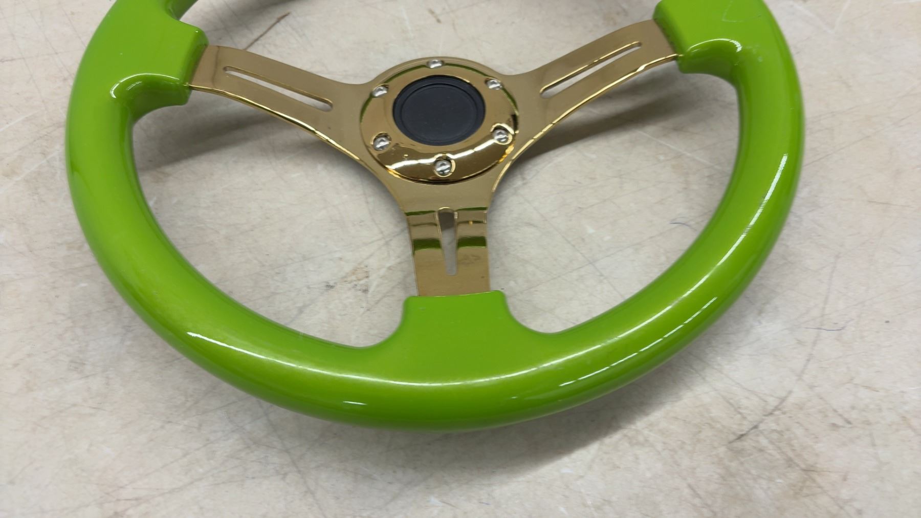 Lot 421 Aftermarket Steering Wheel, Lime Green Rim with Gold Chrome 3-spoke Center, 350mm, 6-bolt Pattern