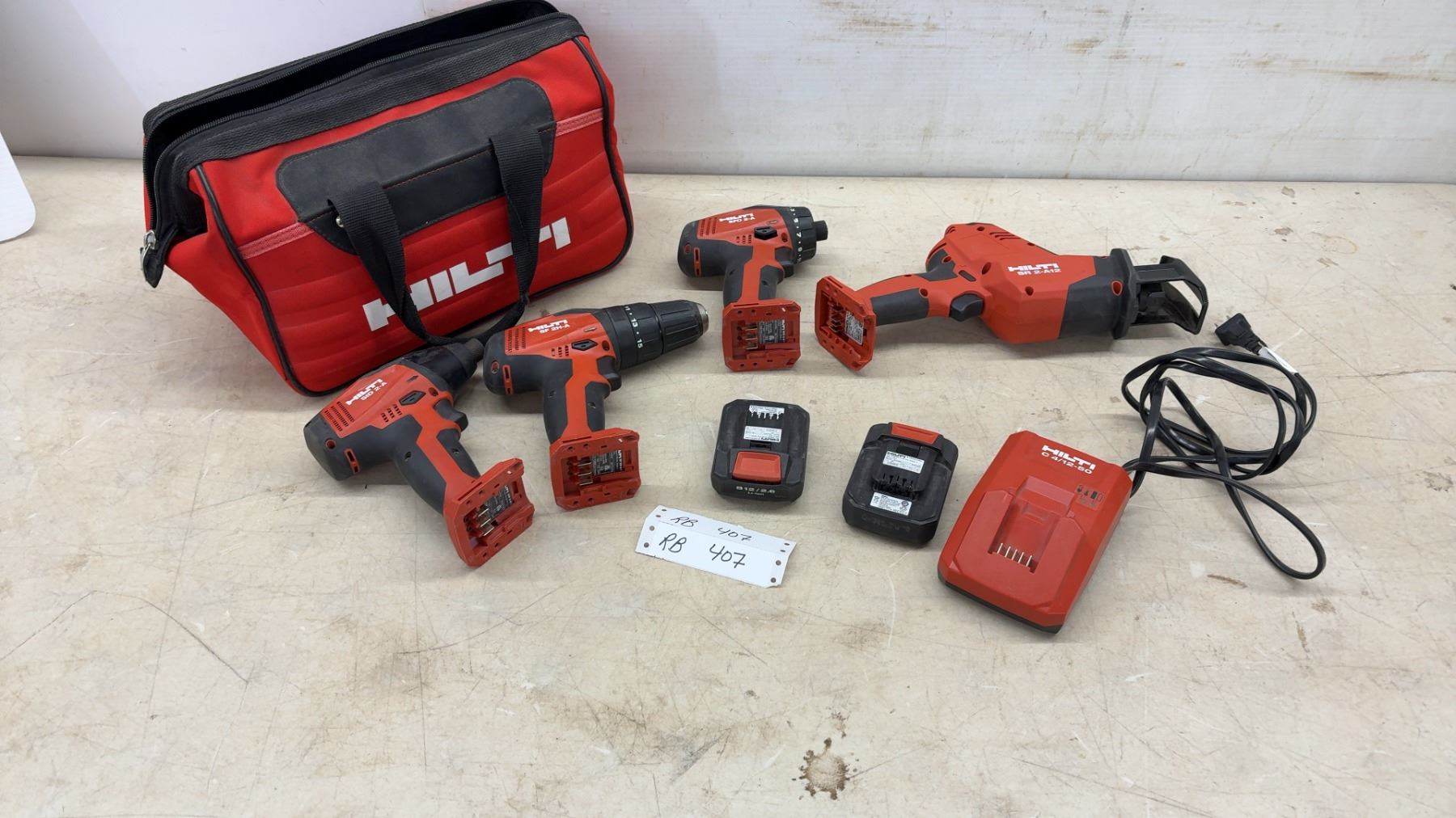 Lot 407 Hilti 12V Cordless Tool Set: Impact, Recip Saw, Drill/Driver, 2 Batteries, Charger & Bag