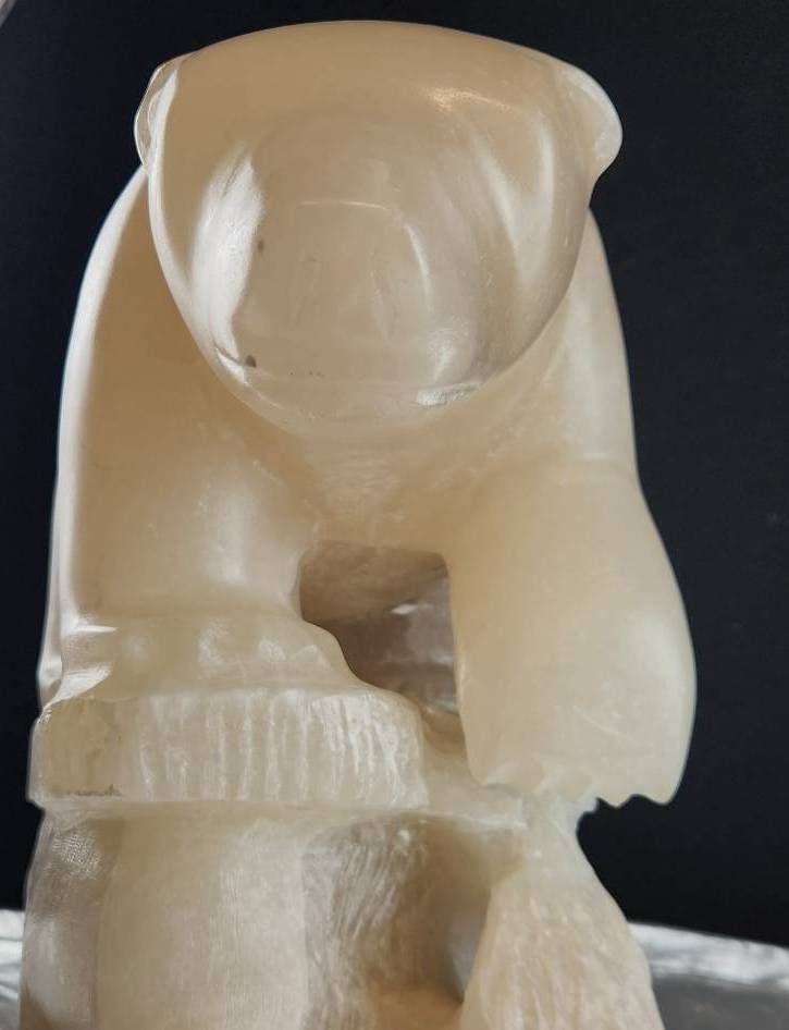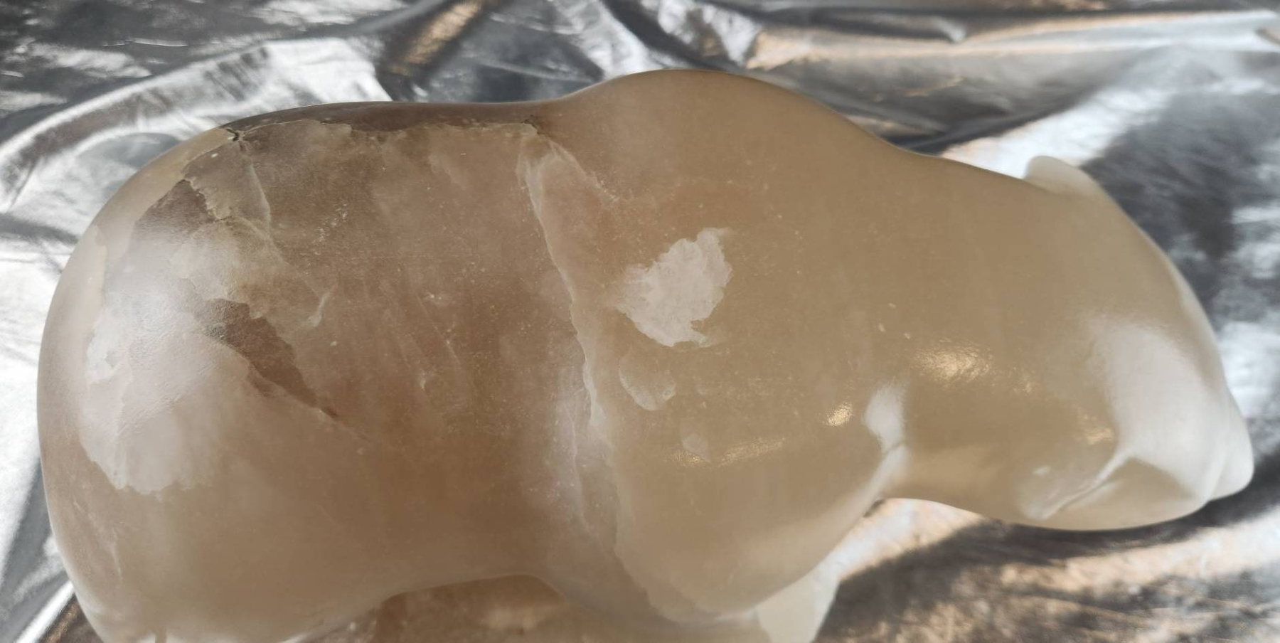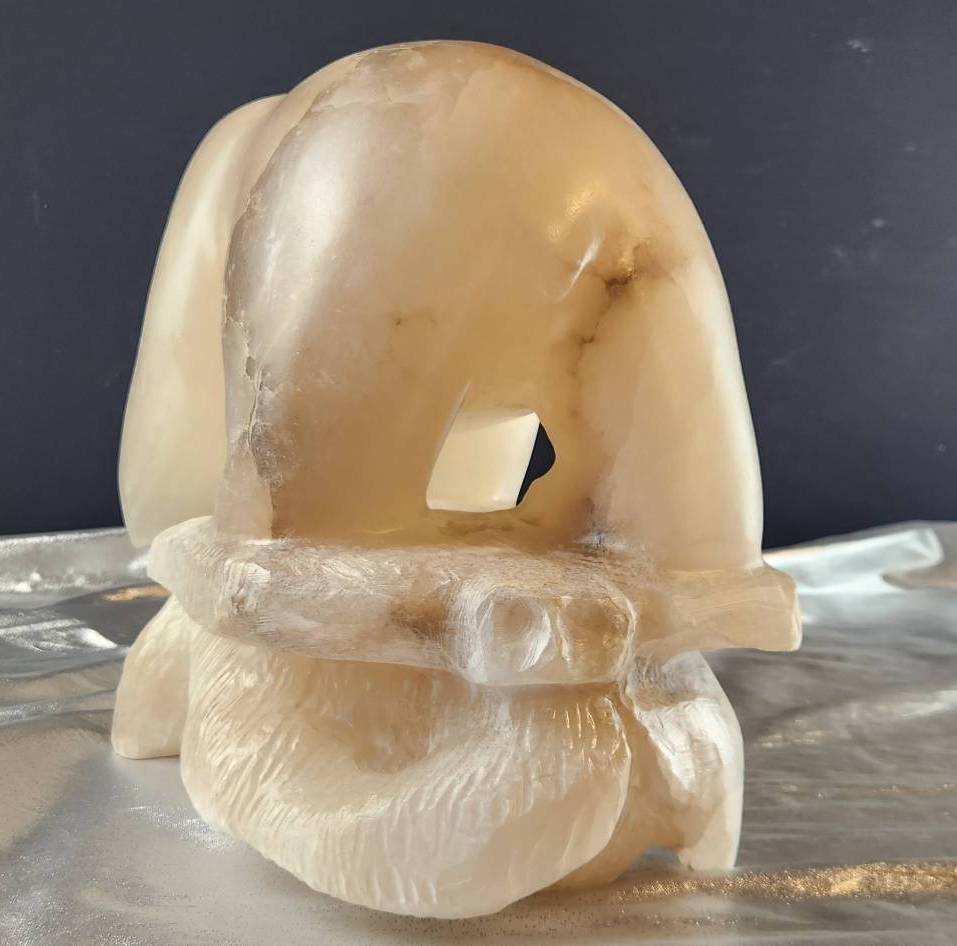 This is an impressive hand-carved bear sculpture, crafted from a stone that resembles quartz or onyx (exact material unverified). Measuring approximately 23 inches in width and 14 inches in height, this substantial piece weighs over 50 pounds, making it a striking display item. The detailed carving and the natural variations in the stone enhance its unique appeal, offering collectors and art enthusiasts a substantial, conversation-worthy piece.