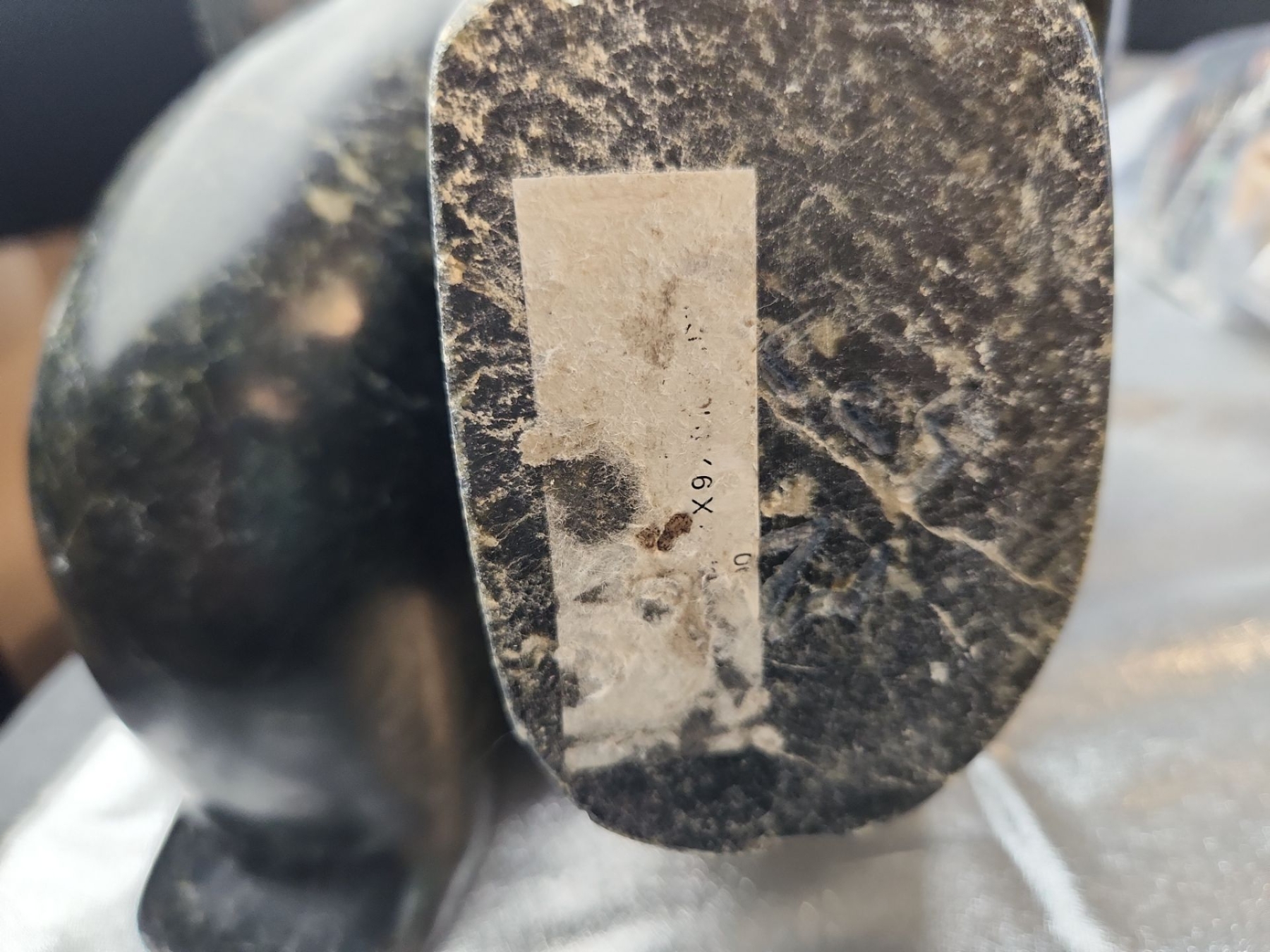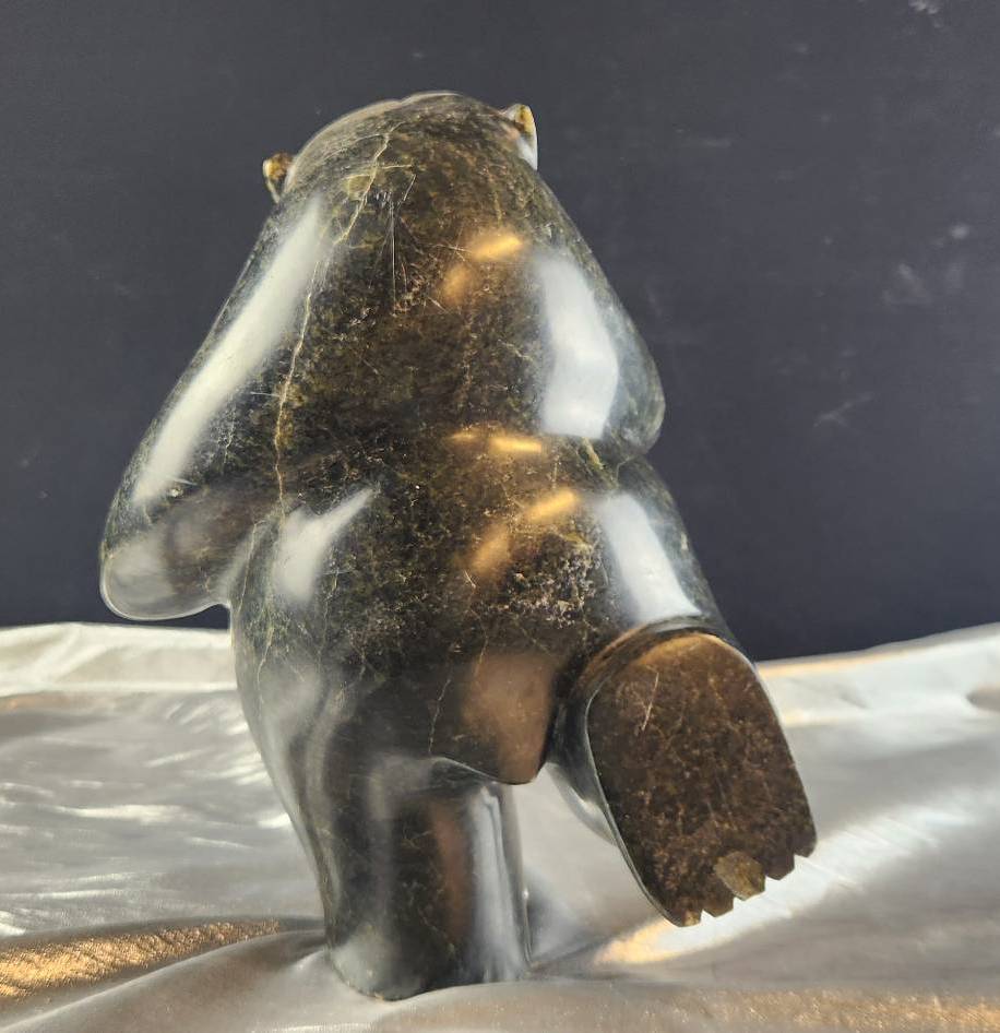 This detailed sculpture captures the enduring legend of the Inuit 'Dancing Bear' in serpentine or soapstone. | | | Measuring 12 inches in height by 7 inches in width and weighing over 20 lbs, this piece showcases exceptional craftsmanship and a rich cultural narrative. | Its elegant curves and balanced stance highlight the bear's dynamic movement, often symbolic of freedom and celebration in Inuit tradition.