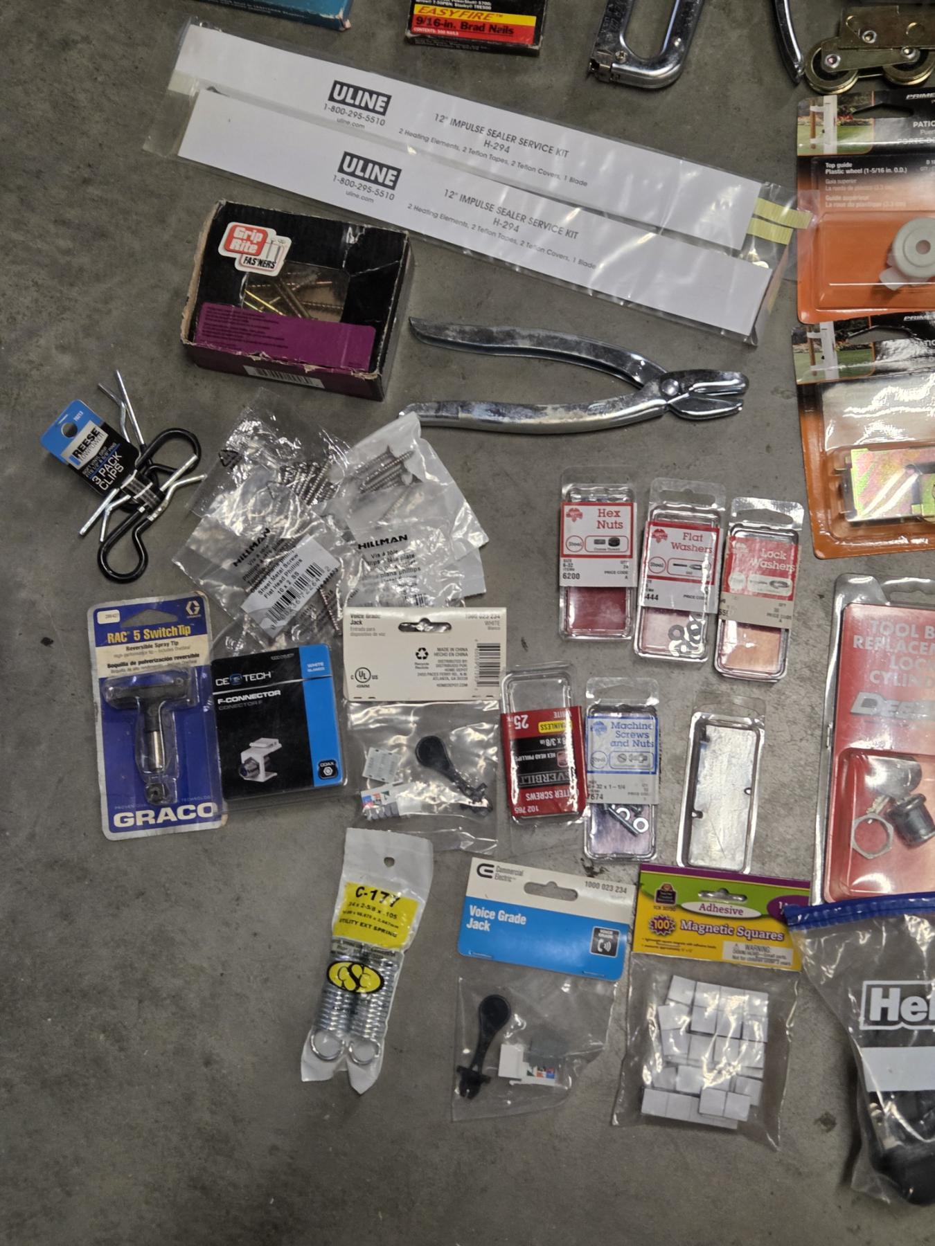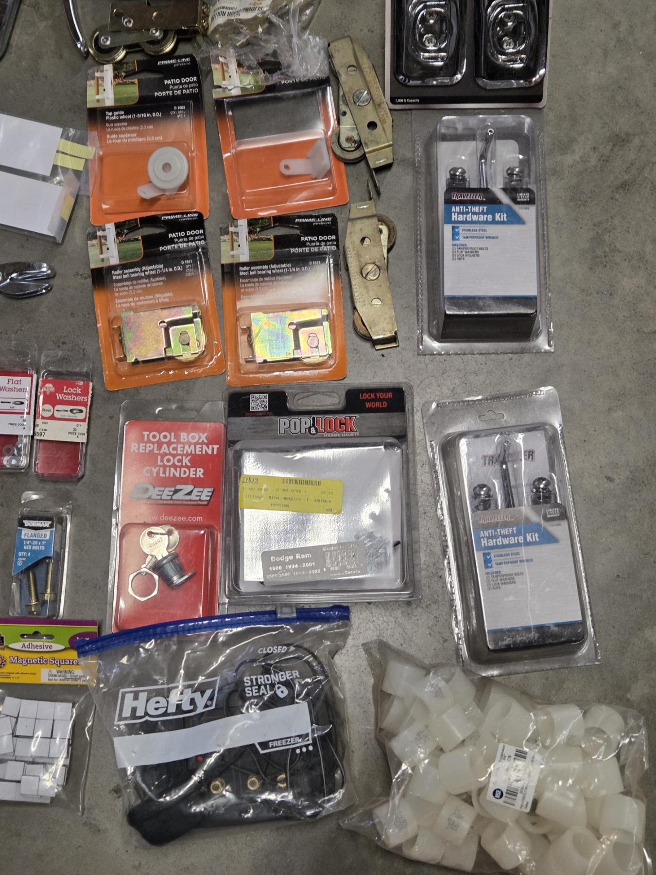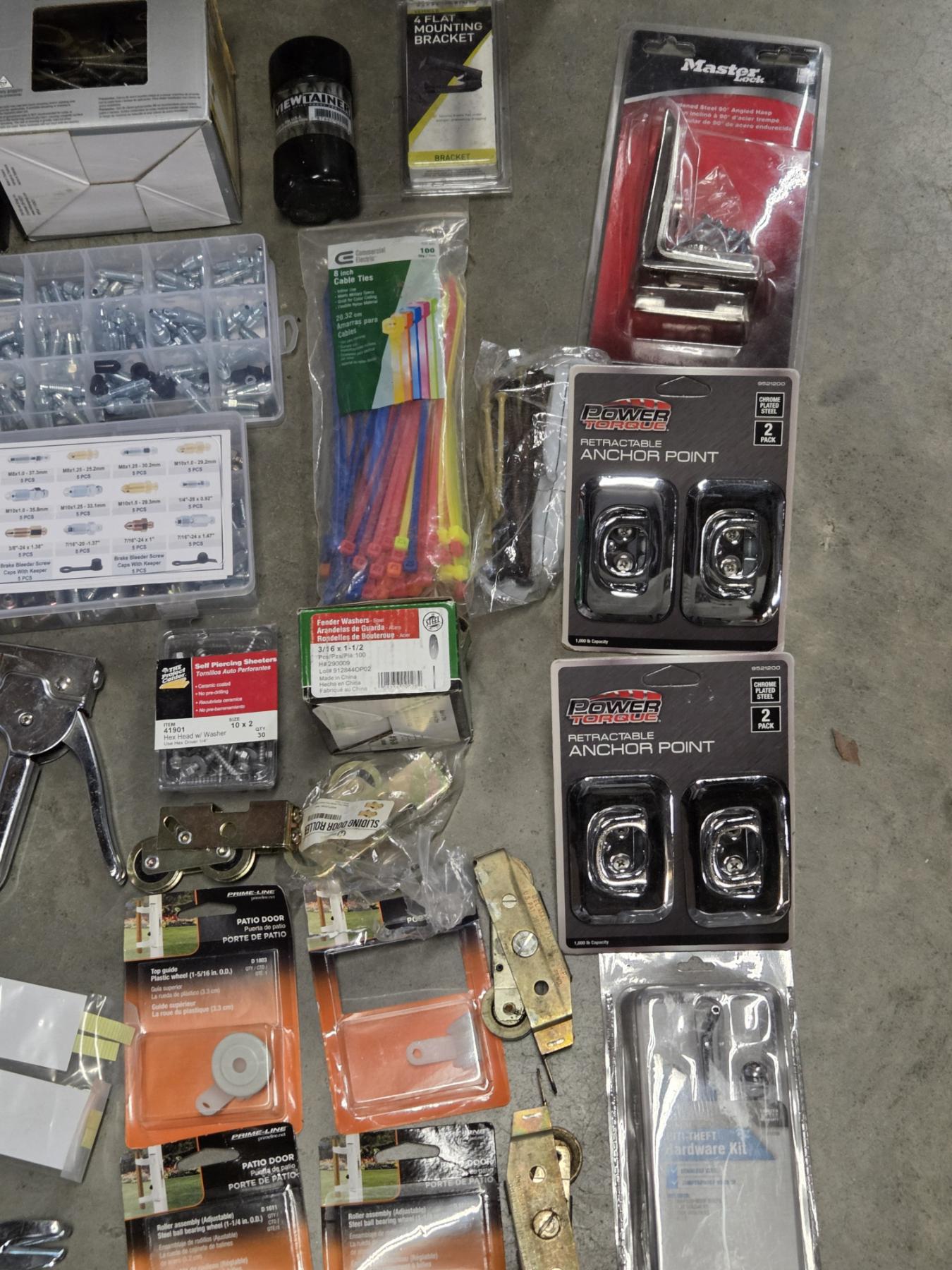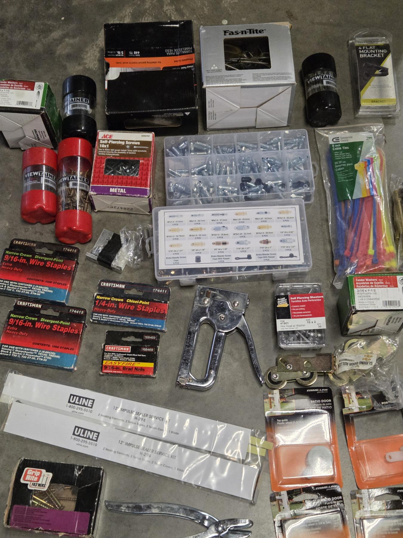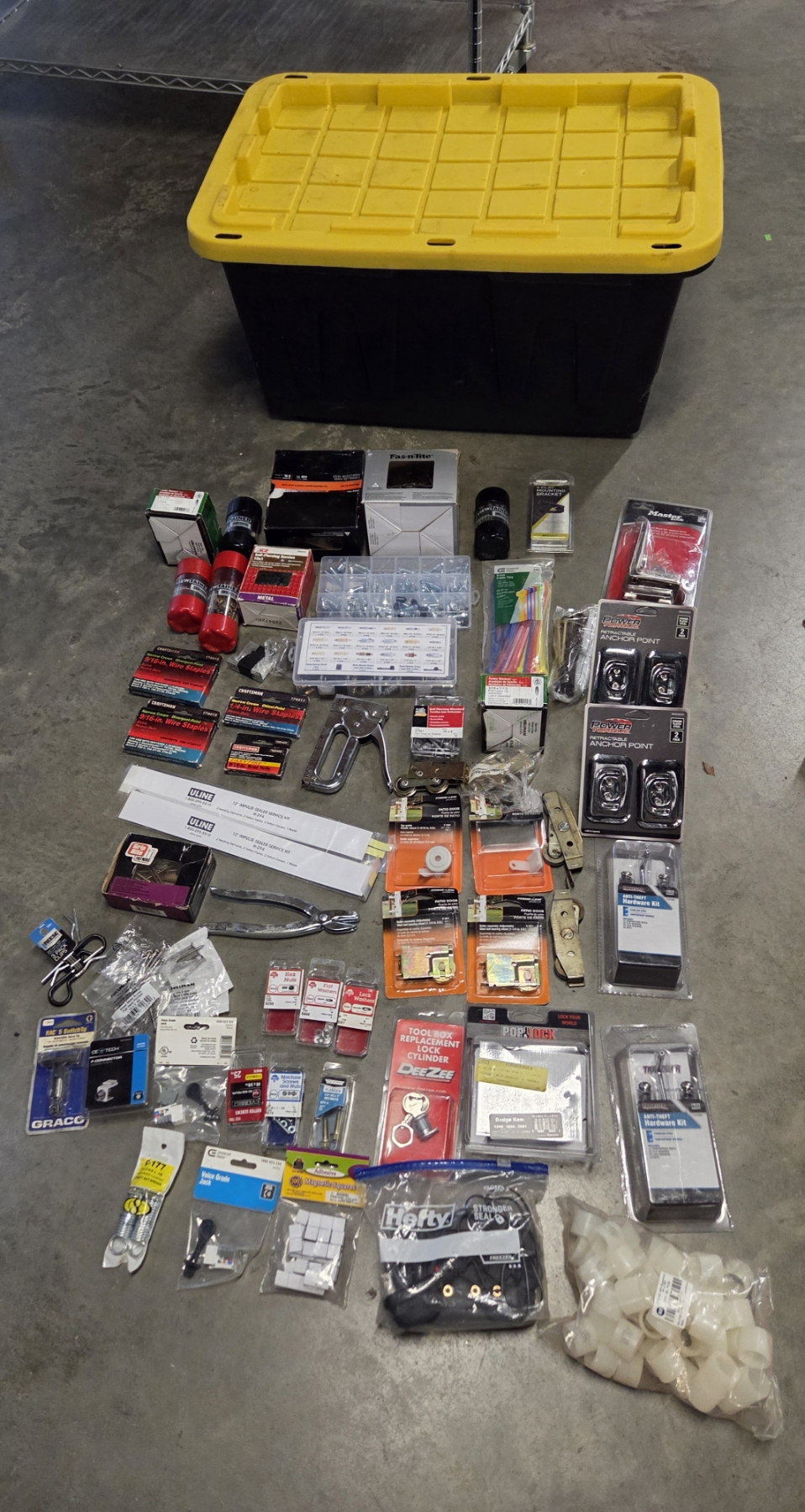 Lot 752 27 Gallon Tuff Tote With Fasteners, Brake Screws, Door Rollers And More