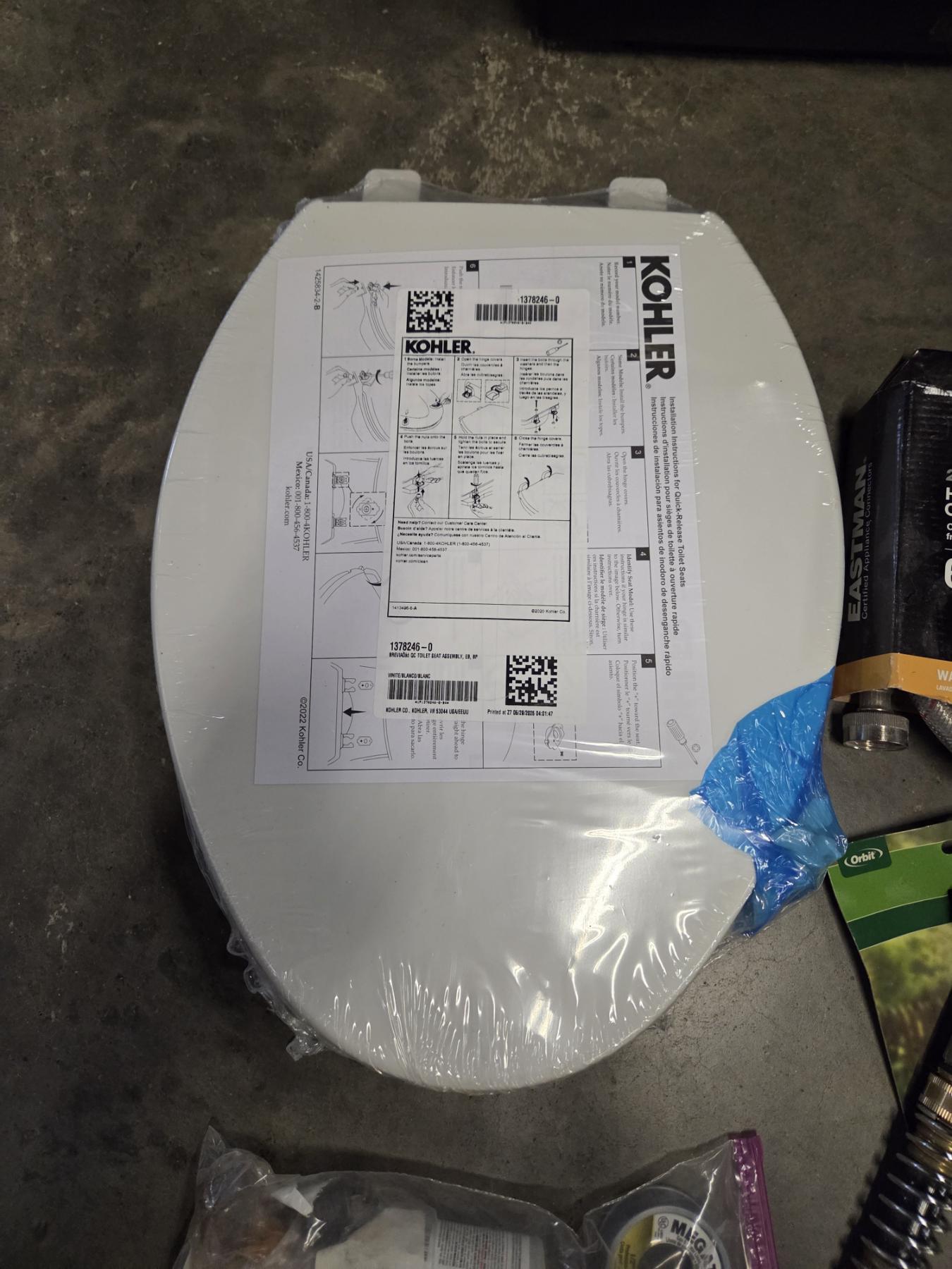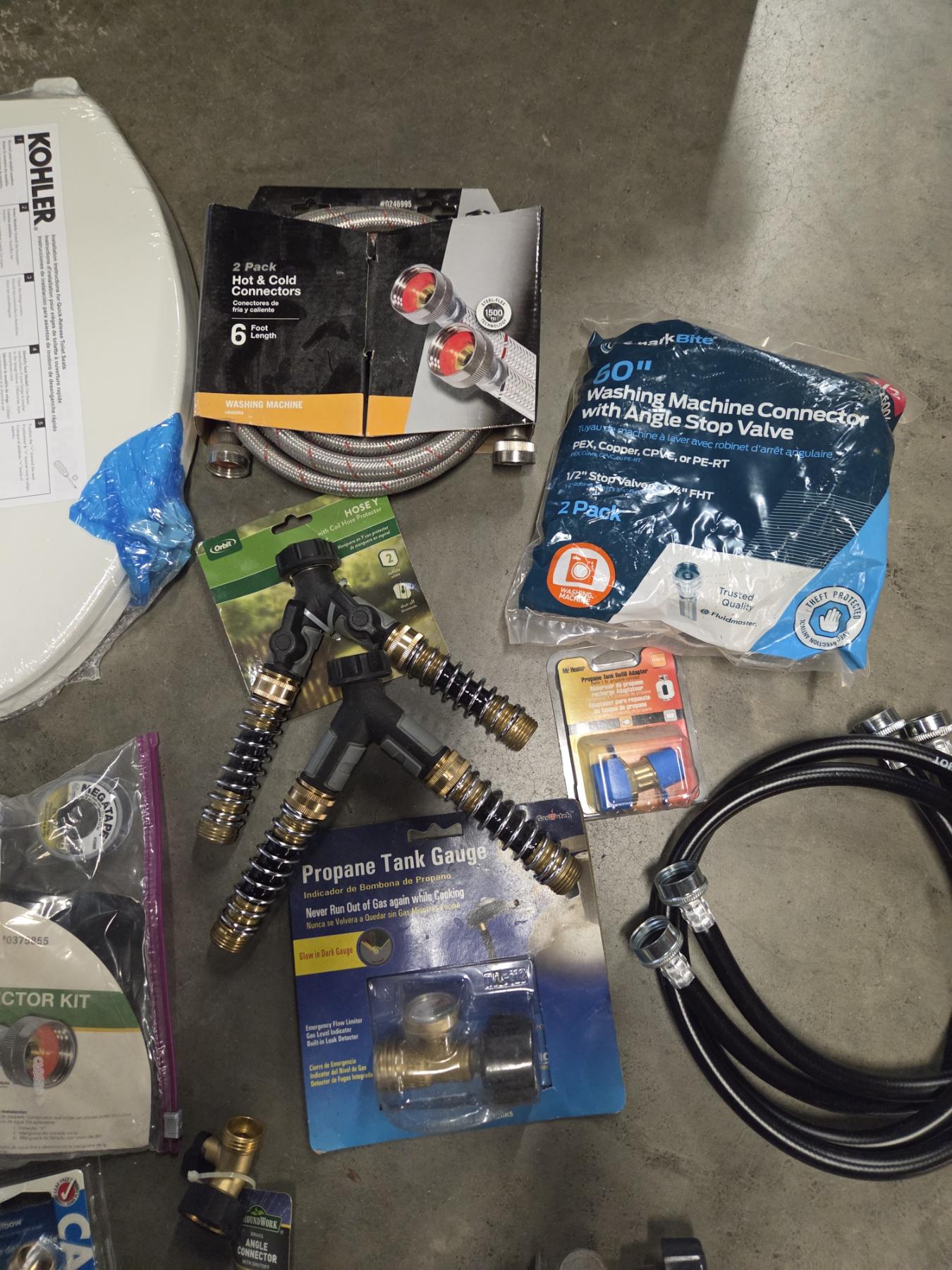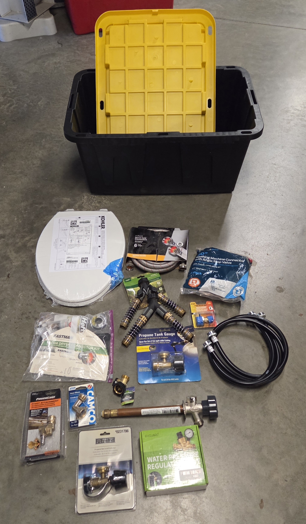 27 Gallon Tuff Tote With New Toilet Seat, Plumbing Supplies, & Propane Related Items
