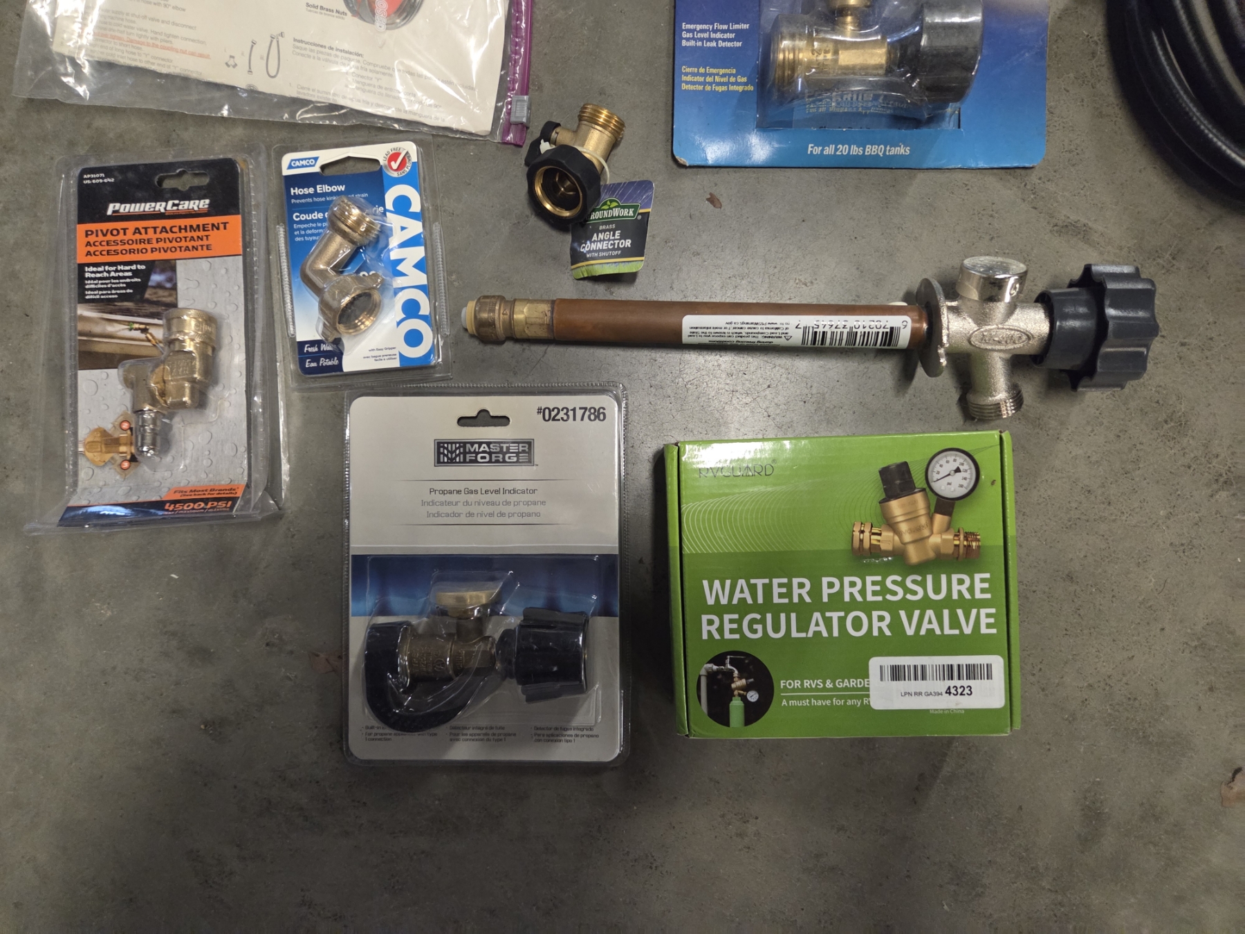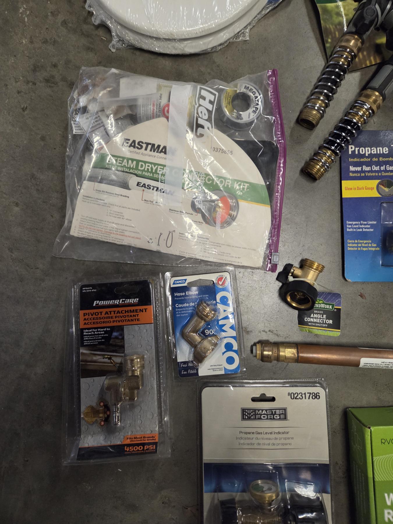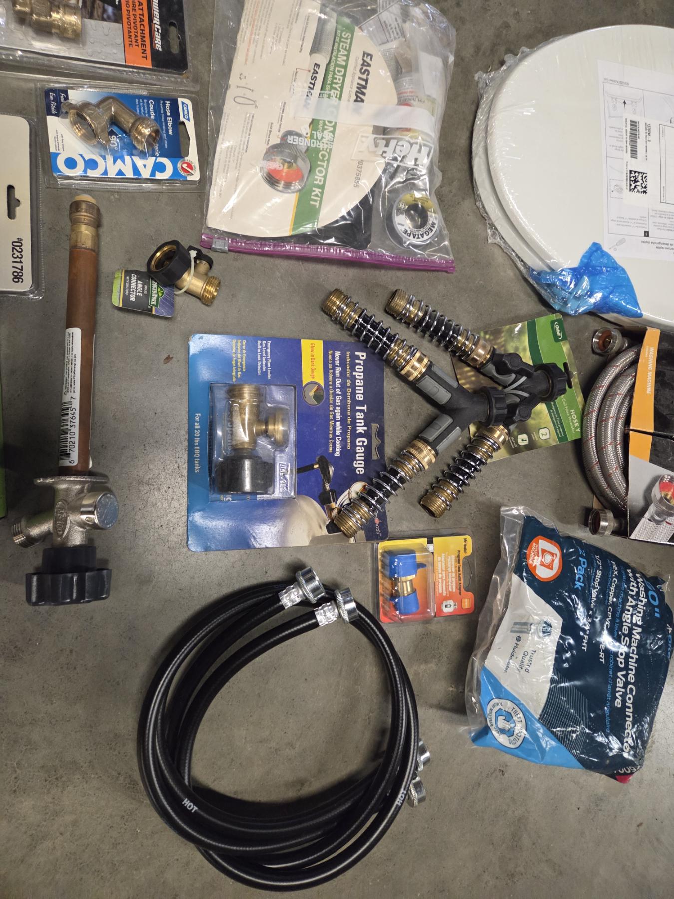 Lot 492 27 Gallon Tuff Tote With New Toilet Seat, Plumbing Supplies, & Propane Related Items