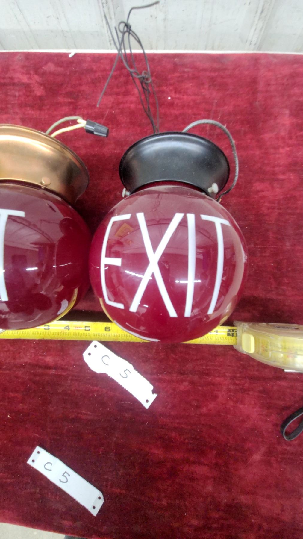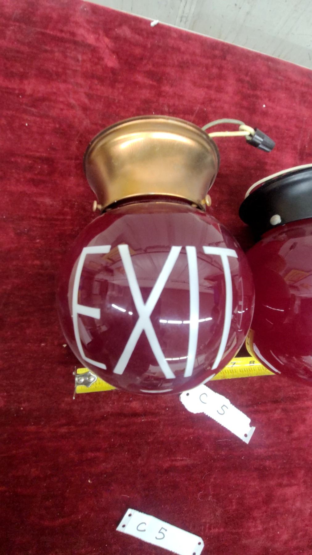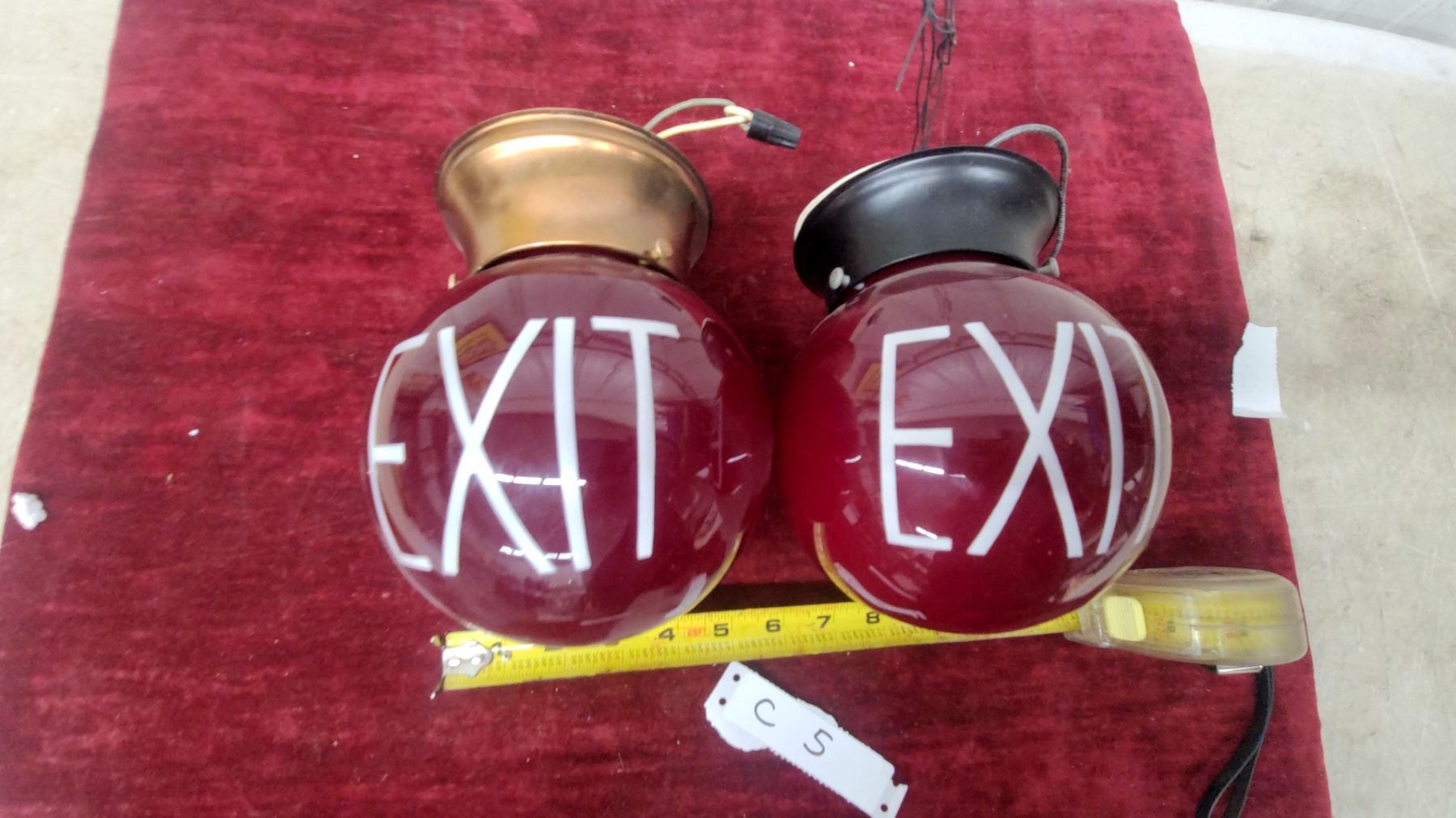 Pair of Vintage Ruby Red Glass Globe EXIT Sign Lights with Metal Fittings, Approx 6" Diameter