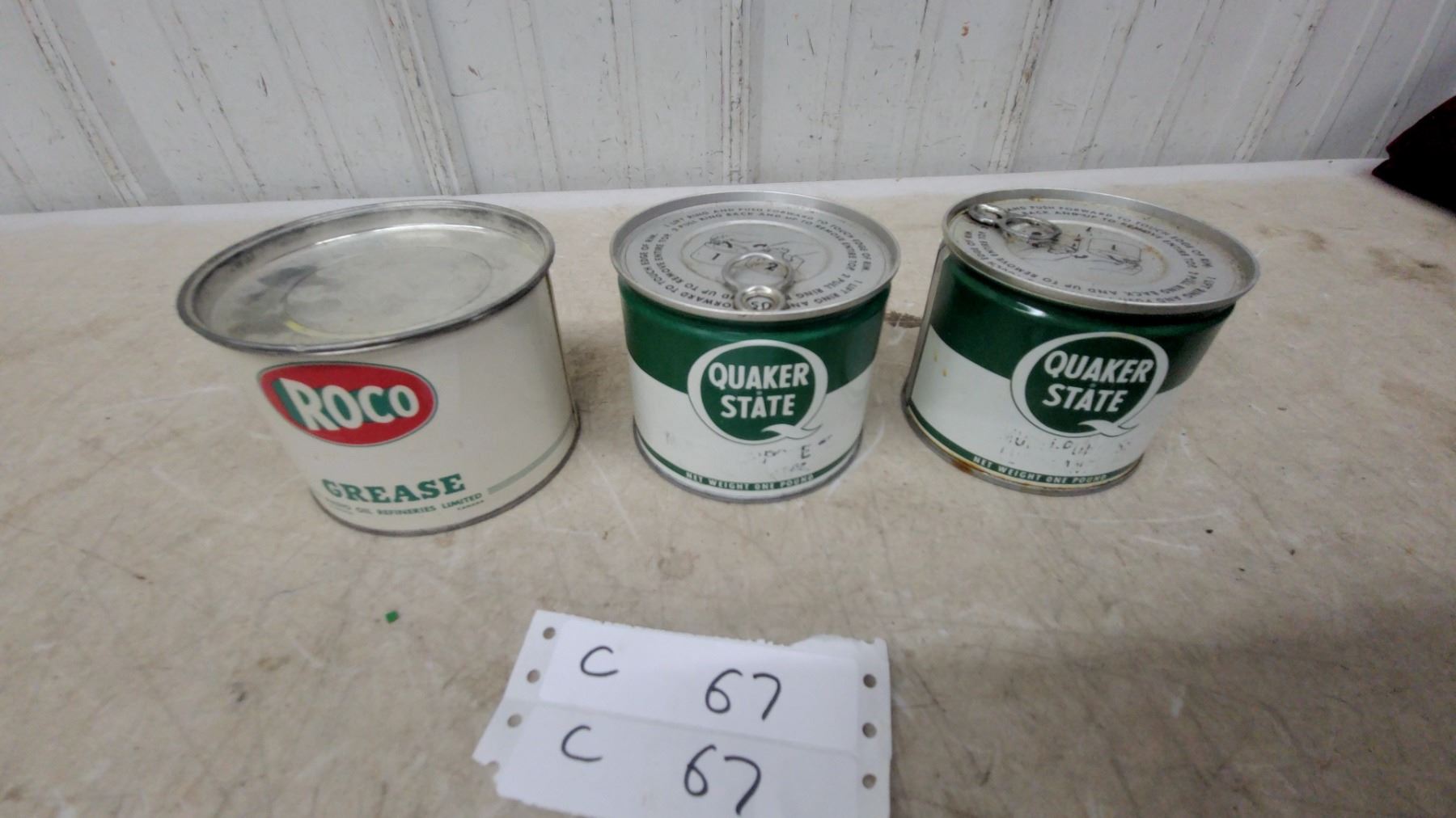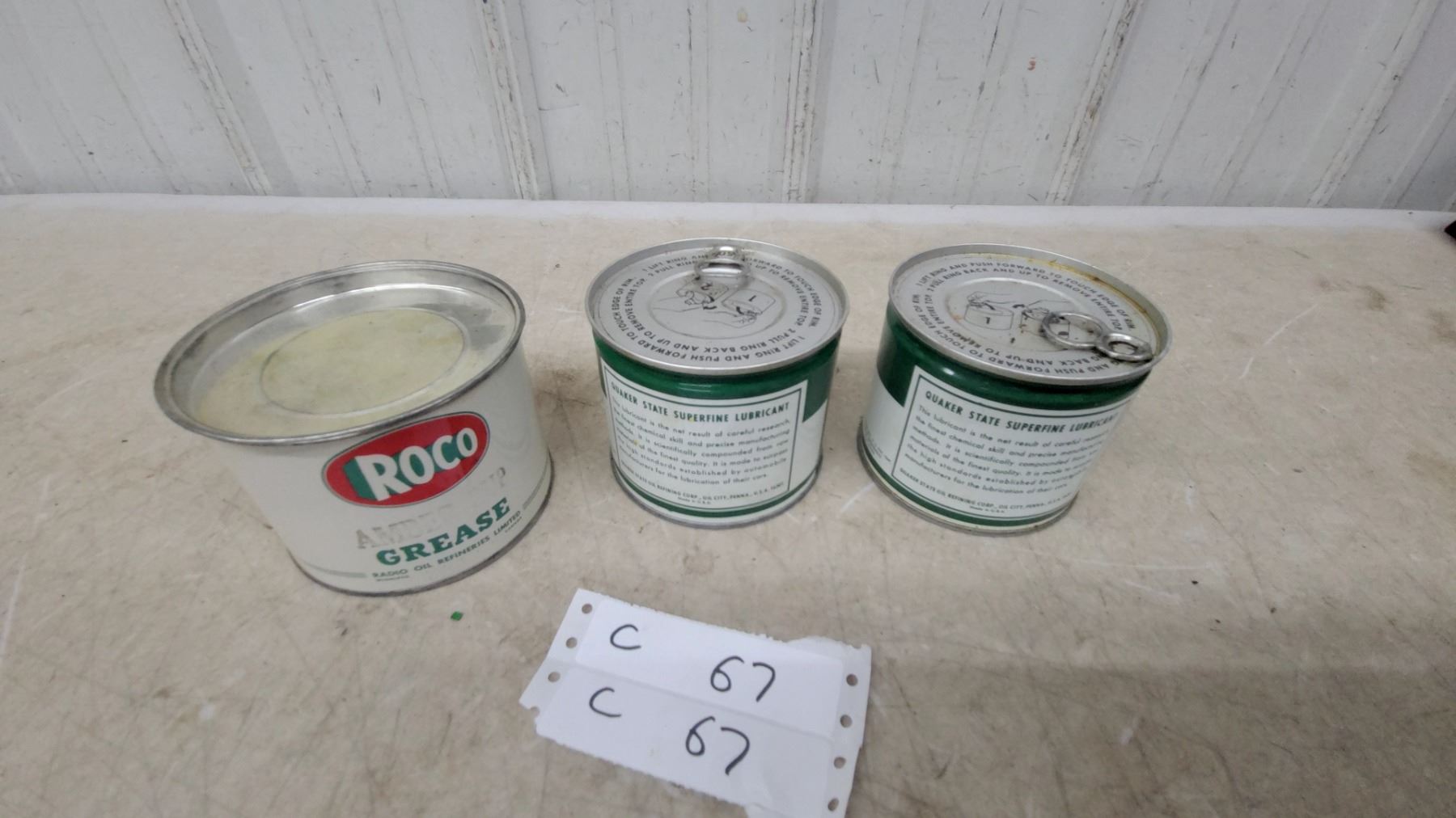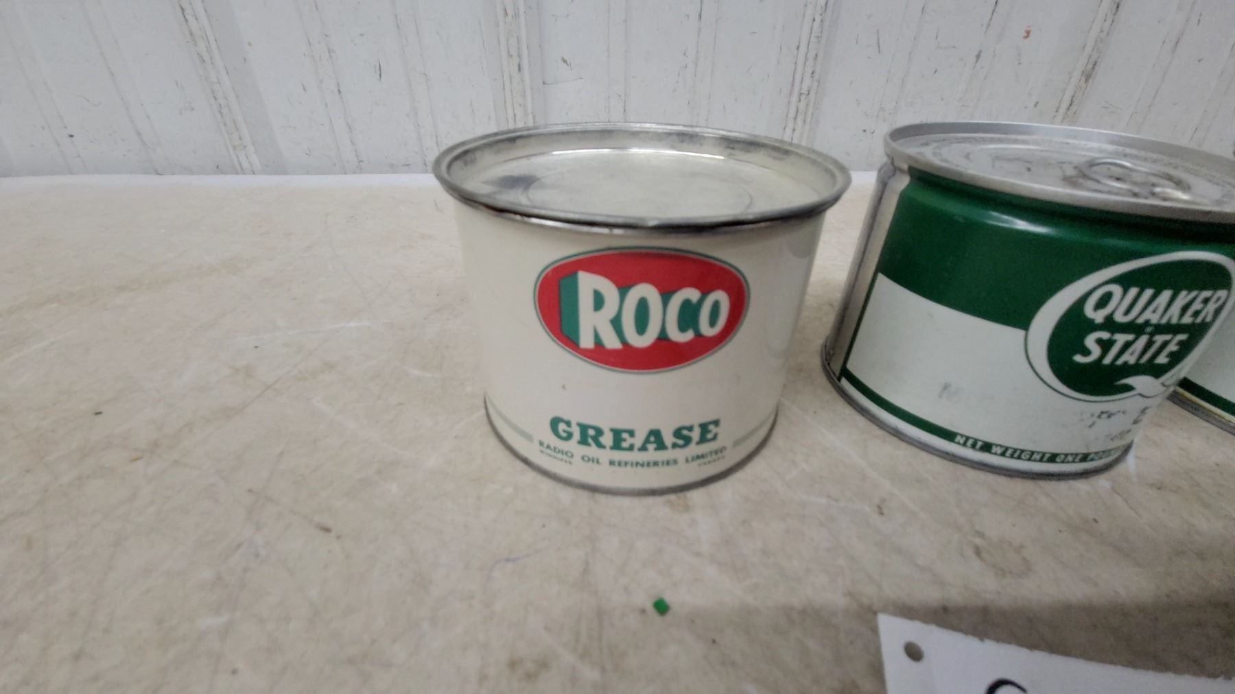 Lot 67 Roco Grease Tin and Two Quaker State Superfine Lubricant Tins, Vintage Automotive Grease Cans 1lb