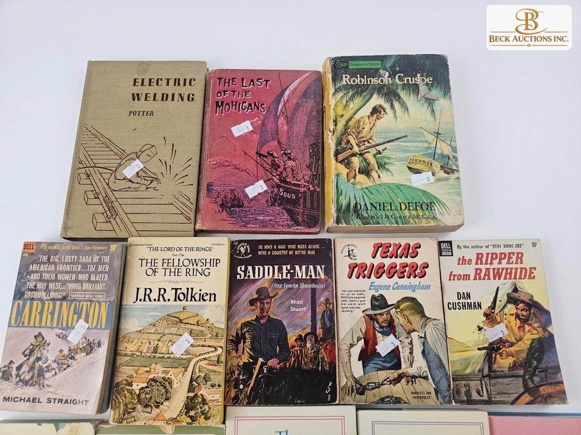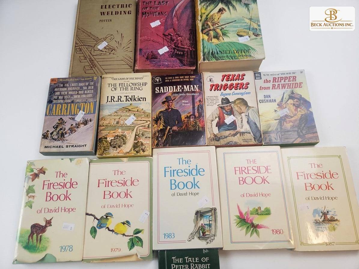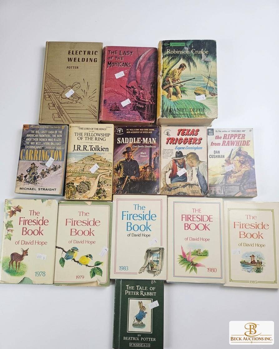 A diverse collection of 14 books featuring various genres and classic titles. Highlights include 'The Fellowship of the Ring' by J.R.R. Tolkien, 'Robinson Crusoe' by Daniel Defoe, 'The Tale of Peter Rabbit' by Beatrix Potter, and 'The Last of the Mohicans' by James Fenimore Cooper. Includes volumes from 'The Fireside Book' series (1973-1983). A treasure trove for literature lovers and collectors alike.