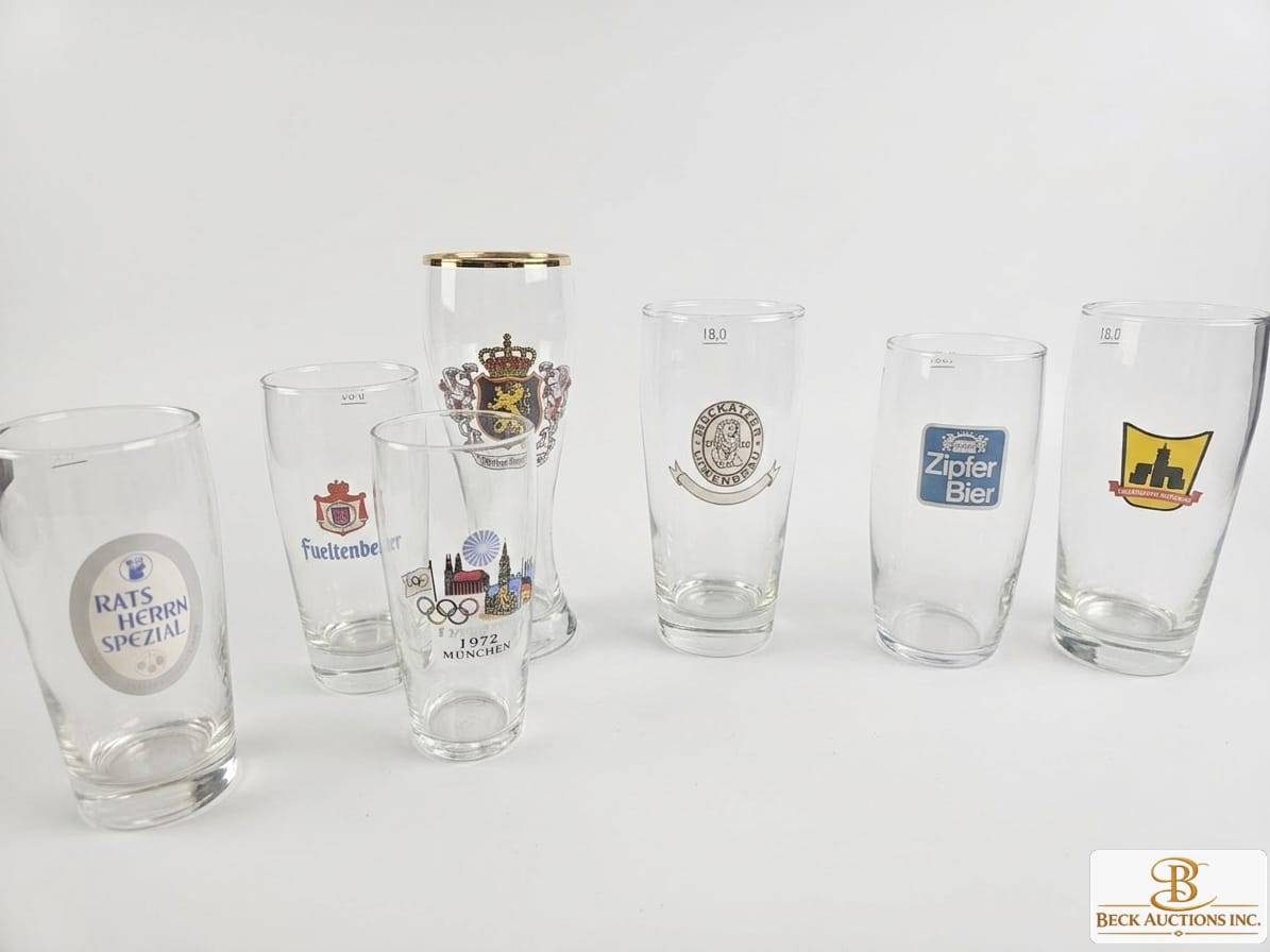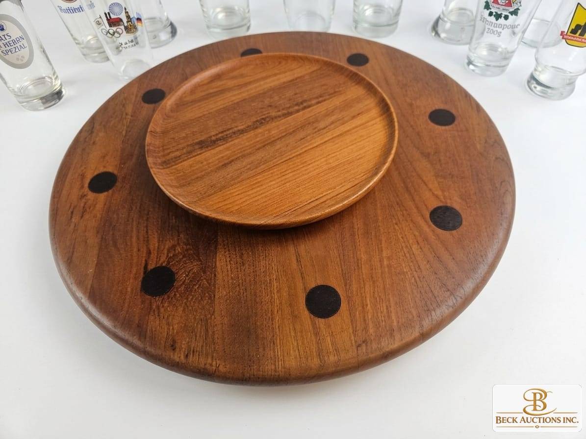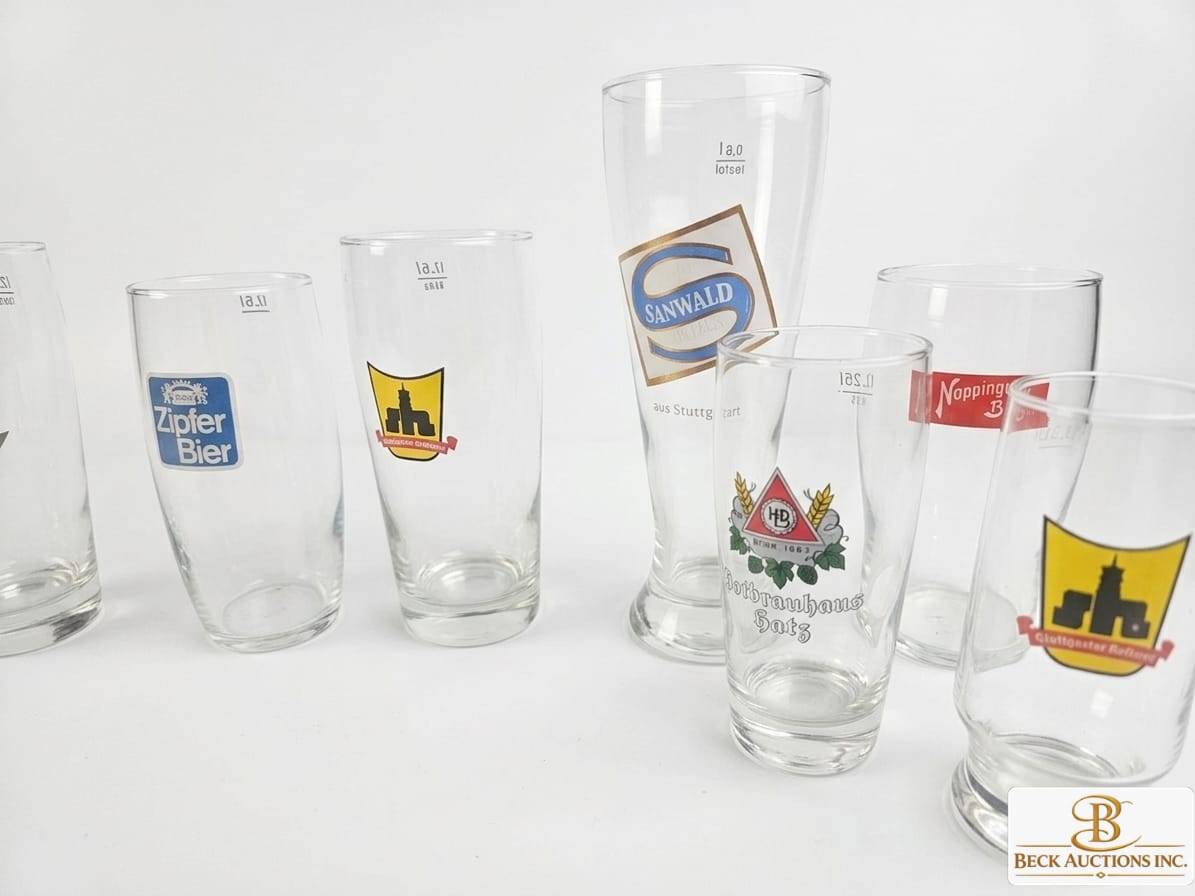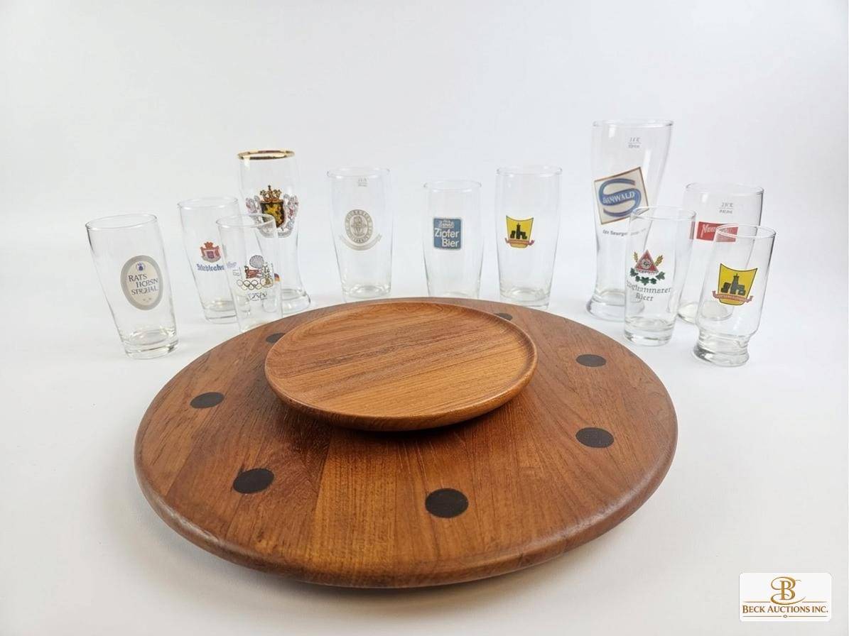 This lot includes a wooden lazy Susan with black accent dots, a functional and stylish serving piece, accompanied by a set of various branded and logo-adorned beer and beverage glasses. The lazy Susan measures approximately 15 inches in diameter, ideal for entertaining or casual gatherings. The glassware set features an array of designs celebrating popular brands and themes, offering a versatile mix for collectors or use. All items are in good condition suitable for display or functional use.