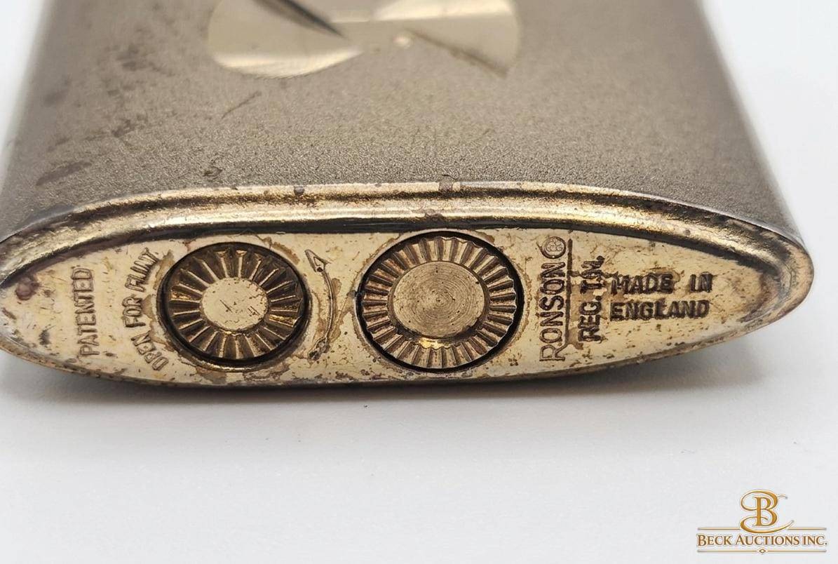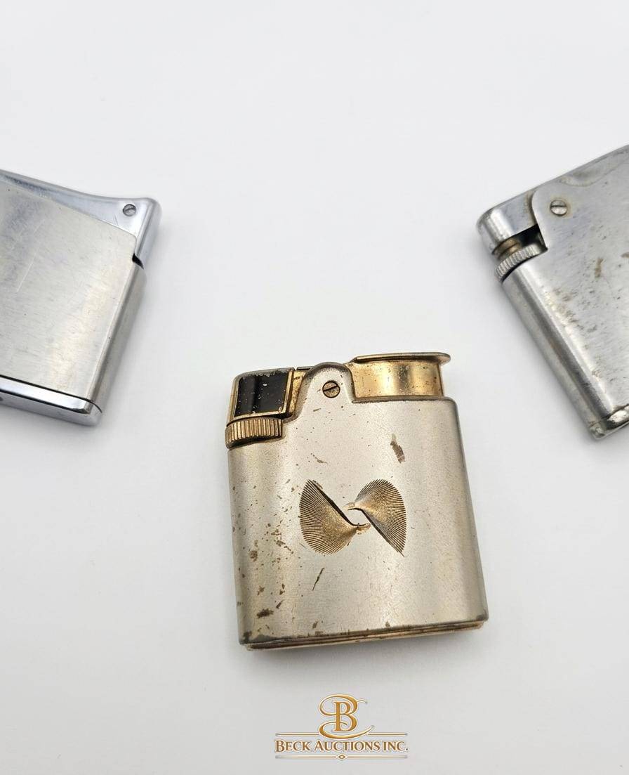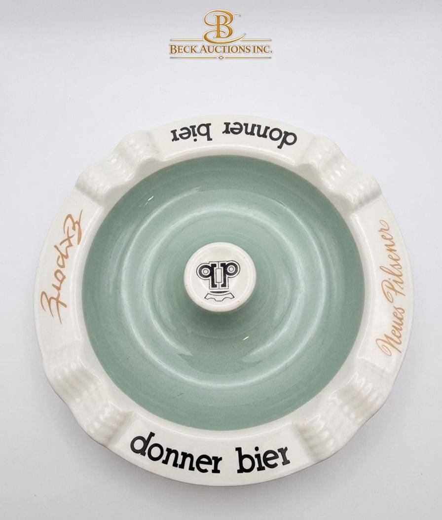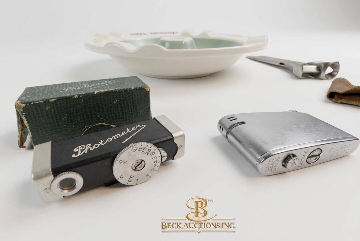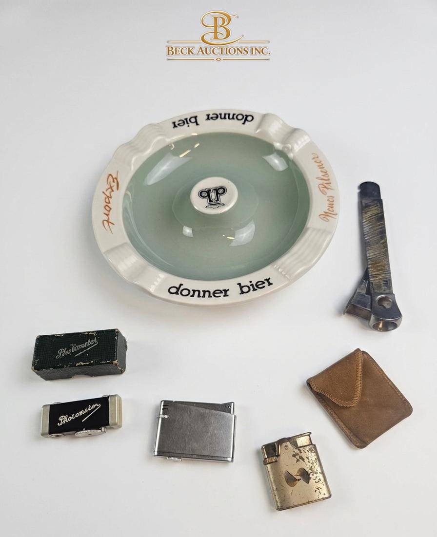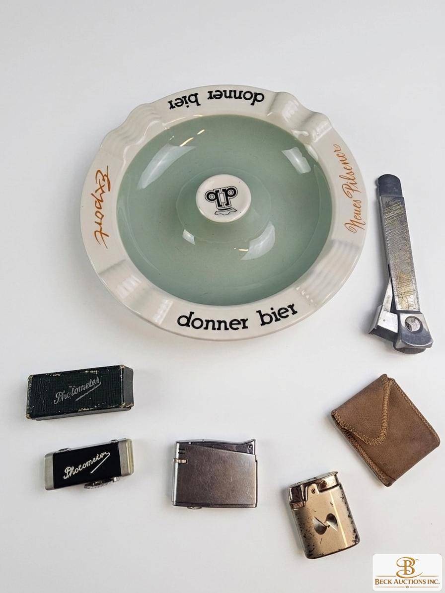Vintage smoking-related items including a Donner Bier branded ceramic ashtray, assorted cigarette lighters, a Photometer meter, and a cigarette holder. The ashtray measures approximately 8 inches in diameter and features signed designs. The lighters show various styles and materials, with one marked 'Made in England' and another with a leather case. Items show typical signs of age but remain collectible.