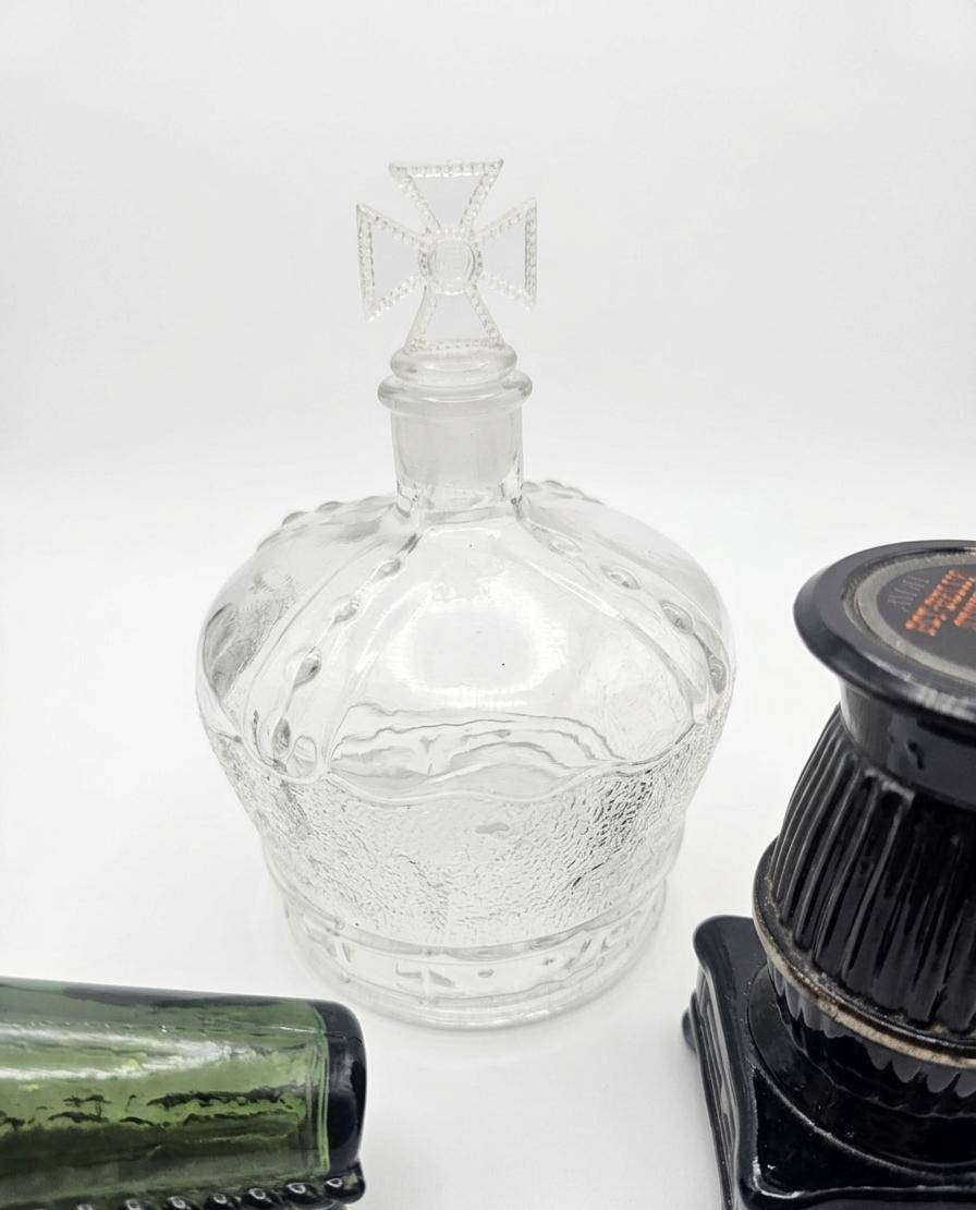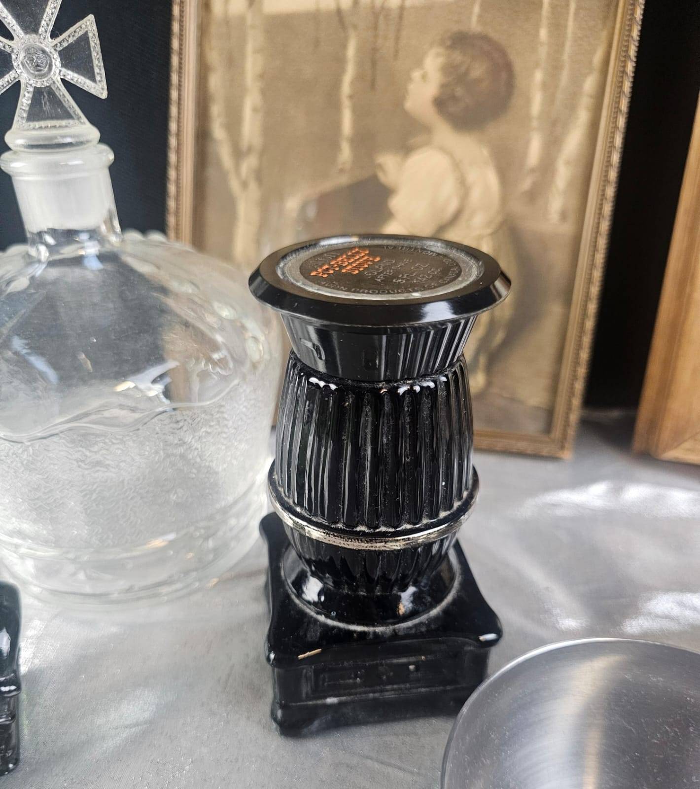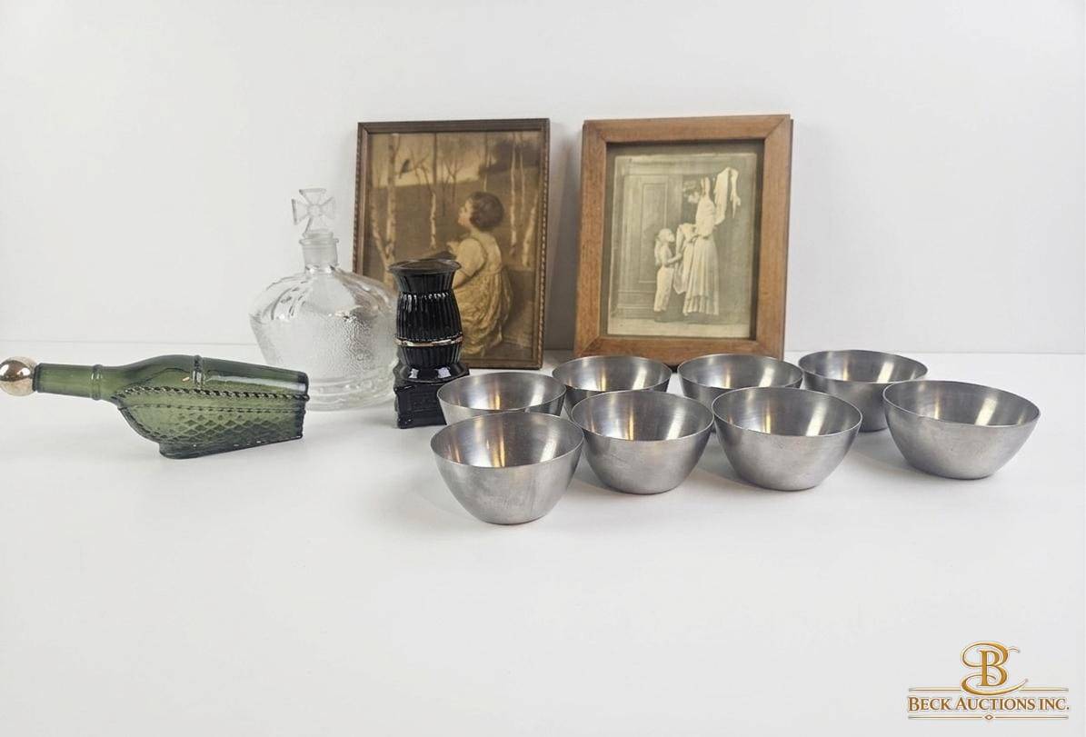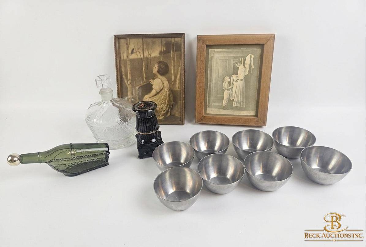 This lot features a charming mix of household items including 8 sleek metal bowls, a unique green glass bottle with a stopper, a crystal decanter adorned with an ornate cross-shaped stopper, and a black "Pot Belly Stove" salt/pepper shaker marked as 5 1/2 ounces. Also included are two nostalgic framed art prints in wooden frames depicting heartwarming scenes. A versatile collection perfect for decor enthusiasts or collectors.