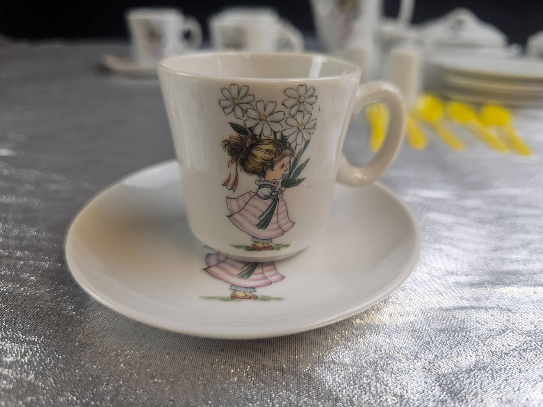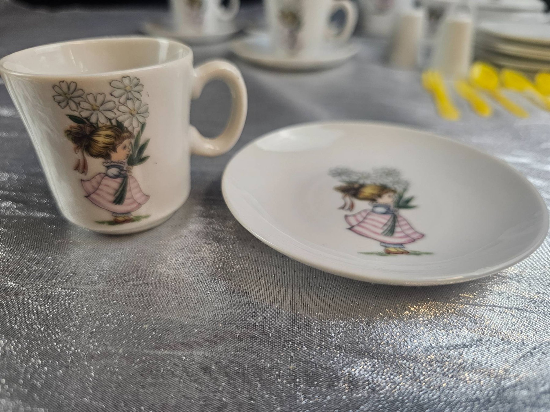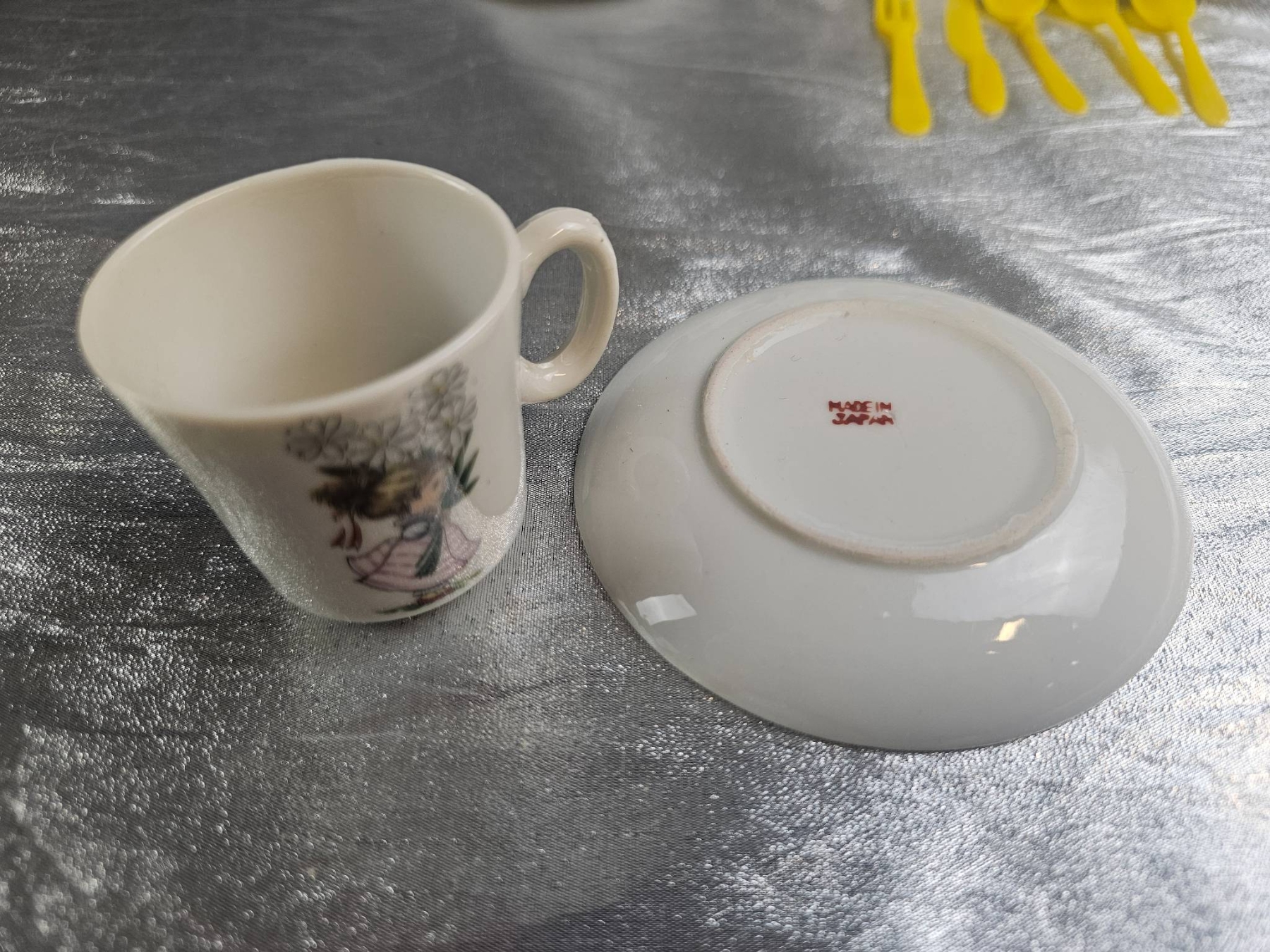 Delightful 21-piece ceramic tea set featuring a charming floral girl design on each piece. The set includes a teapot, sugar container, creamer, 4 cups with saucers, 4 plates, salt and pepper shakers, and 6 yellow plastic utensils. Each piece is marked 'Made in Japan'. Ideal for collectors or tea party enthusiasts looking for a complete table setting.