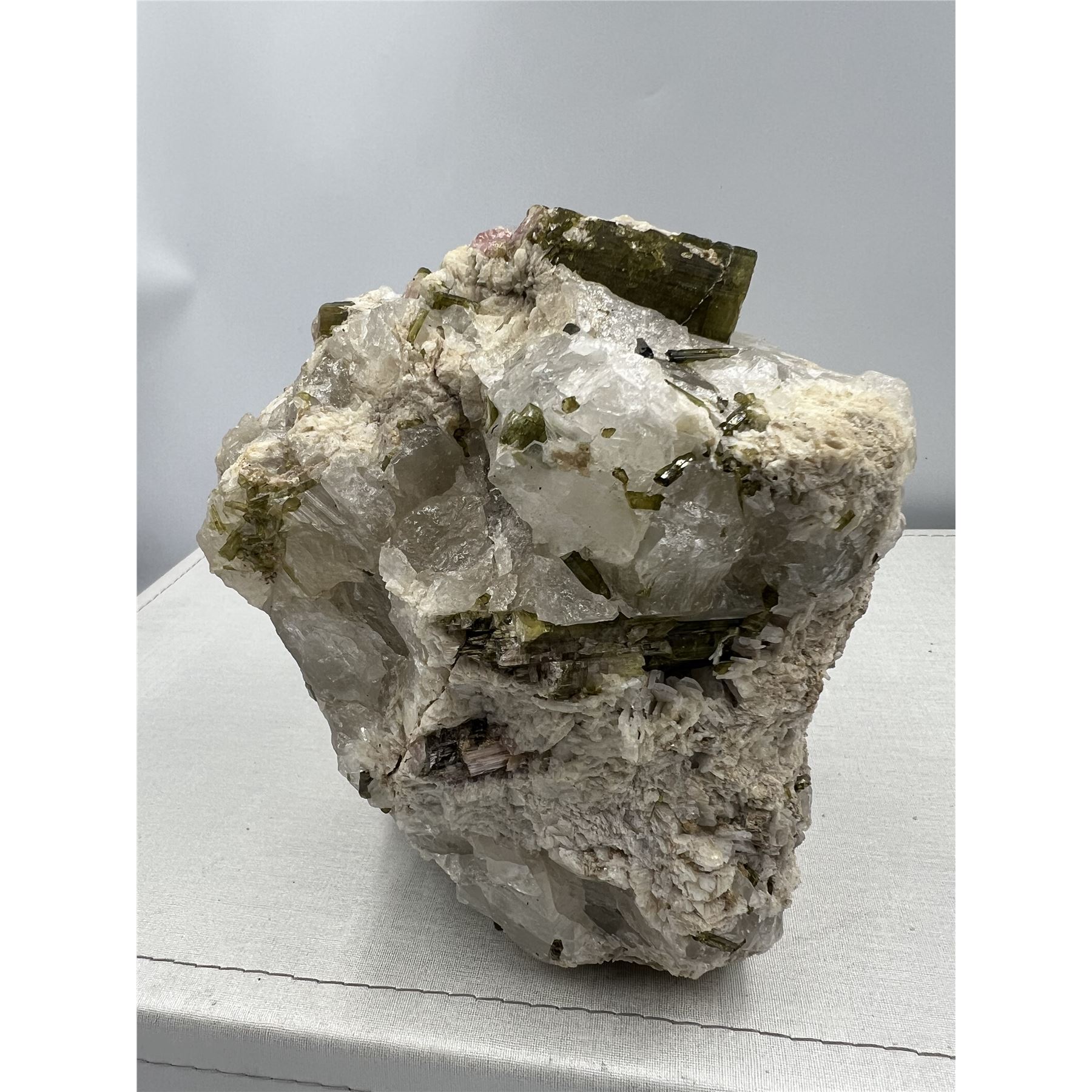 7 X 7 INCH GREEN AND PINK TOURMALINE IN CLEAR QUARTZ MATRIX