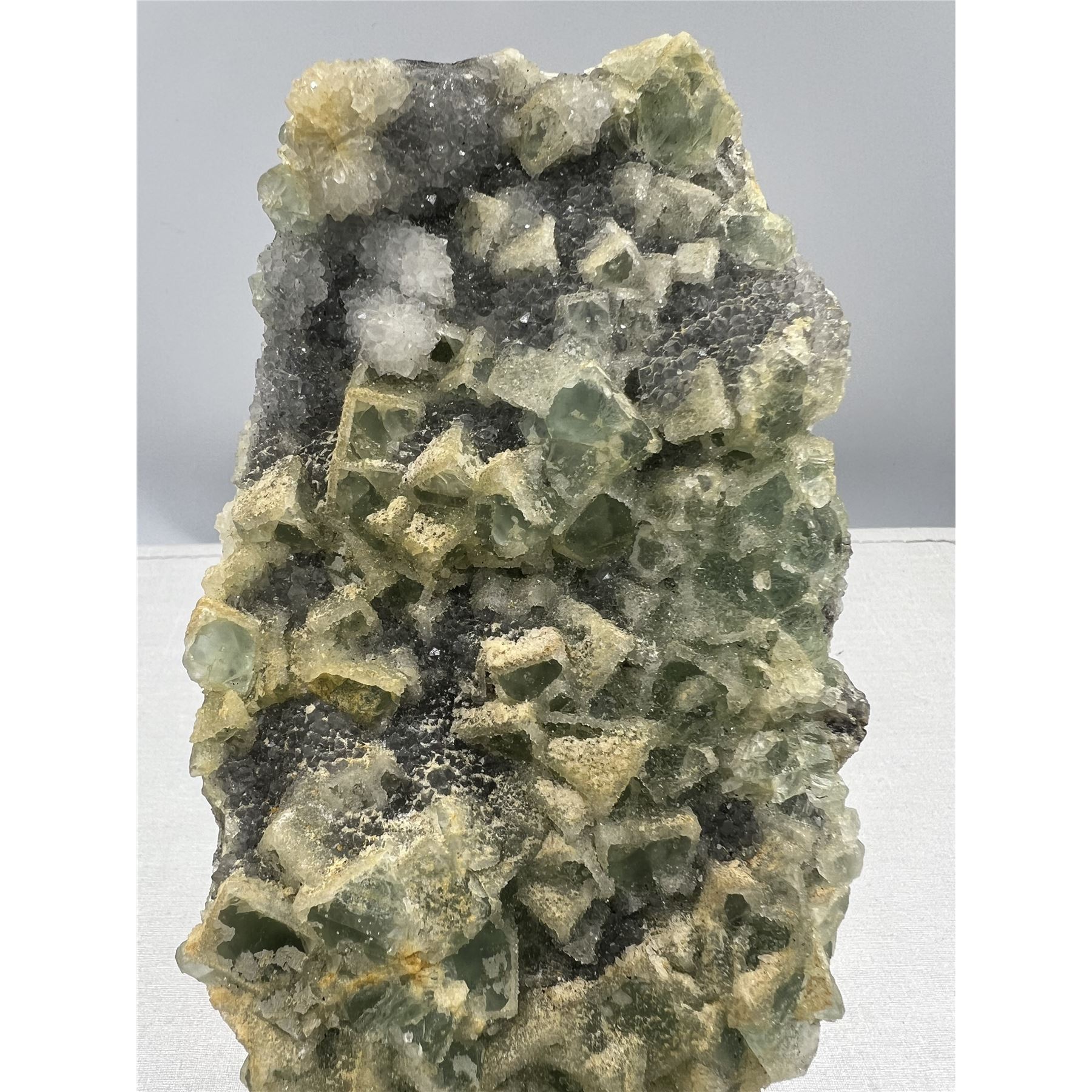 Lot 29 8 X 4 INCH GREEN SUGAR FLUORITE WITH CALCITE ON STAND