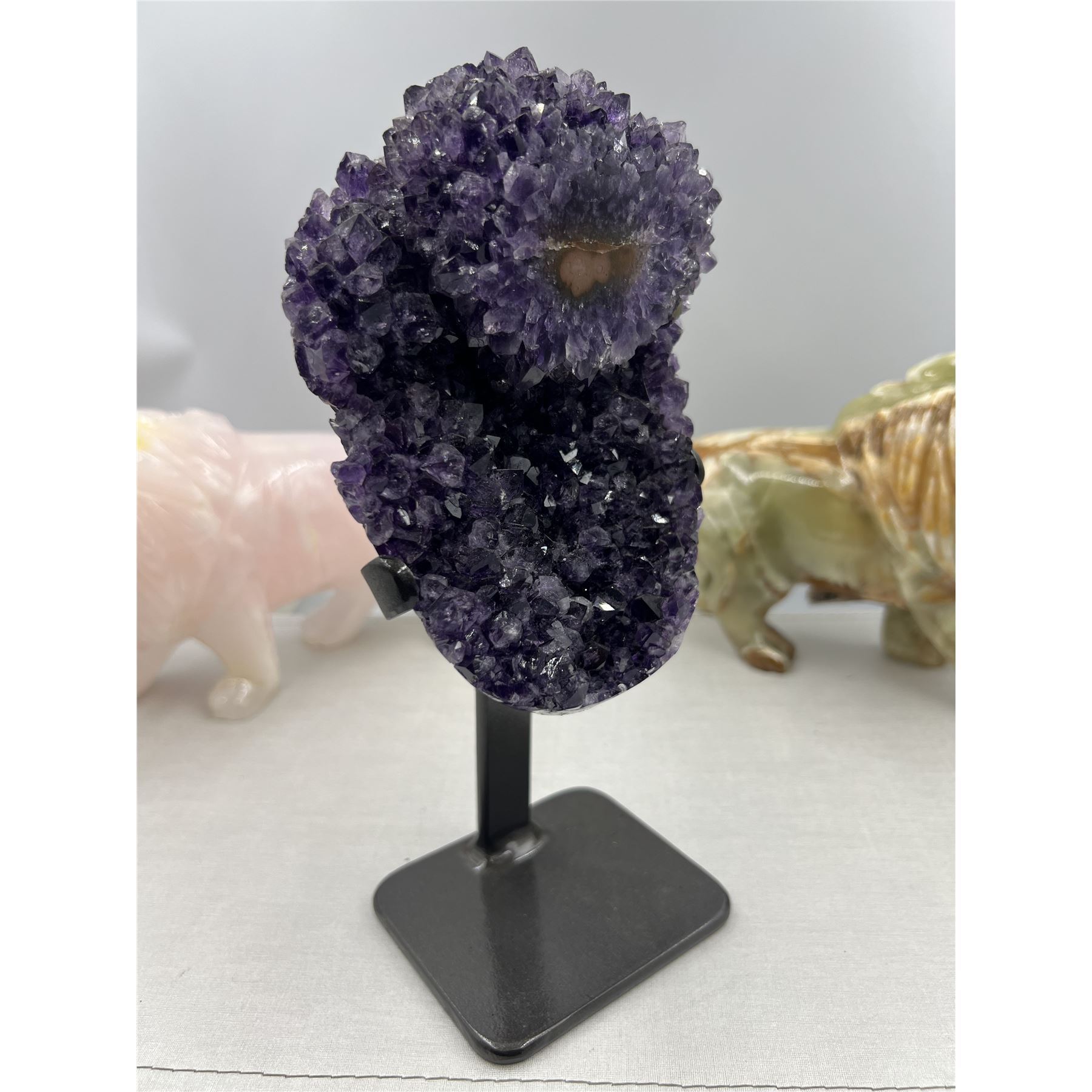 9 X 4 INCH HIGH GRADE URUGYAN AMETHYST CLUSTER ON METAL STAND .