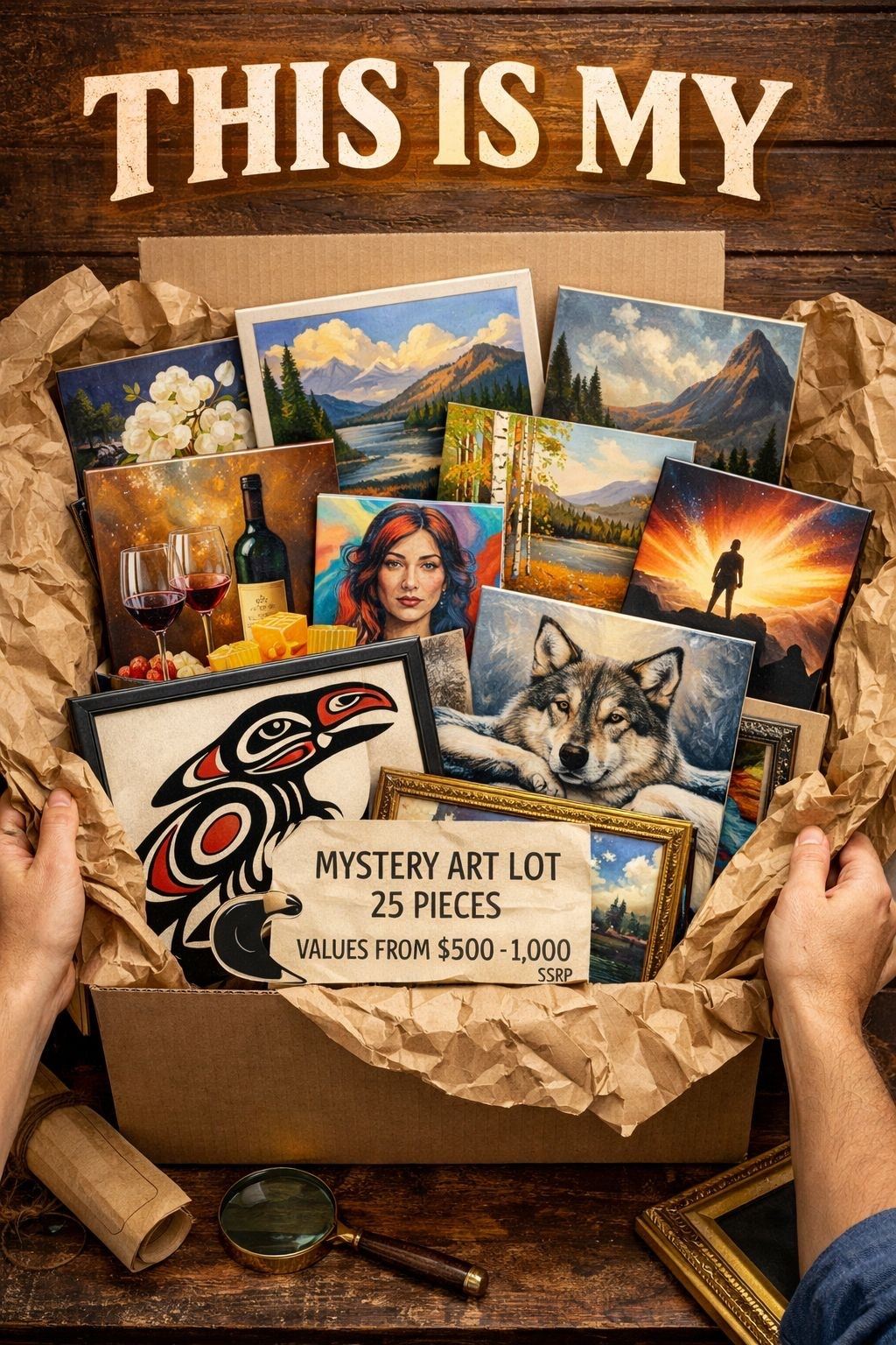Unlock a treasure trove of fine art! This mystery lot contains 25 assorted pieces, including giclŽes, lithographs, signed editions, and limited editions. YouÕll discover a blend of contemporary art, still lifes, wildlife, Group of SevenÐinspired landscapes, First Nations artistry, and inspirational works, with sizes up to 18 x 18 inches. Each box carries a retail value ranging from $500 to $1,000, ensuring both visual delight and incredible value. Each box is a surprise-filled collection, perfect for any art lover or collector. Image is AI generated for marketing purposes. Ð ARTMystery100