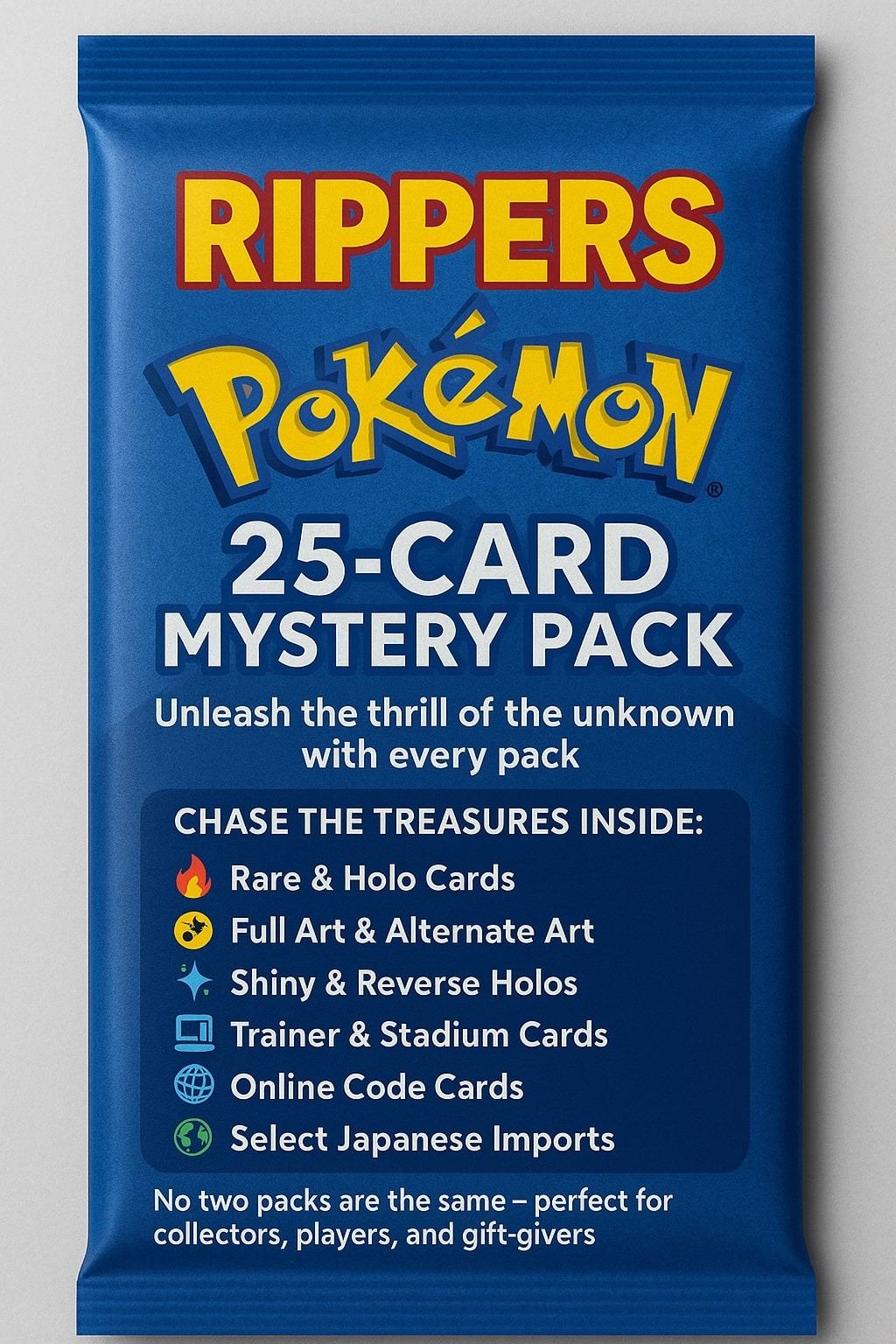 RIPPERS POKƒMON 25-Card Mystery Pack Unleash the thrill of the unknown with every pack! Each RIPPERS POKƒMON Mystery Pack contains 25 mixed PokŽmon cards from various English & Japanese issues. Chase the treasures inside: __ Rare & Holo Cards __ Full Art & Alternate Art _ Shiny & Reverse Holos __ Trainer & Stadium Cards __ Online Code Cards __ Select Japanese Imports No two packs are the same Ð perfect for collectors, players, and gift-givers! Each card is securely sealed in a tamper-evident mylar pack, intentionally unbranded to ensure maximum security, integrity, and complete mystery upon arrival. Ð 29631