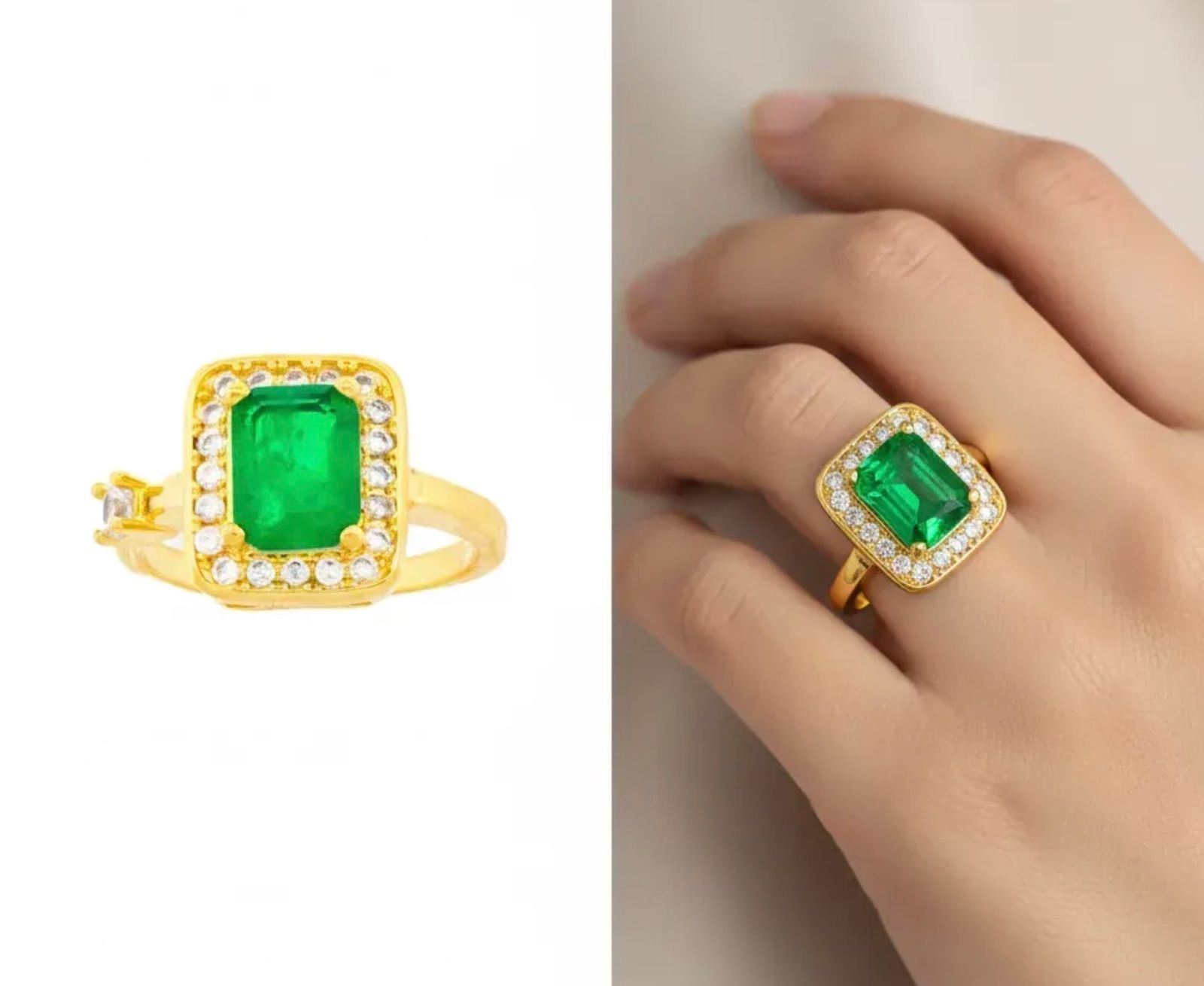 18kt Gold Layered Oro Laminado Money Ring Emerald Green Rectangular Stone w/ Halo.Size 9 Ð A7694