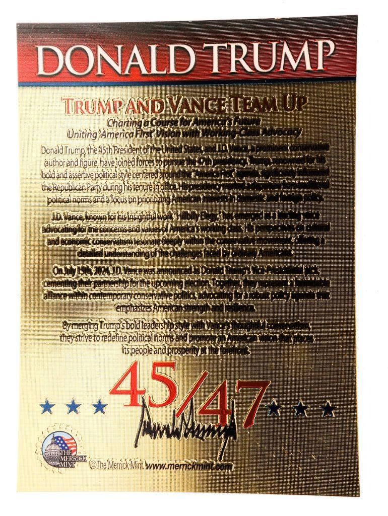 TRUMP / VANCE Team Up 45/47 23kt Gold Leaf Foil Card. Ð 7001935