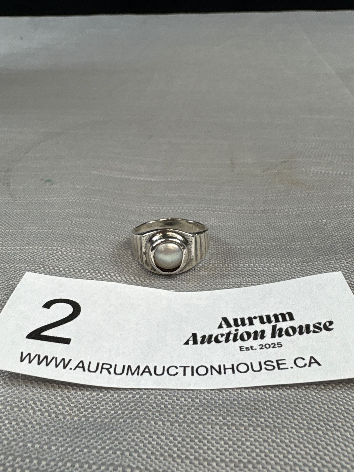 Hand Crafted Sterling Silver w/ Pearl Ring, Marked STER. Size 7