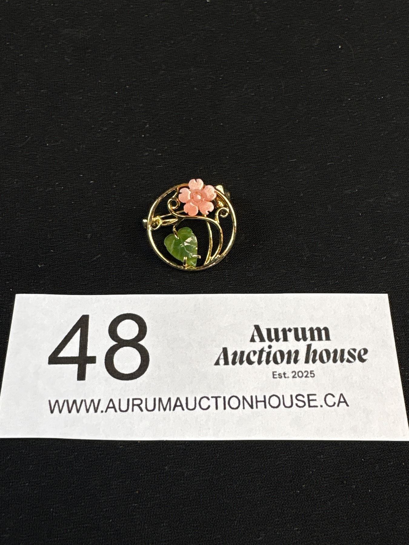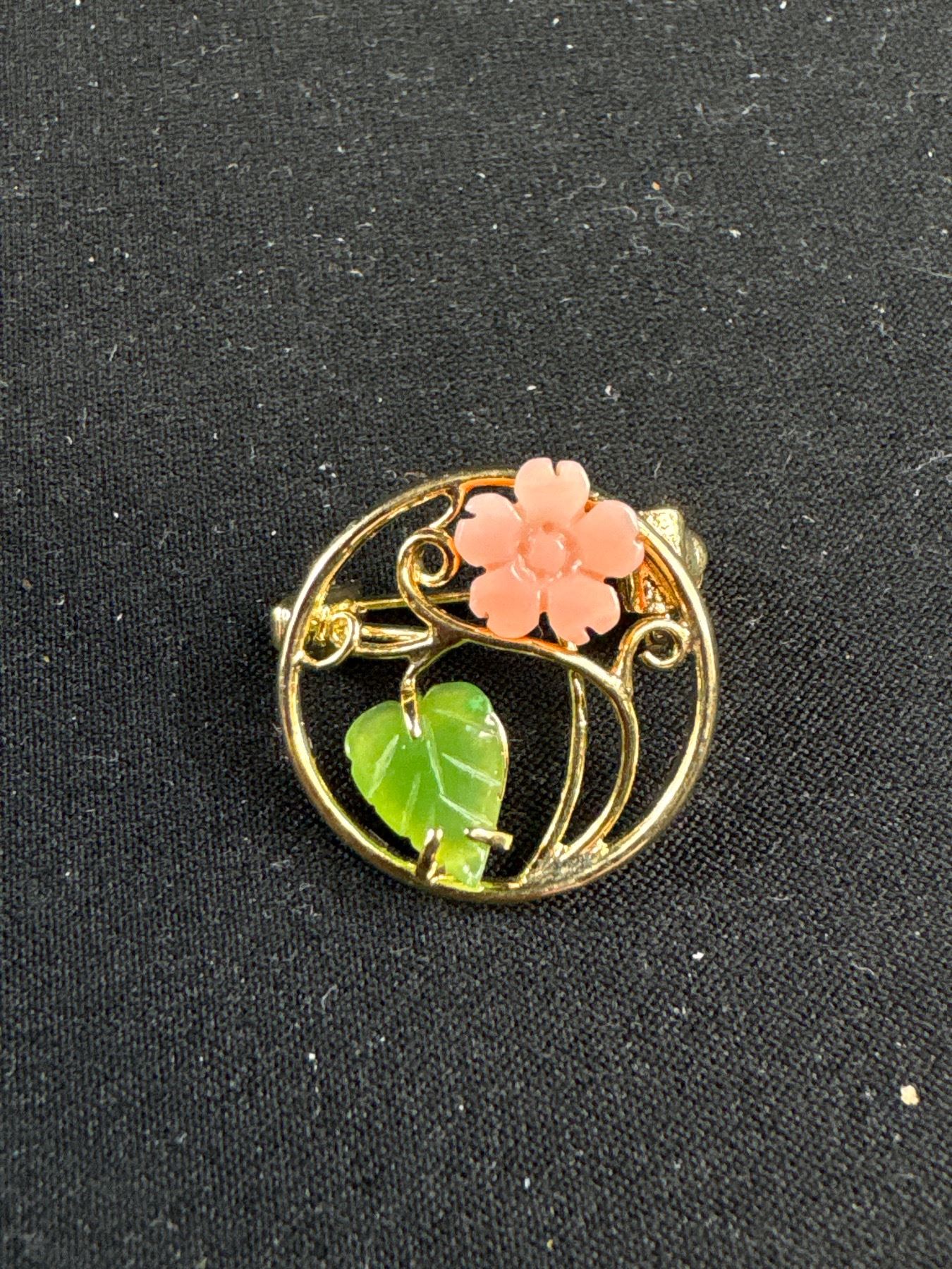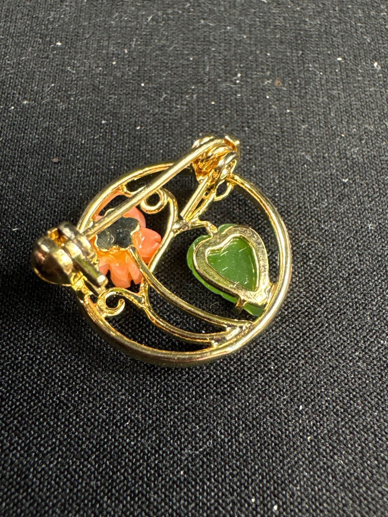 Lot 48 Beautiful Gold w/ Green Jade + Pink Coral Dainty Brooch