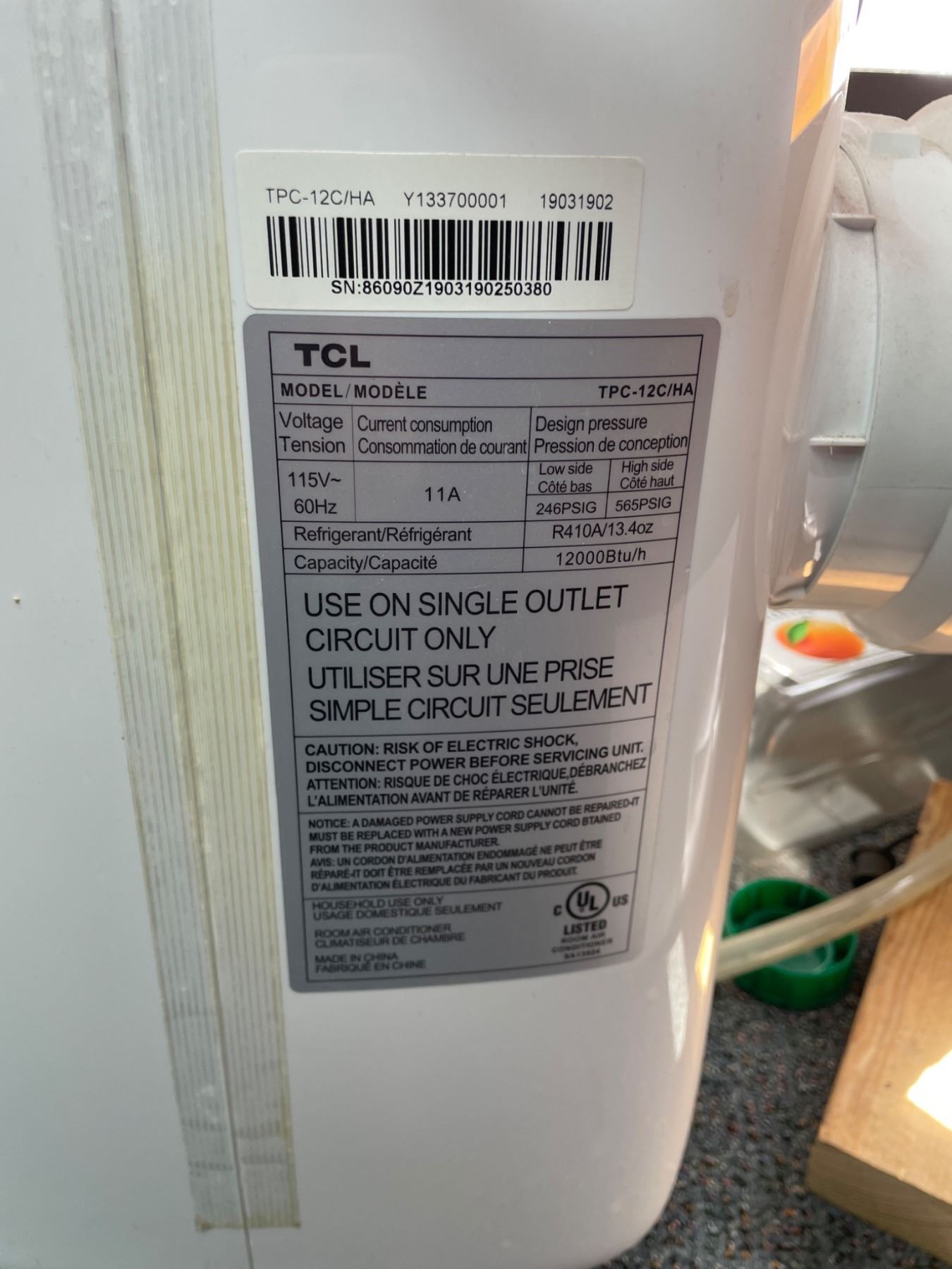 Lot 7033 TCL TPC-12C/HA Portable Air Conditioner 115V, 12000 BTU