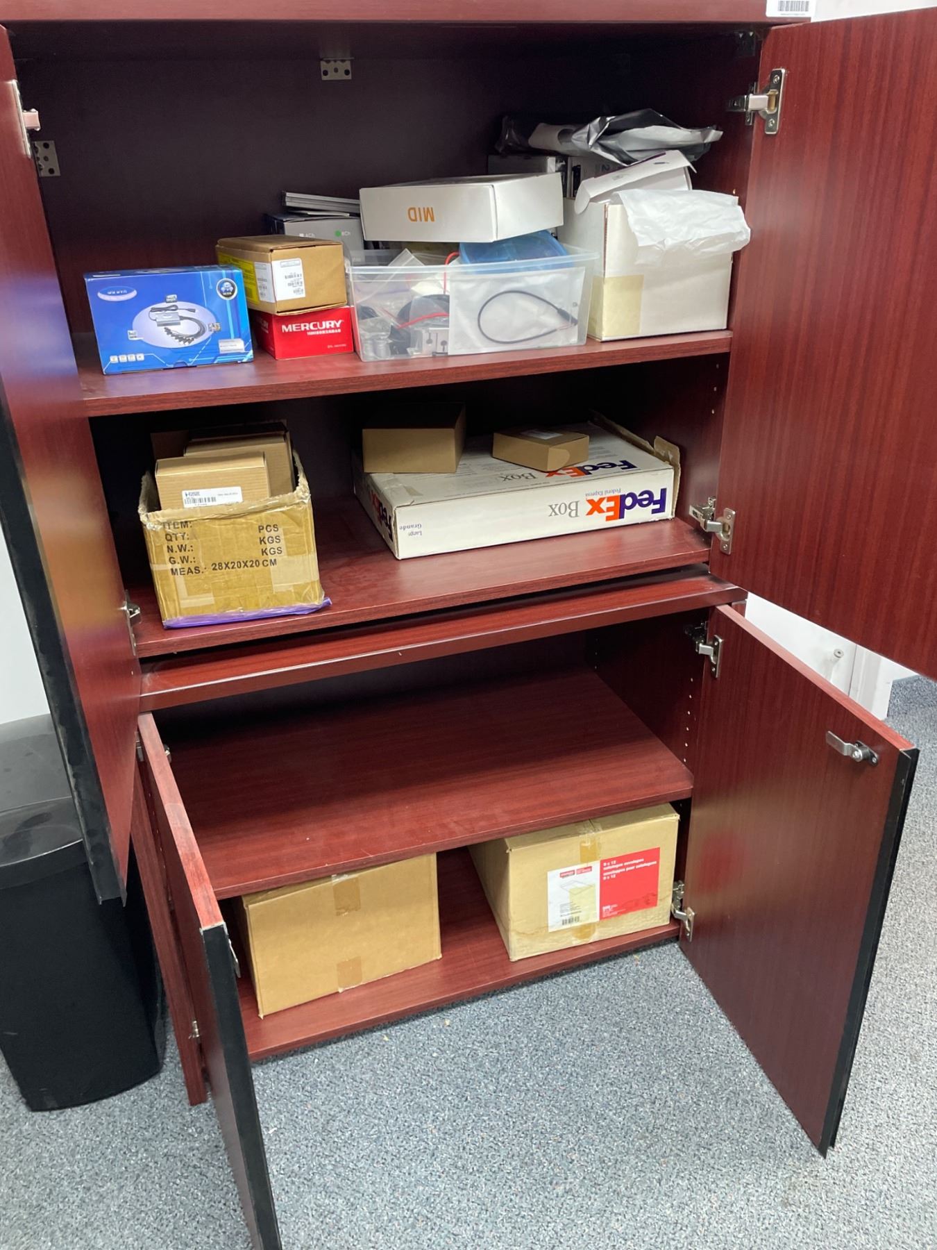36inx20inx57-1/2in Wooden Storage Cabinet With Contents
