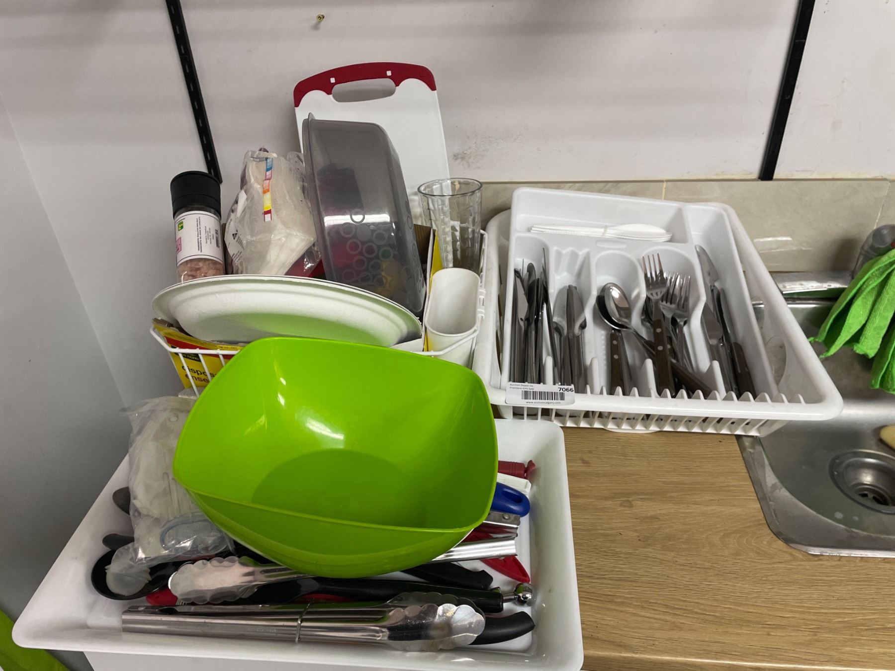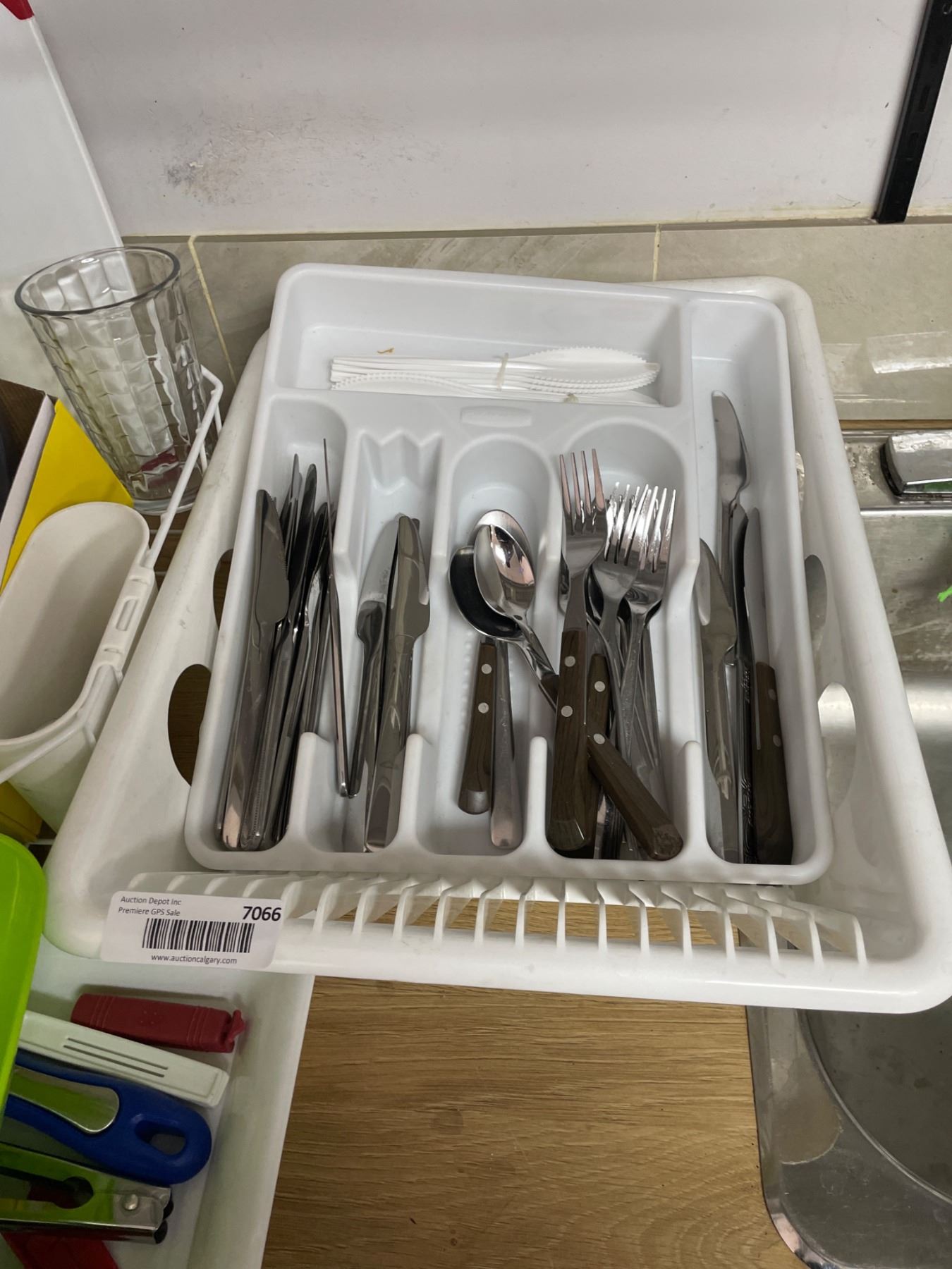Lot 7066 Lot of Assorted Kitchen Items Including Cutlery, Bowls, and Dish Rack