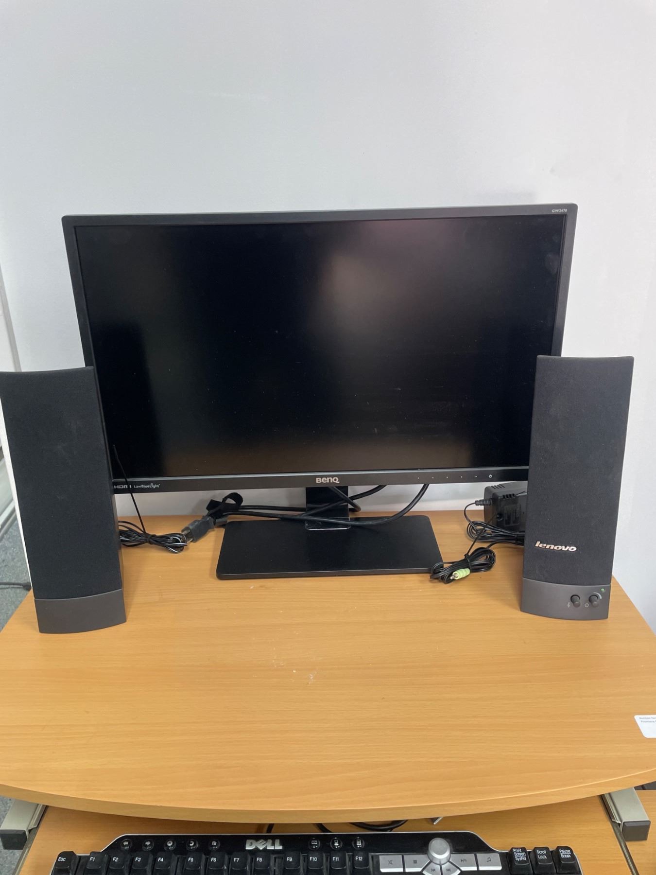 Complete Desktop Computer Setup with Desk, Monitor, Speakers, Keyboard, and Tower