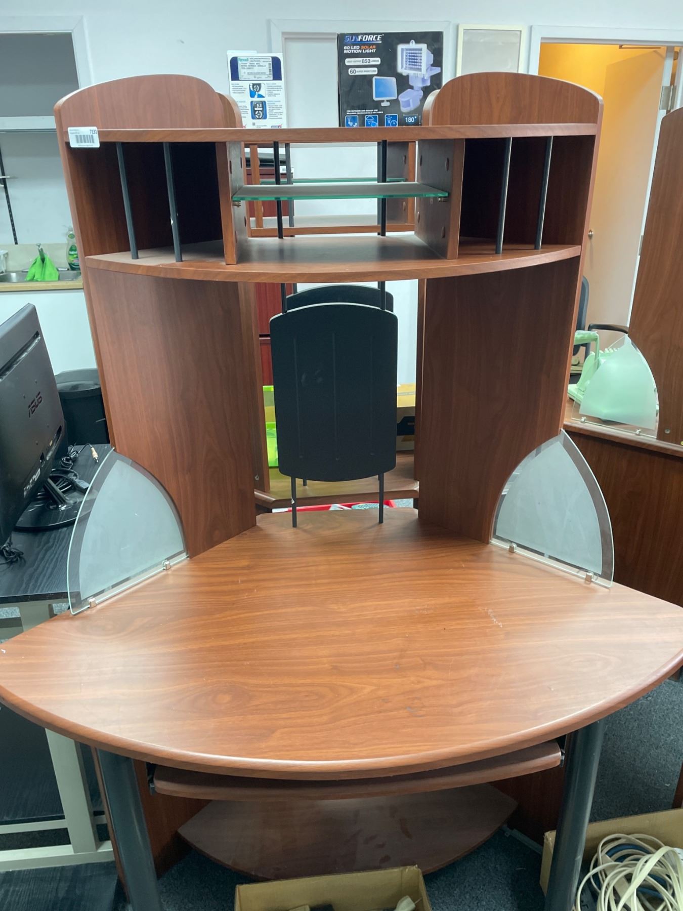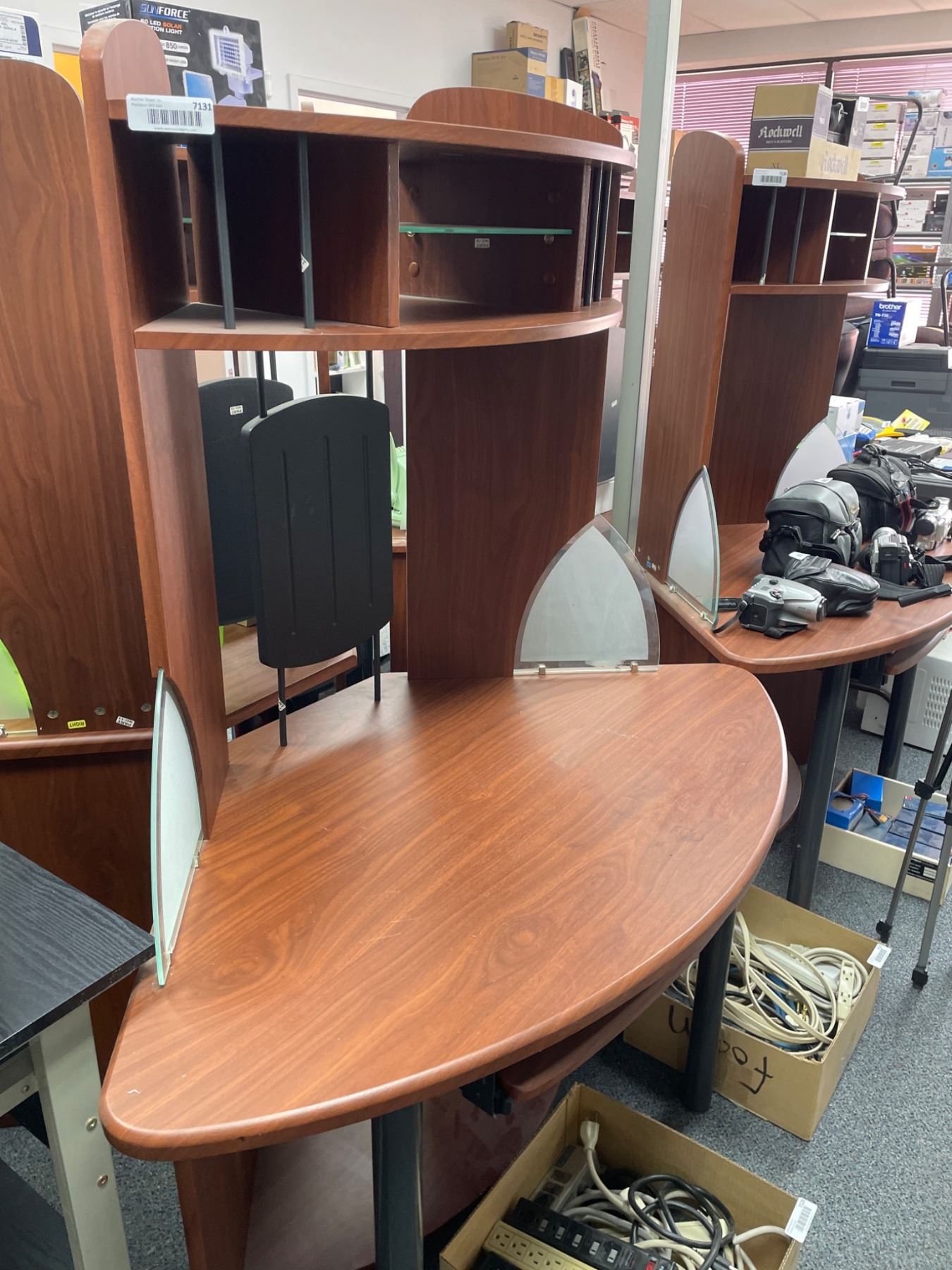 Lot 7131 48in Corner Wood Computer Desk With Shelving and Frosted Panels