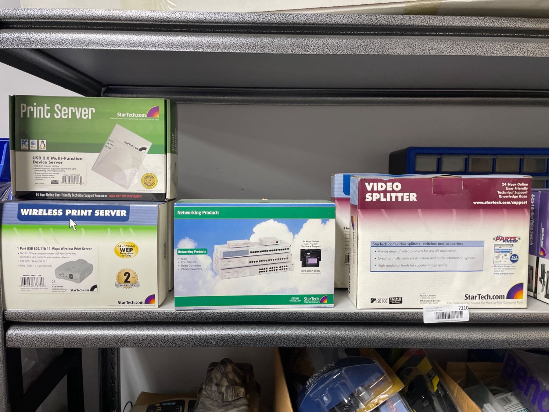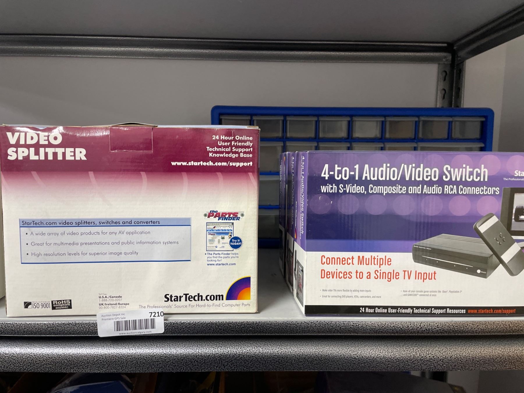 Lot 7210 Lot of Assorted Networking and Audio/Video Equipment Including Print Server, Video Splitter, and Sto
