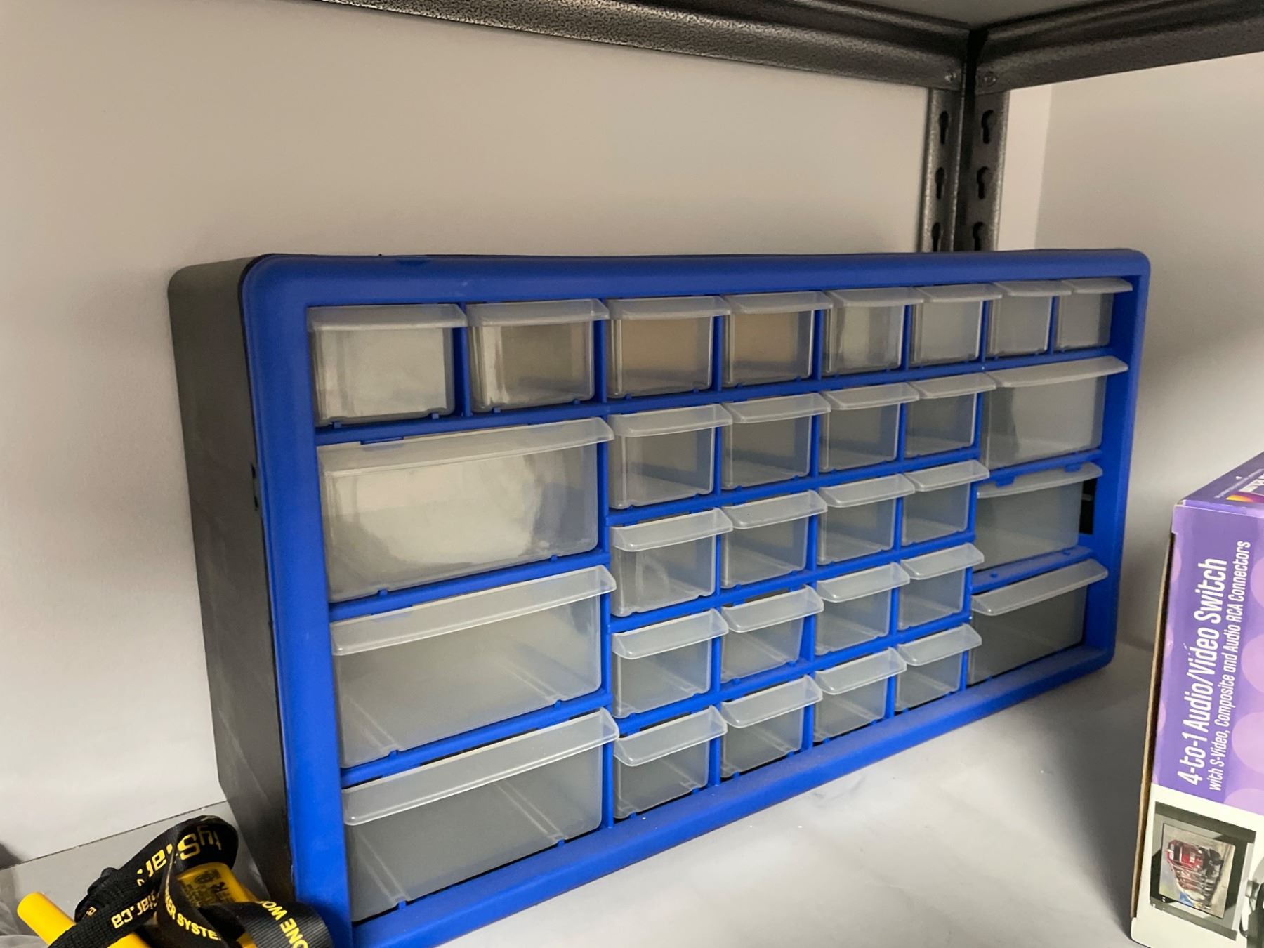 Lot of Assorted Networking and Audio/Video Equipment Including Print Server, Video Splitter, and Storage Organizer