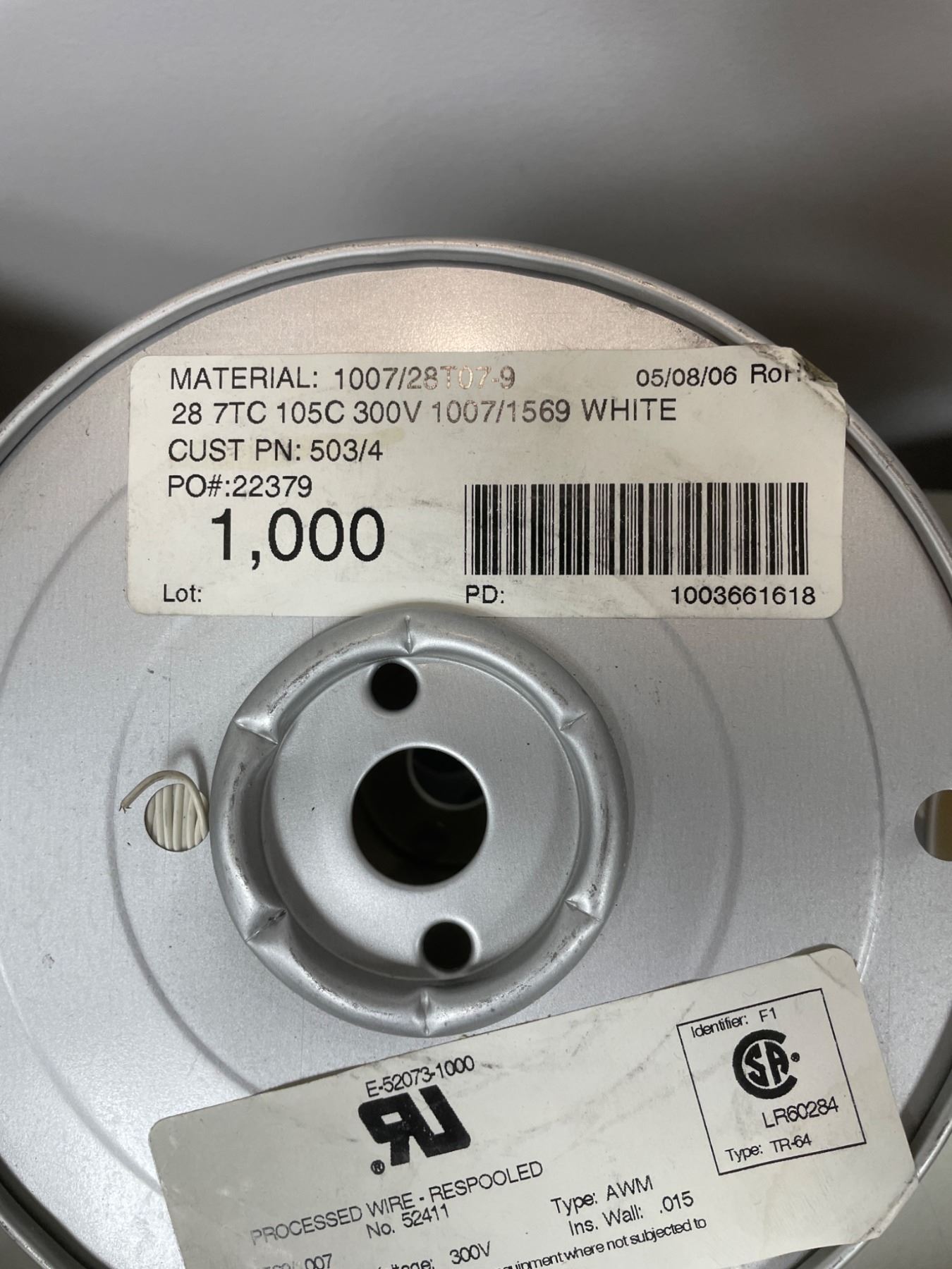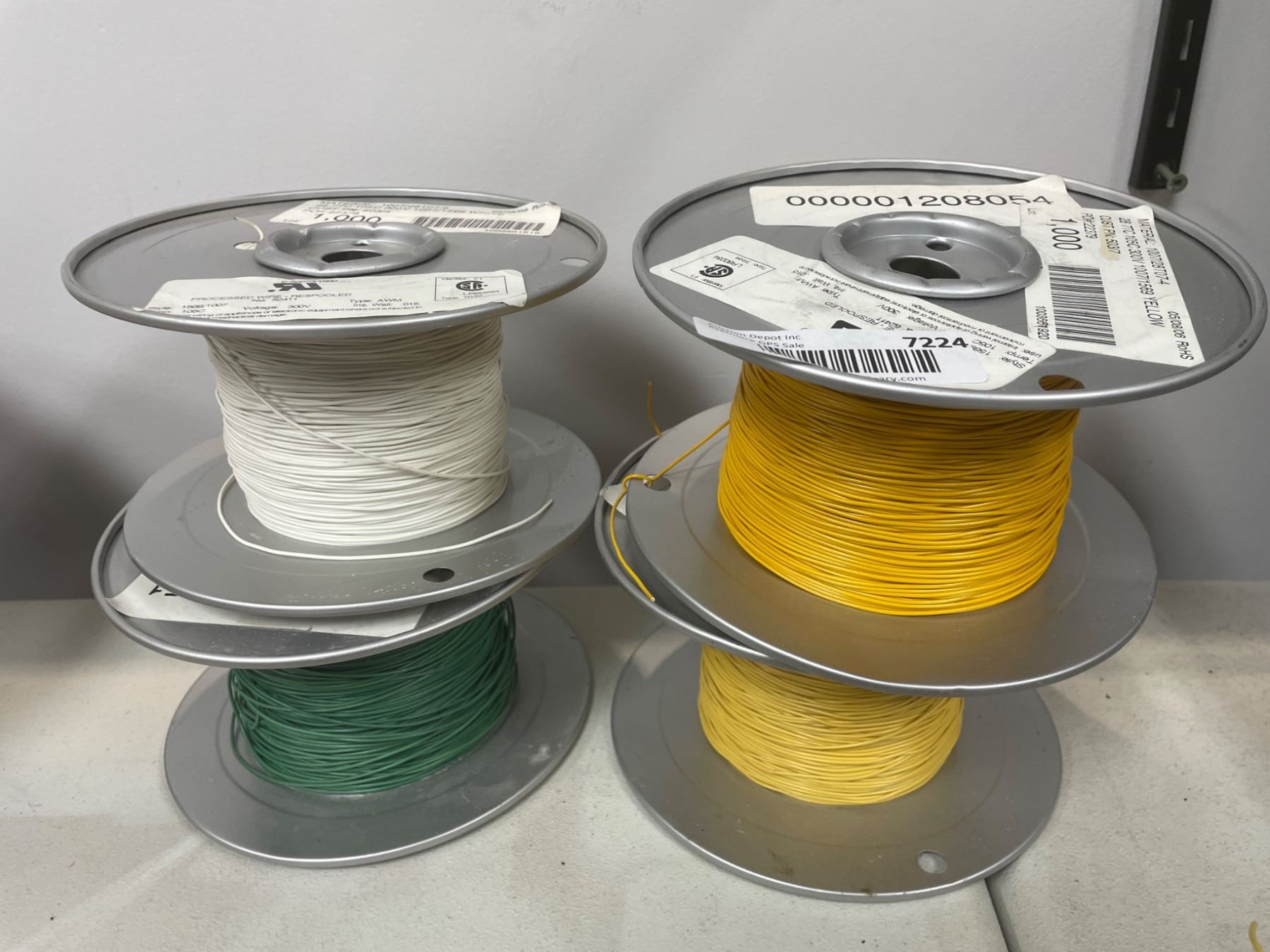 Lot 7224 Lot of 4 Spools of Wire 28 T/C White, Green, and Yellow, Type 1007/1569, 300V, 105C