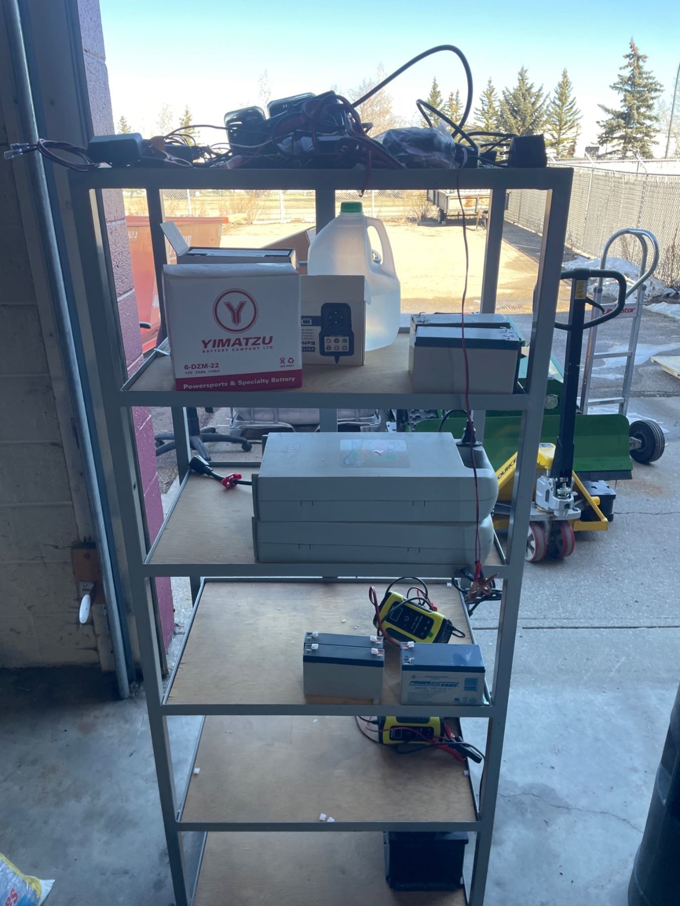 Lot of Battery Testing Equipment With Yimatzu 8-DZM-22 and Power-Sonic PS-1270 F1 Batteries with Rolling Rack