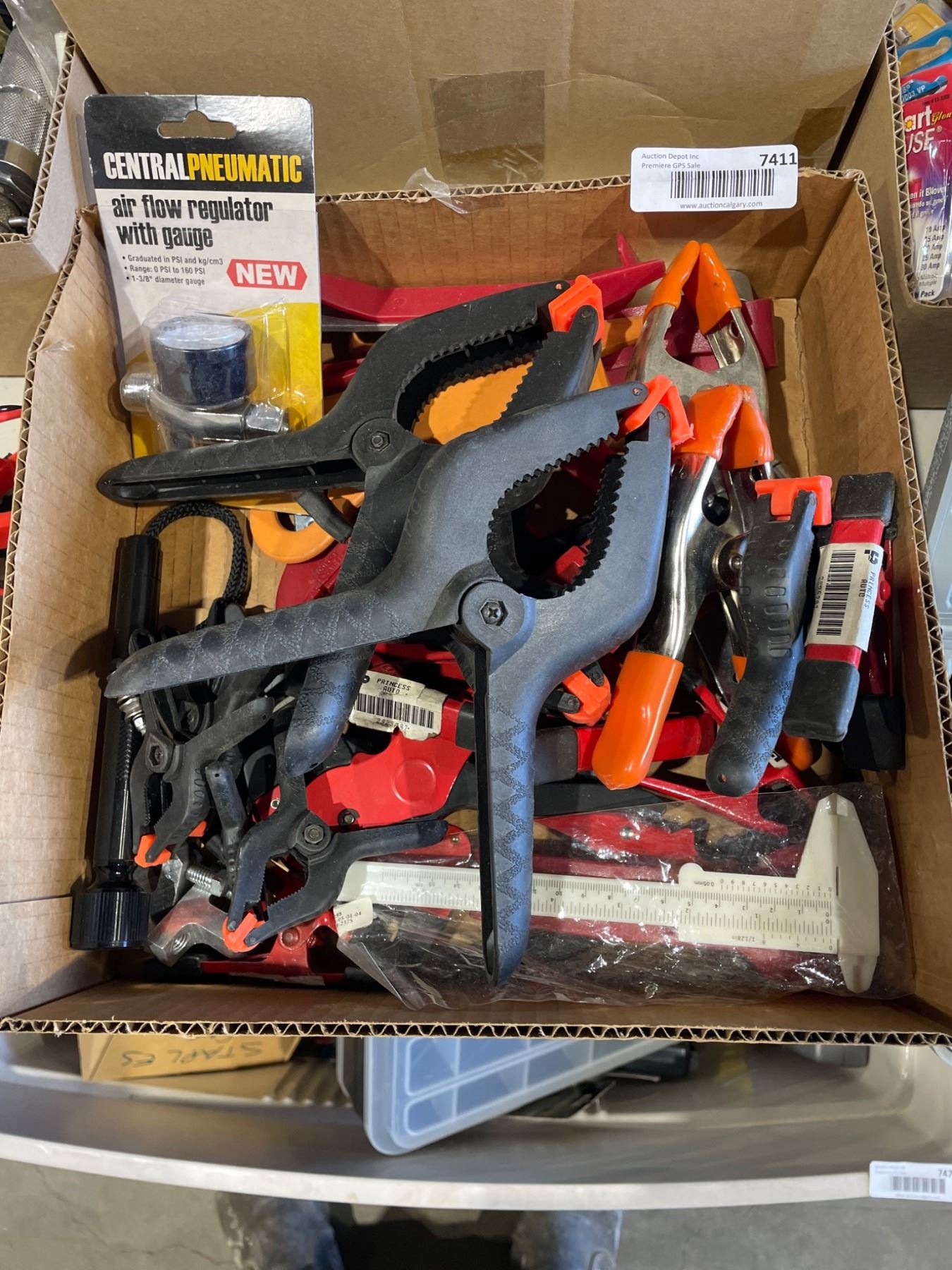 Lot 7411 Lot of Assorted Clamps and Central Pneumatic Air Flow Regulator With Gauge