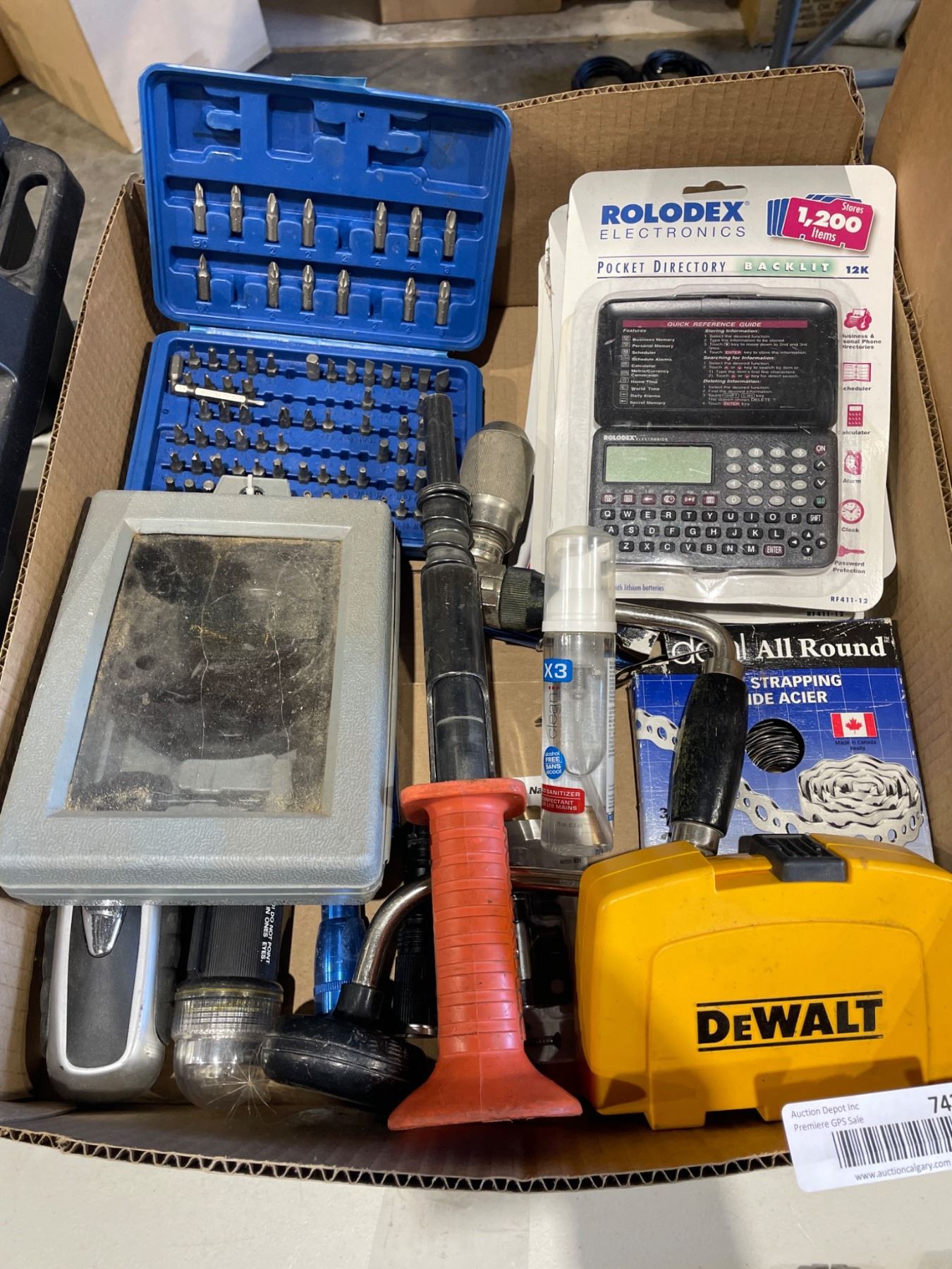 Lot 7421 Lot of Assorted Tools and Office Accessories, Including Dewalt Case and Rolodex