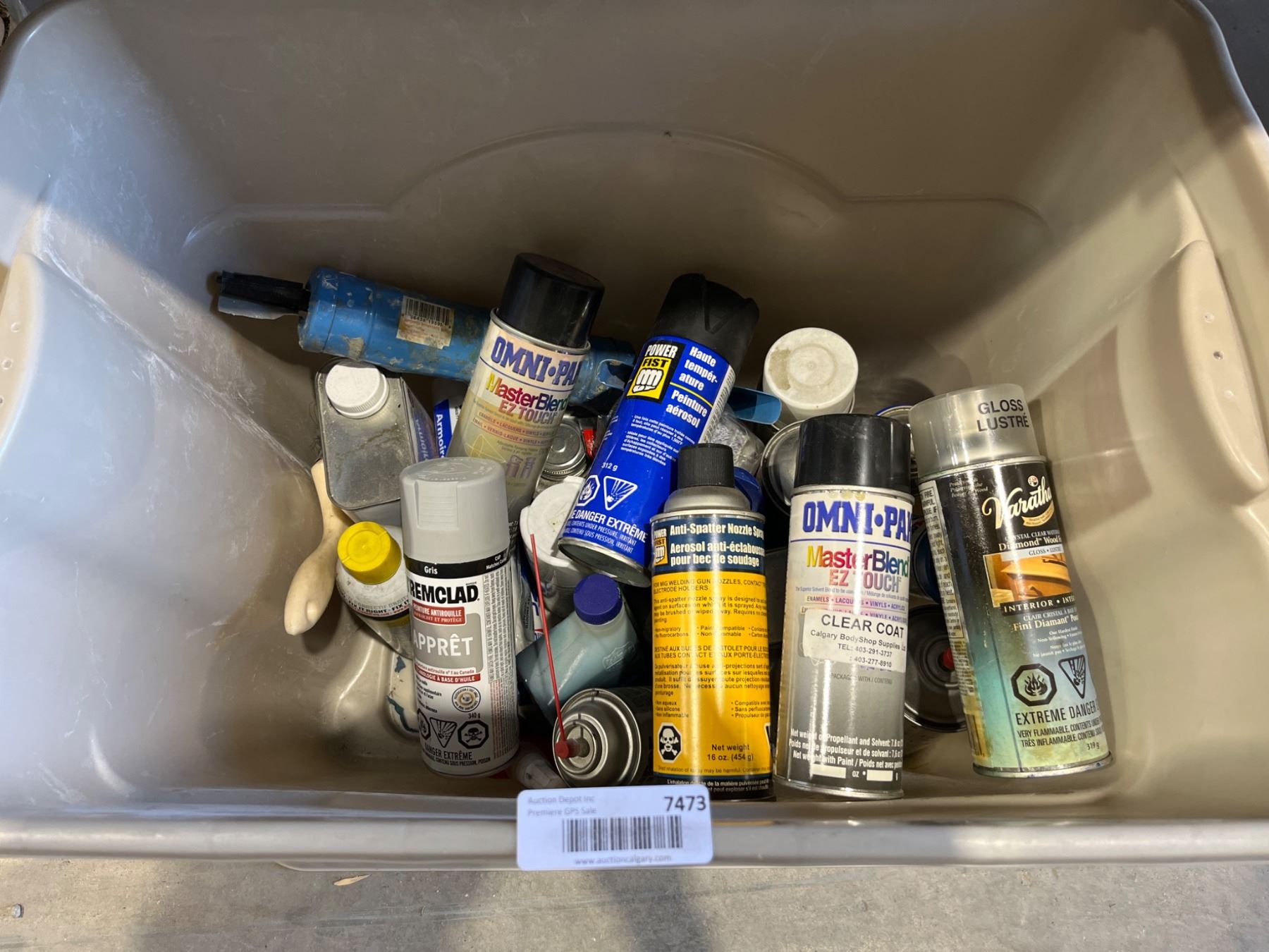 Lot 7473 Storage Bin Containing Assorted Paints, Sprays, and Chemicals