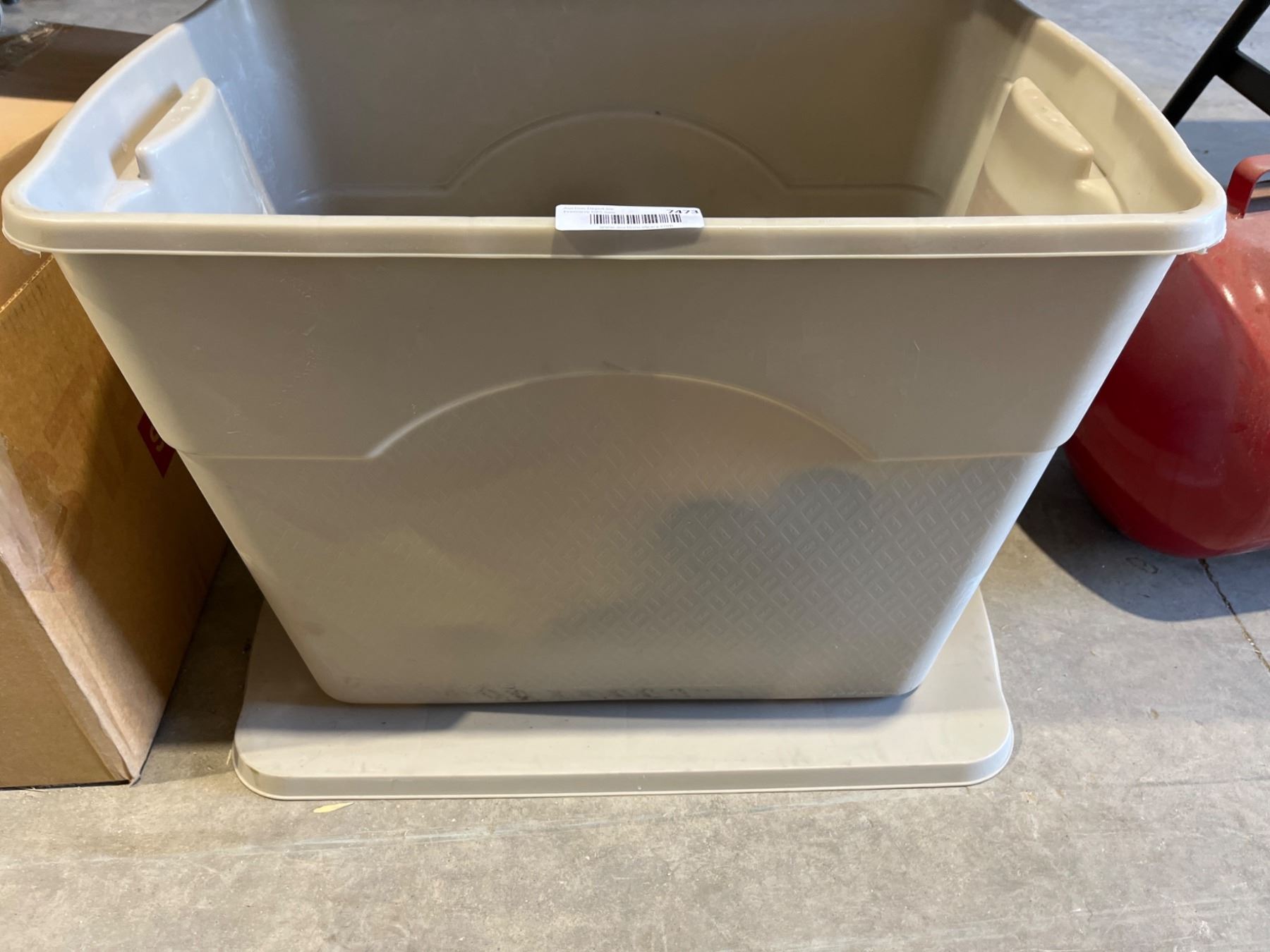 Storage Bin Containing Assorted Paints, Sprays, and Chemicals