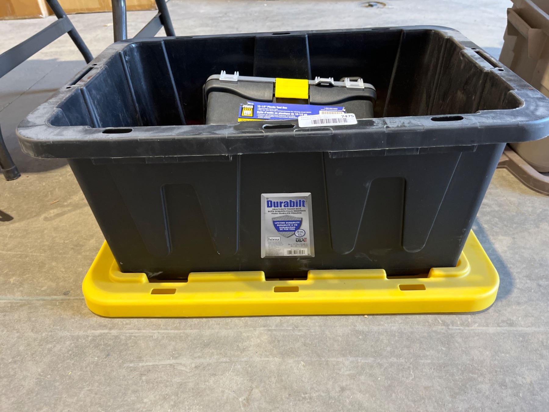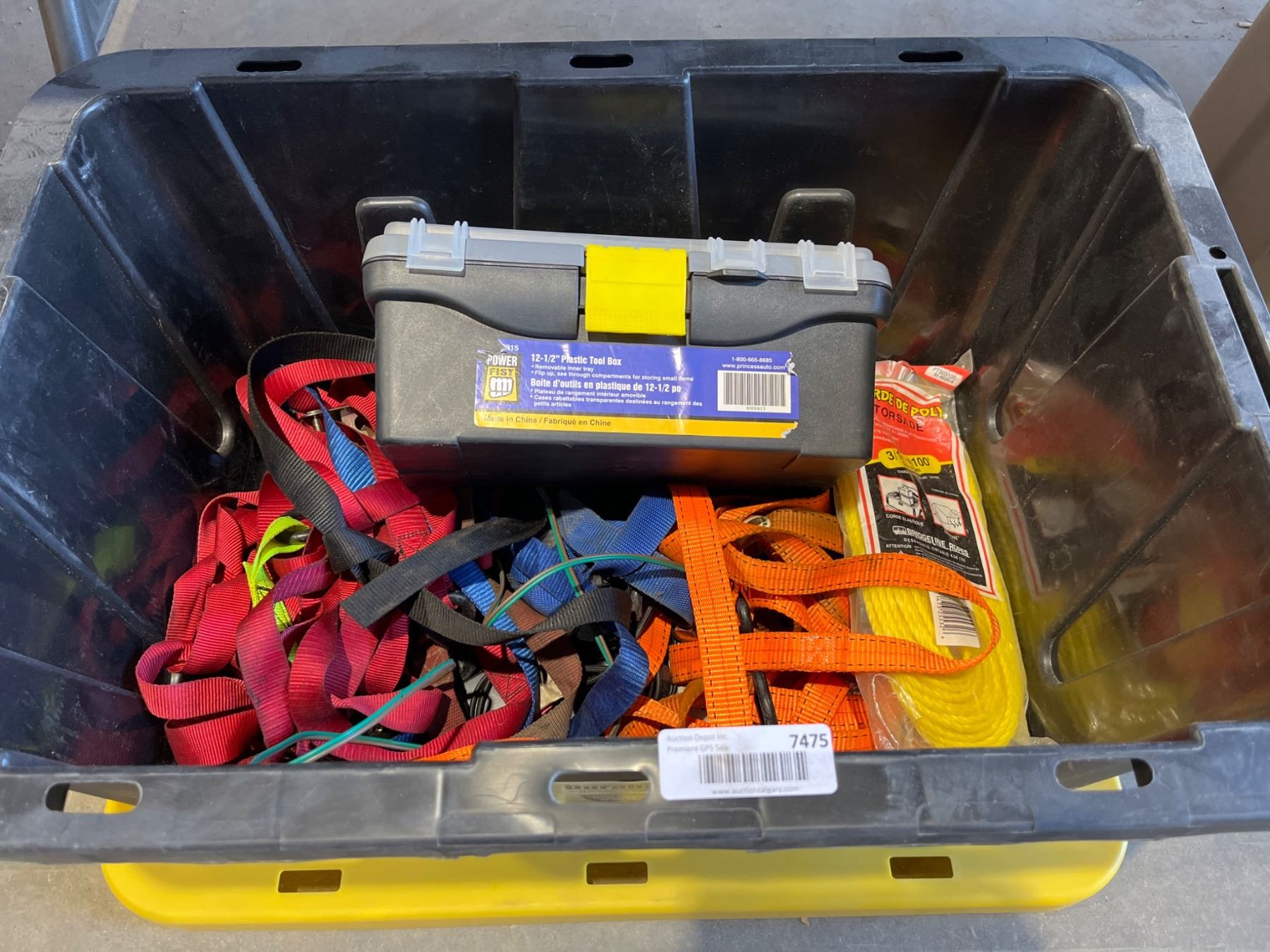 Lot 7475 DuraBuilt Heavy-Duty Storage Bin with Tool Case and Various Tie-Down Straps