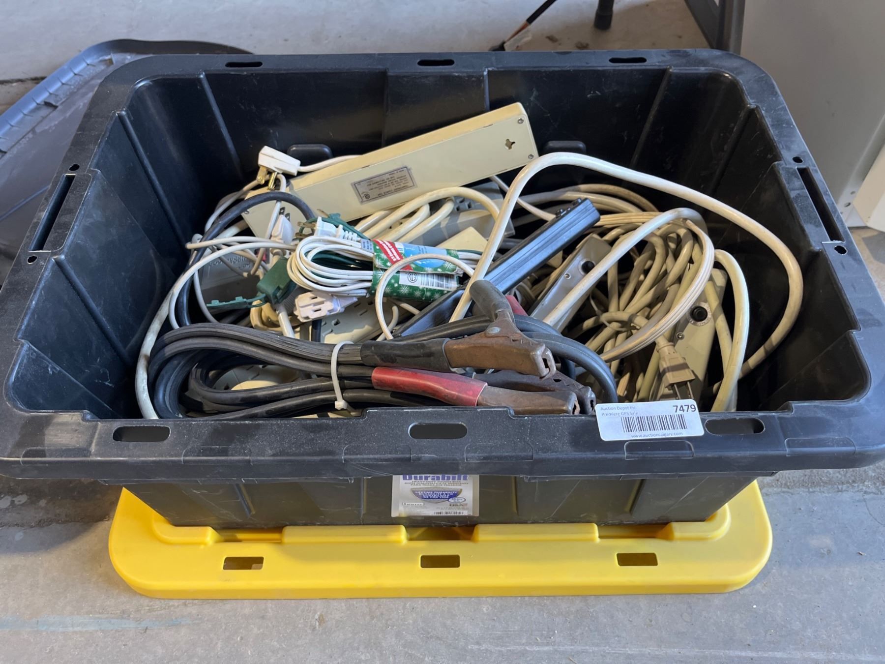 Lot 7479 Durabilt Bin with Electrical Cables, Power Strips, and Connectors