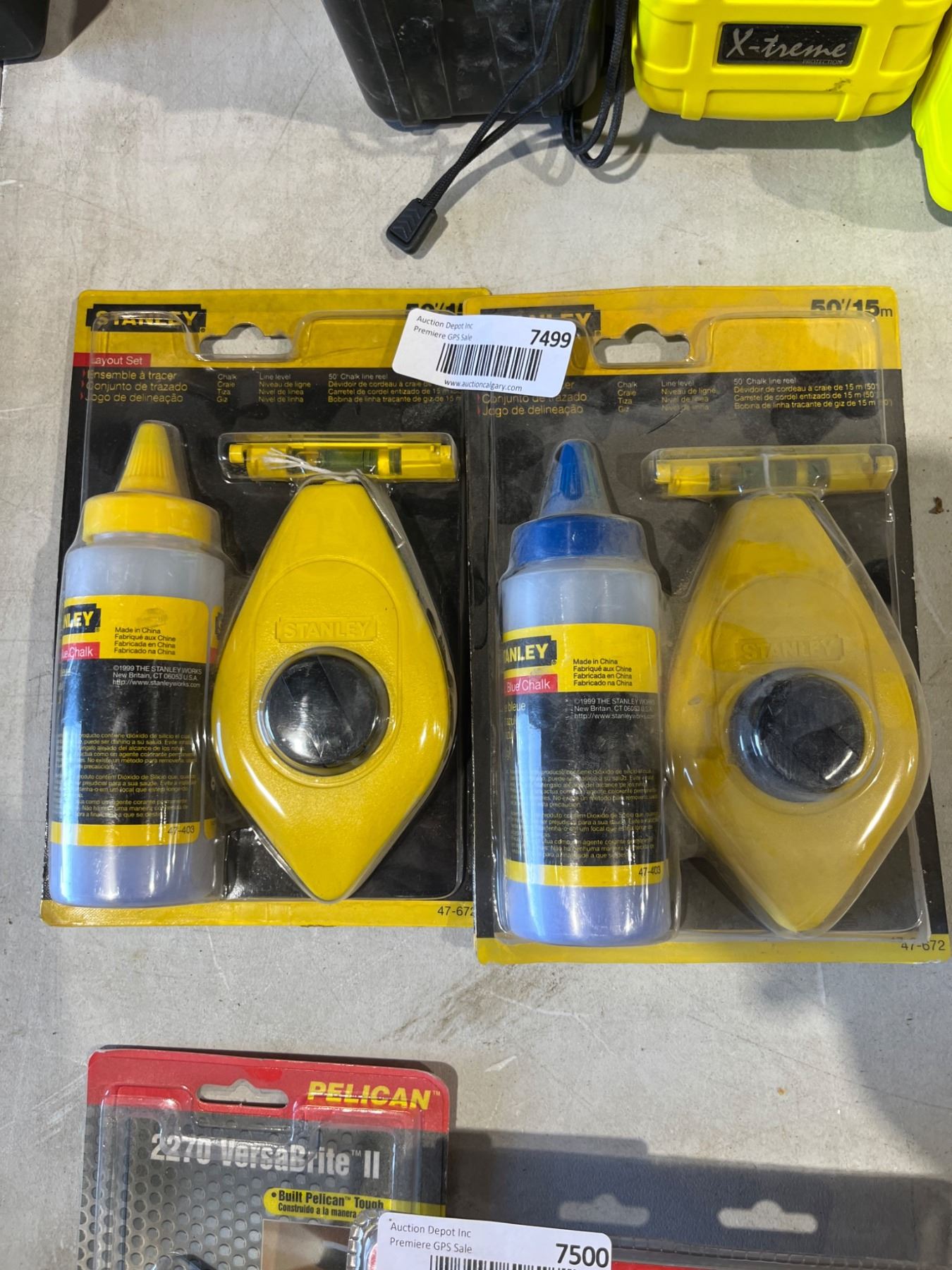 Lot 7499 Lot of 2 Stanley Chalk Line Sets 47-443 and 47-443B with Blue and Yellow Chalks