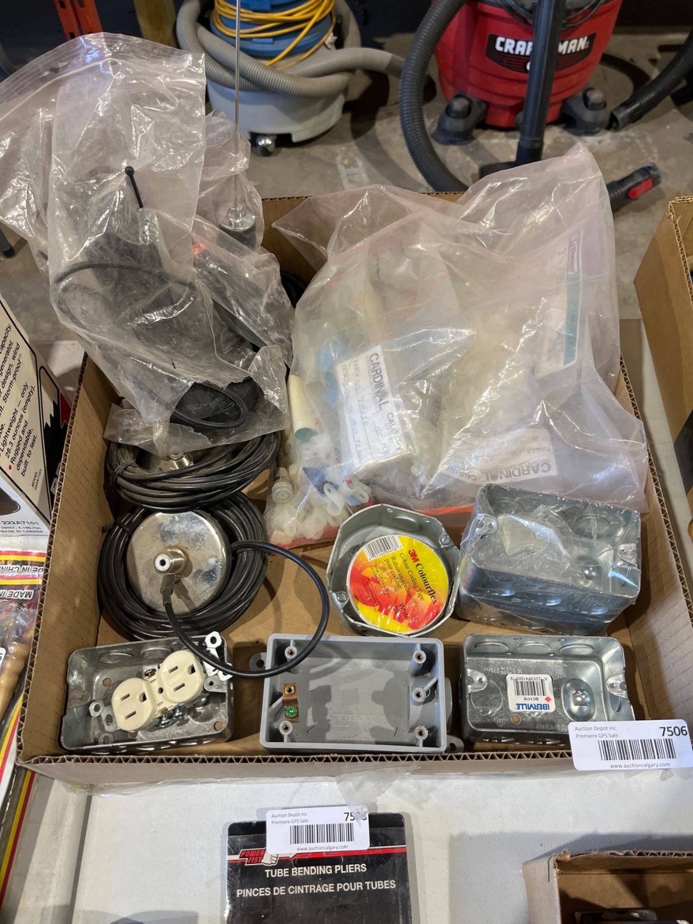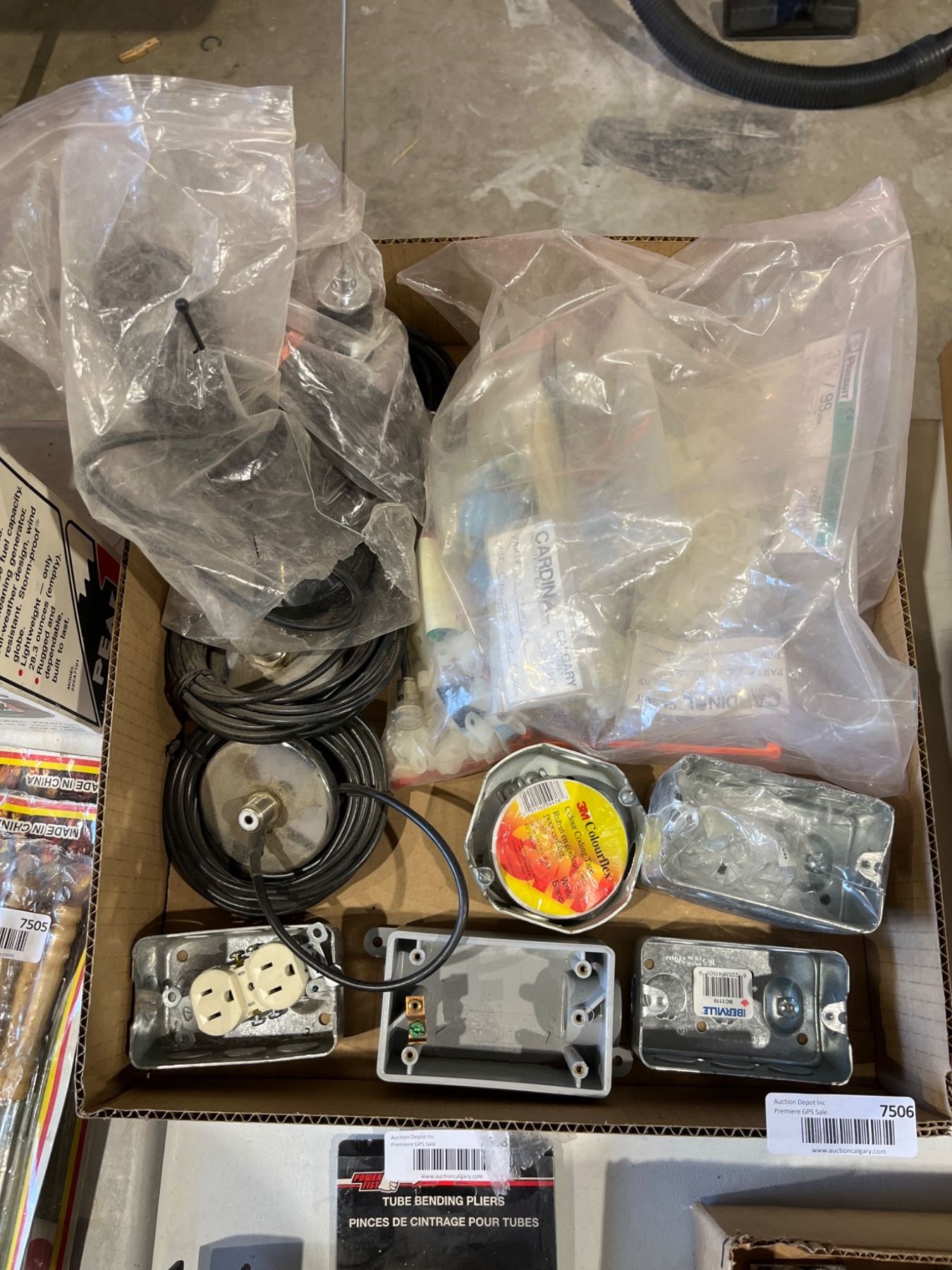 Lot 7506 Lot of Assorted Electrical Components Including Wiring, Receptacles, and Outlet Boxes