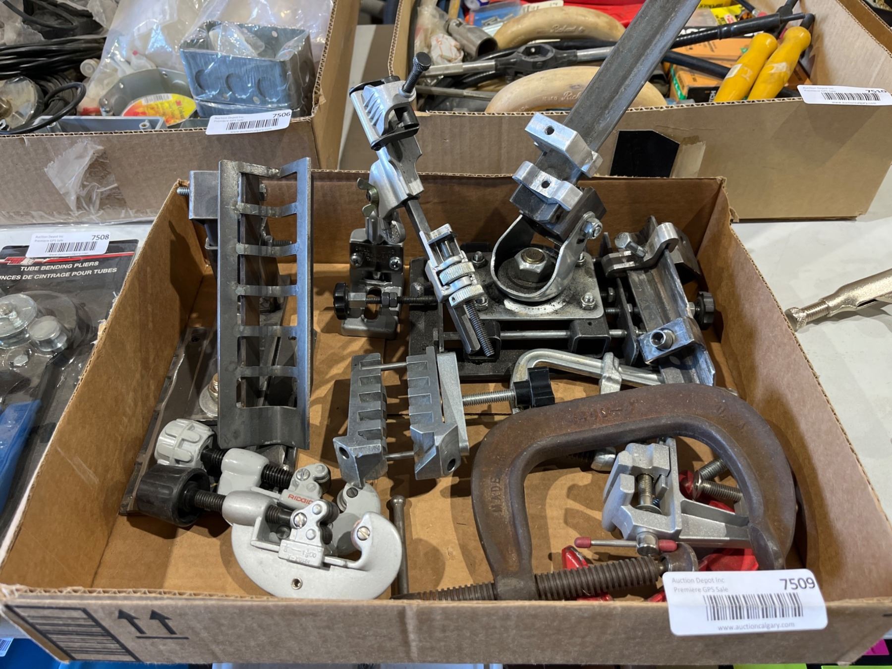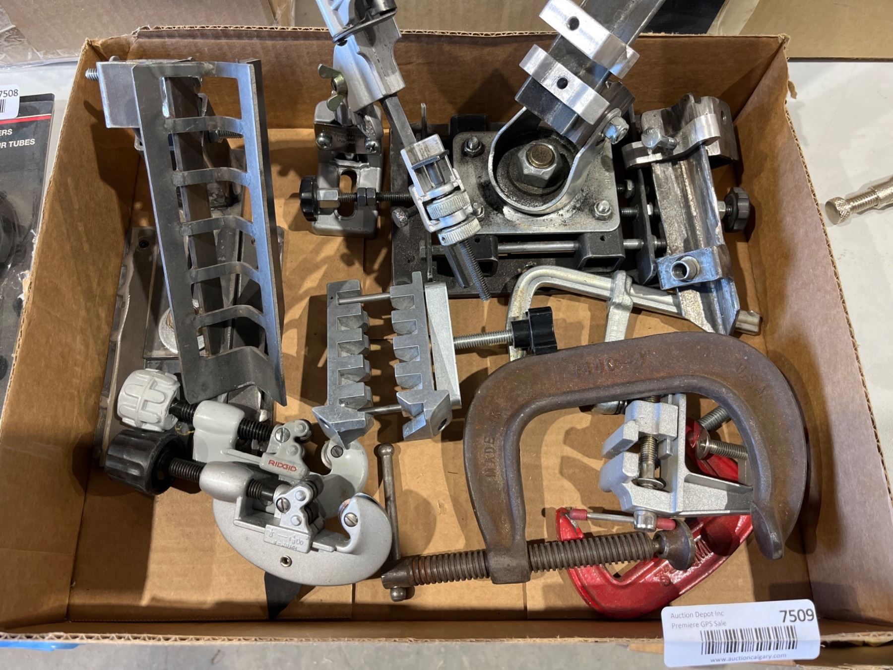 Lot 7509 Lot of Assorted Metalworking Tools Including Pipe Cutter and Clamps