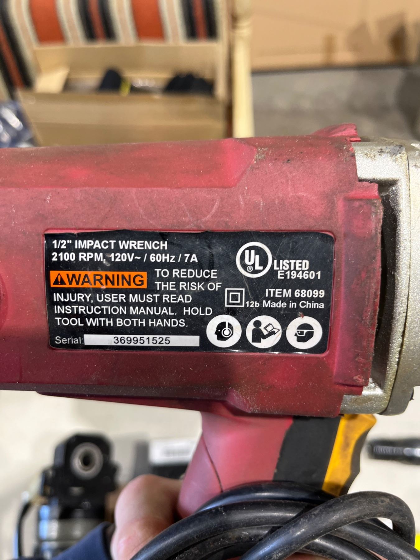 Lot 7547 Chicago Electric 1/2-inch Impact Wrench Model 68099, 2100 RPM, 120V, 60Hz, 7A