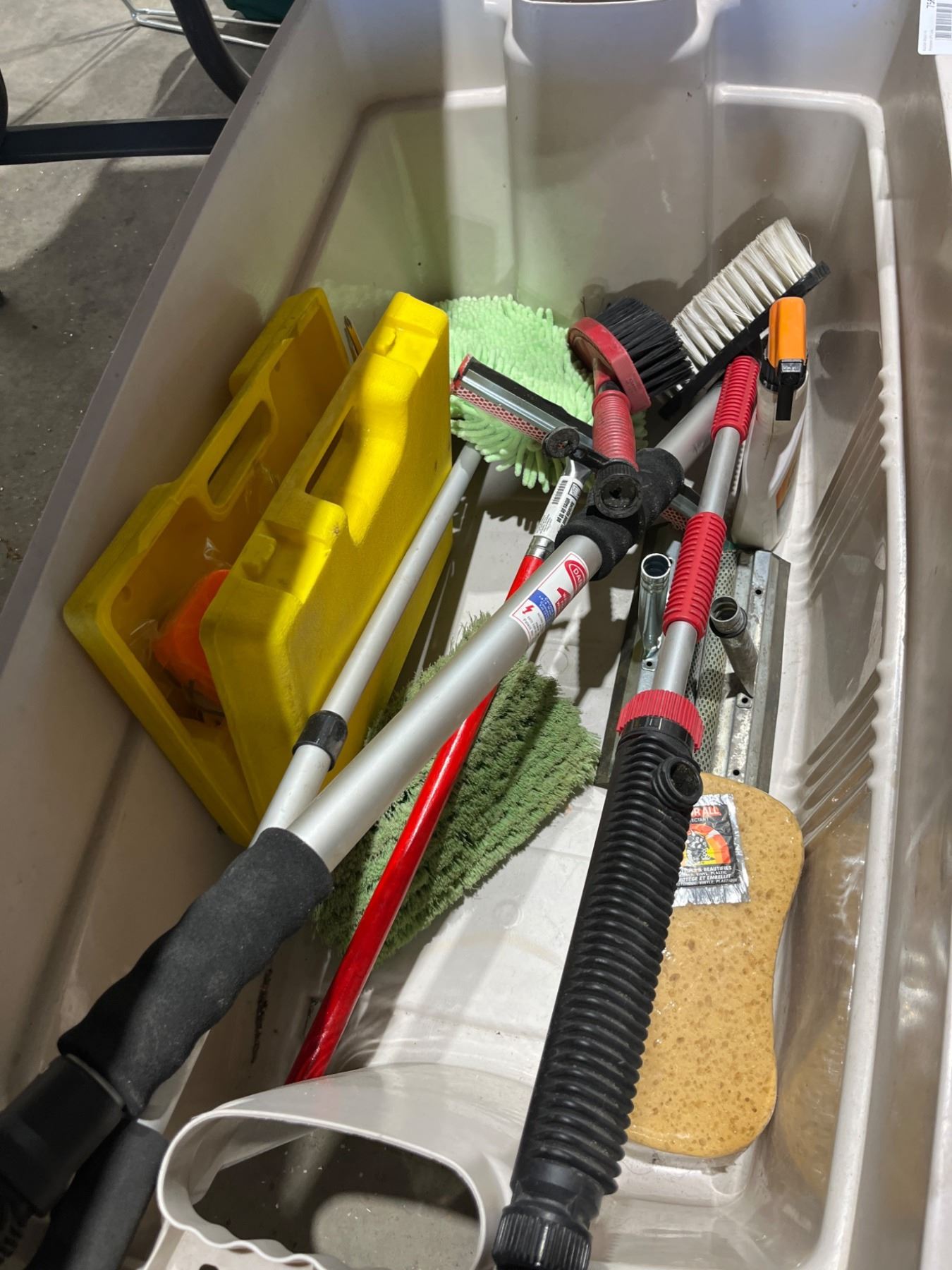 Lot of Assorted Cleaning Tools Including Brushes, Sponges, and Handles