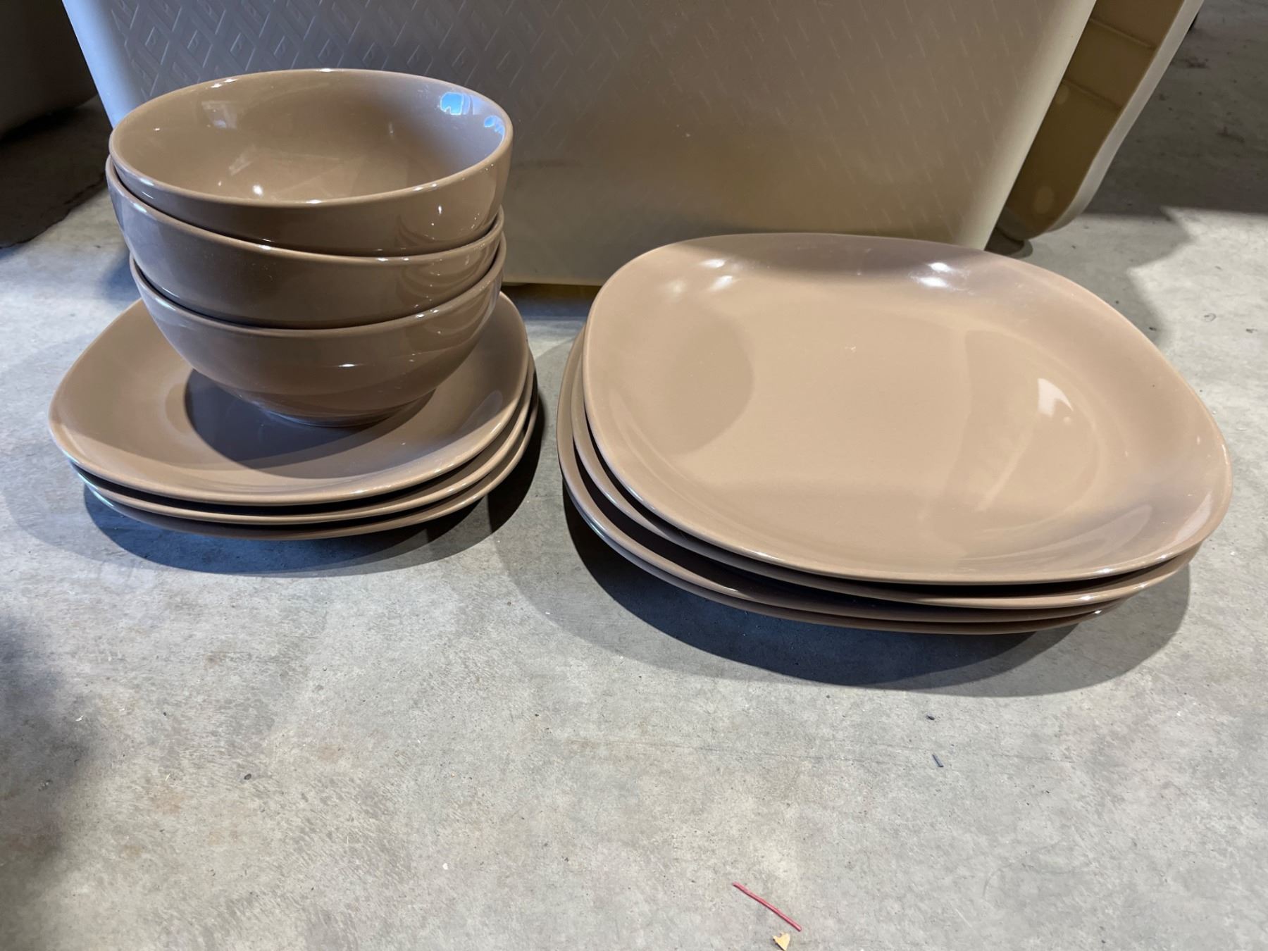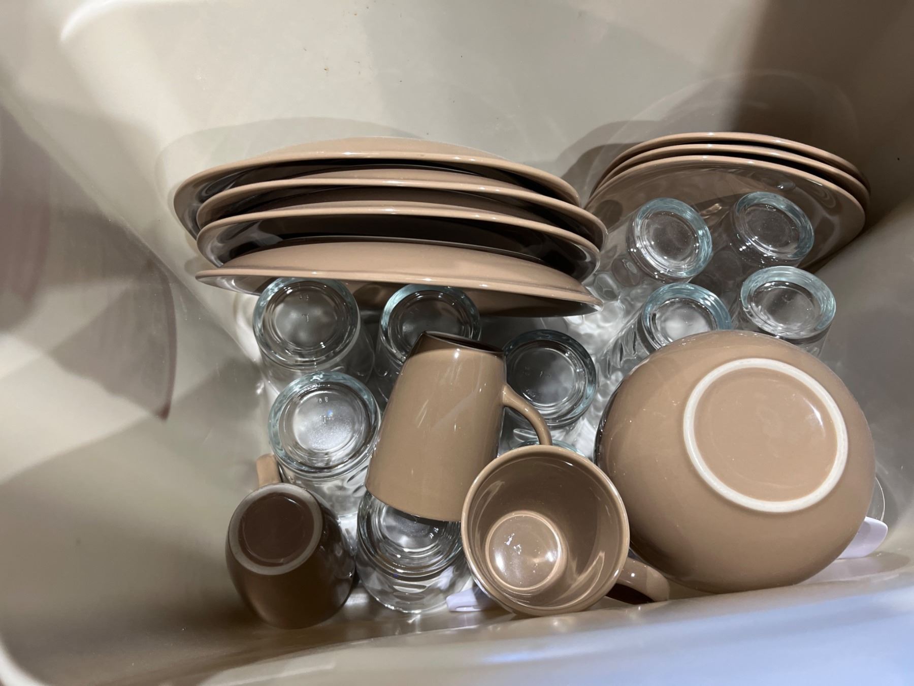 Lot of Assorted Plates, Bowls, Mugs, and Glasses in Beige and Clear Tones